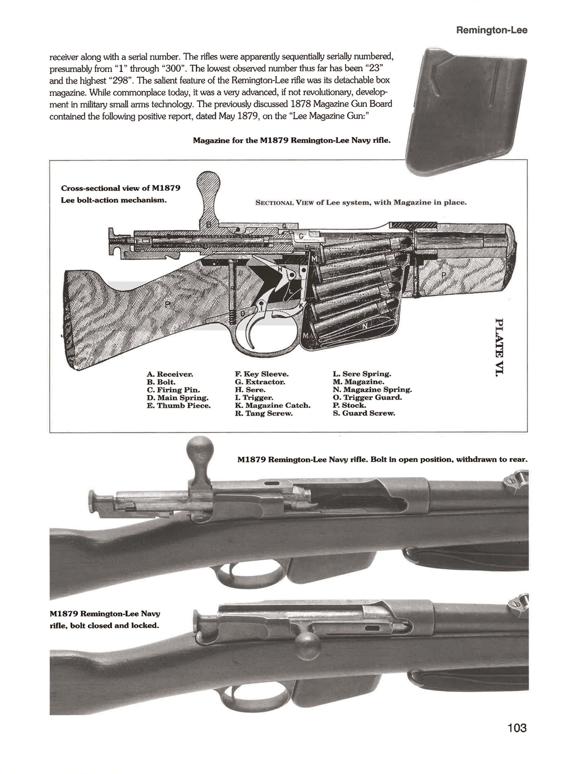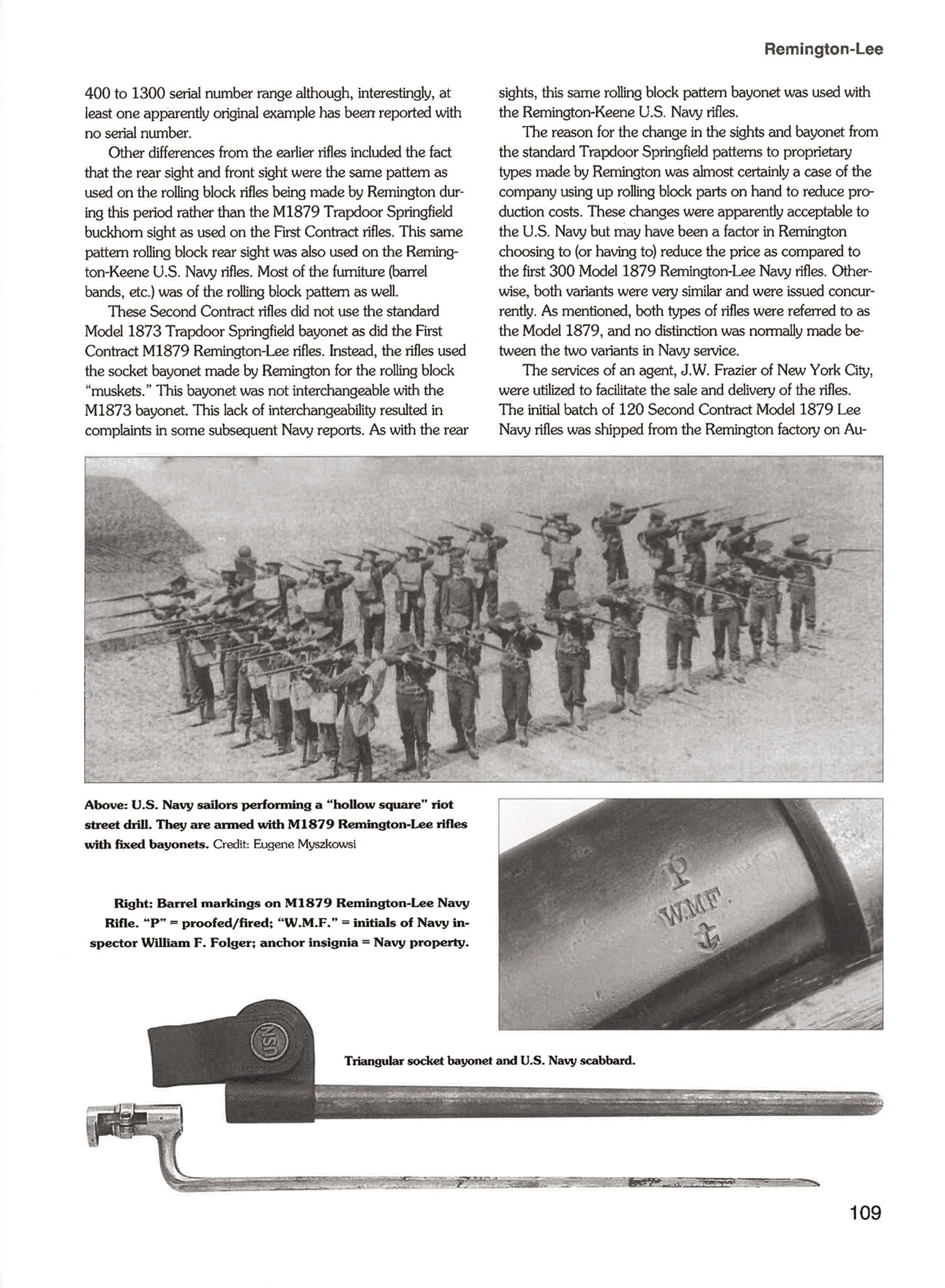After this, the Navy made a second contract for an additional 700 M1879 rifles, which would be serialized in the 400-1000 range, and were all stamped with WMF for Navy inspector William M. Folder. The earliest of these were also still marked on the receiver with "THE LEE ARMS Co.", while later in the second contract they would be marked "E. REMINGTON & SONS, ILION, NY.". This is detailed in U.S. MILITARY BOLT ACTION RIFLES by Bruce N. Canfield, pages 102-109, some of which are shown in the pictures, but are not included.