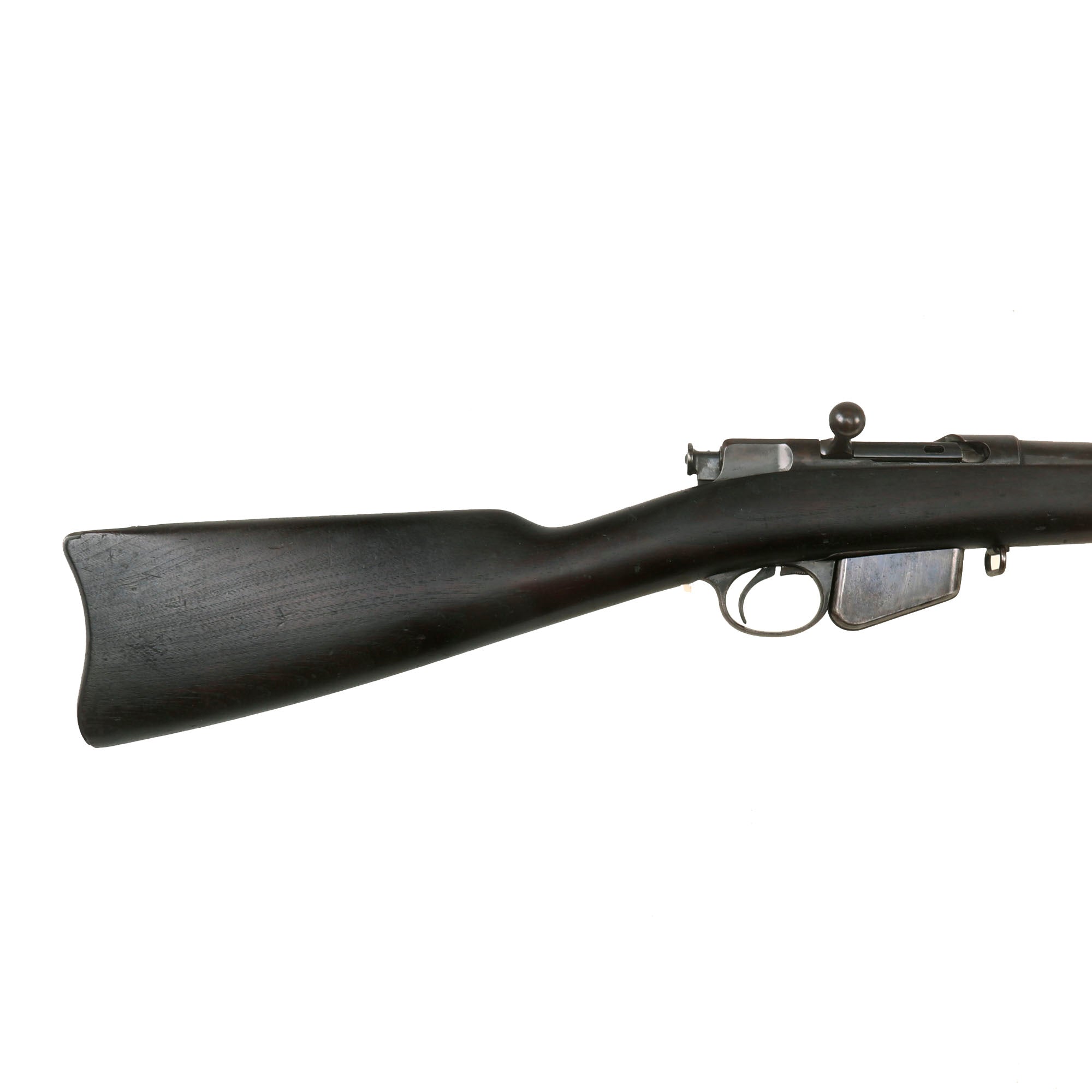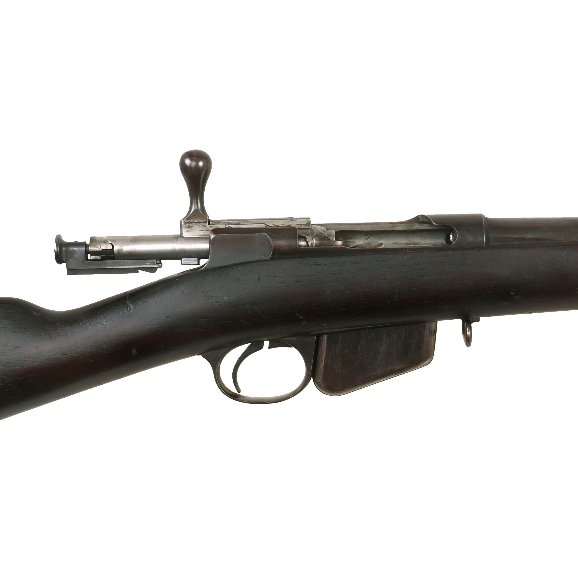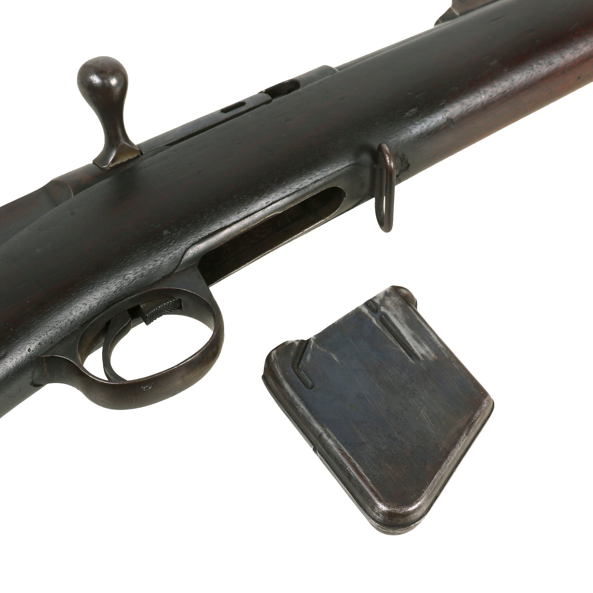 The rifle cycles correctly, with a strong dry fire, though we have no way to know if the magazine still feeds. The first pattern magazine definitely does detach from the bottom of the action when the release in front of the trigger is pulled. It is in very good shape with a strong follower spring, and would be hard to improve upon. We checked the bore, and it is in excellent condition, showing clear rifling with a bright finish. There is just a bit of wear to the lands, and evidence of past fouling in the grooves, but overall it is exceptional for a black powder gun of the time.