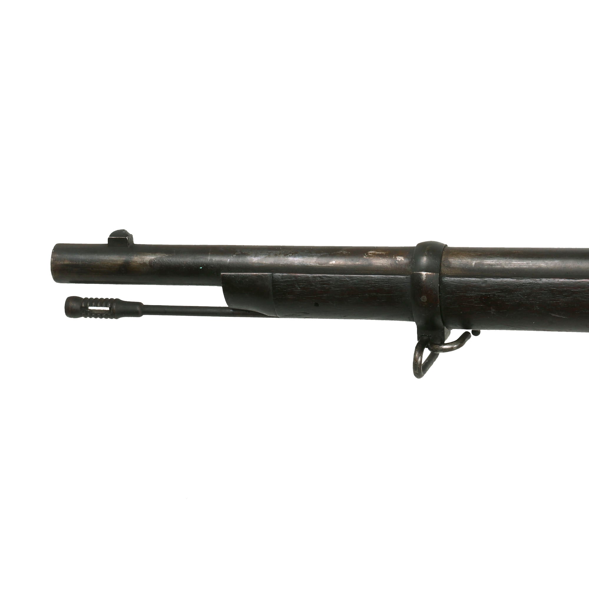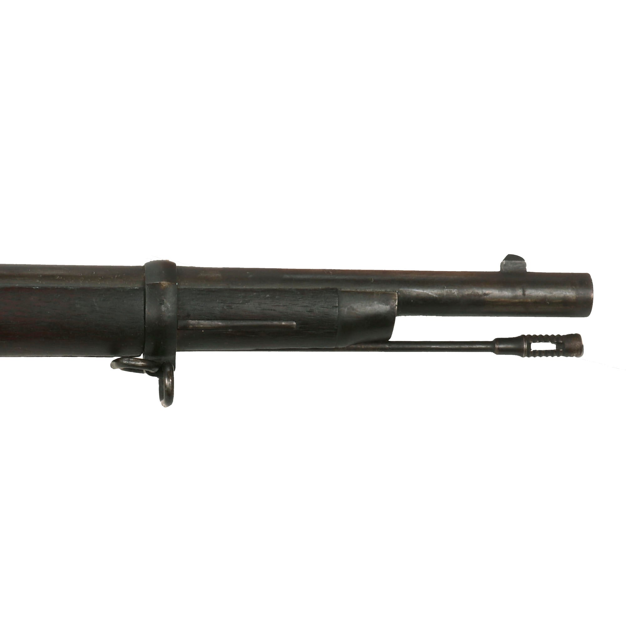 The rifle appears totally complete including its original cleaning rod, and does not look to have been messed with or modified during its long life. The metalwork has had the original bluing wear a bit in some areas to a nice gray patina, and there is no major oxidation or pitting present. Both sling swivels are intact and moveable, and the stacking swivel is present as well. The cleaning rod is in great shape, with intact threads, and still screws easily into place. The stock is in fantastic condition, displaying a lovely matured dark red brown color, with no major damage or evidence of major restoration in the past.
