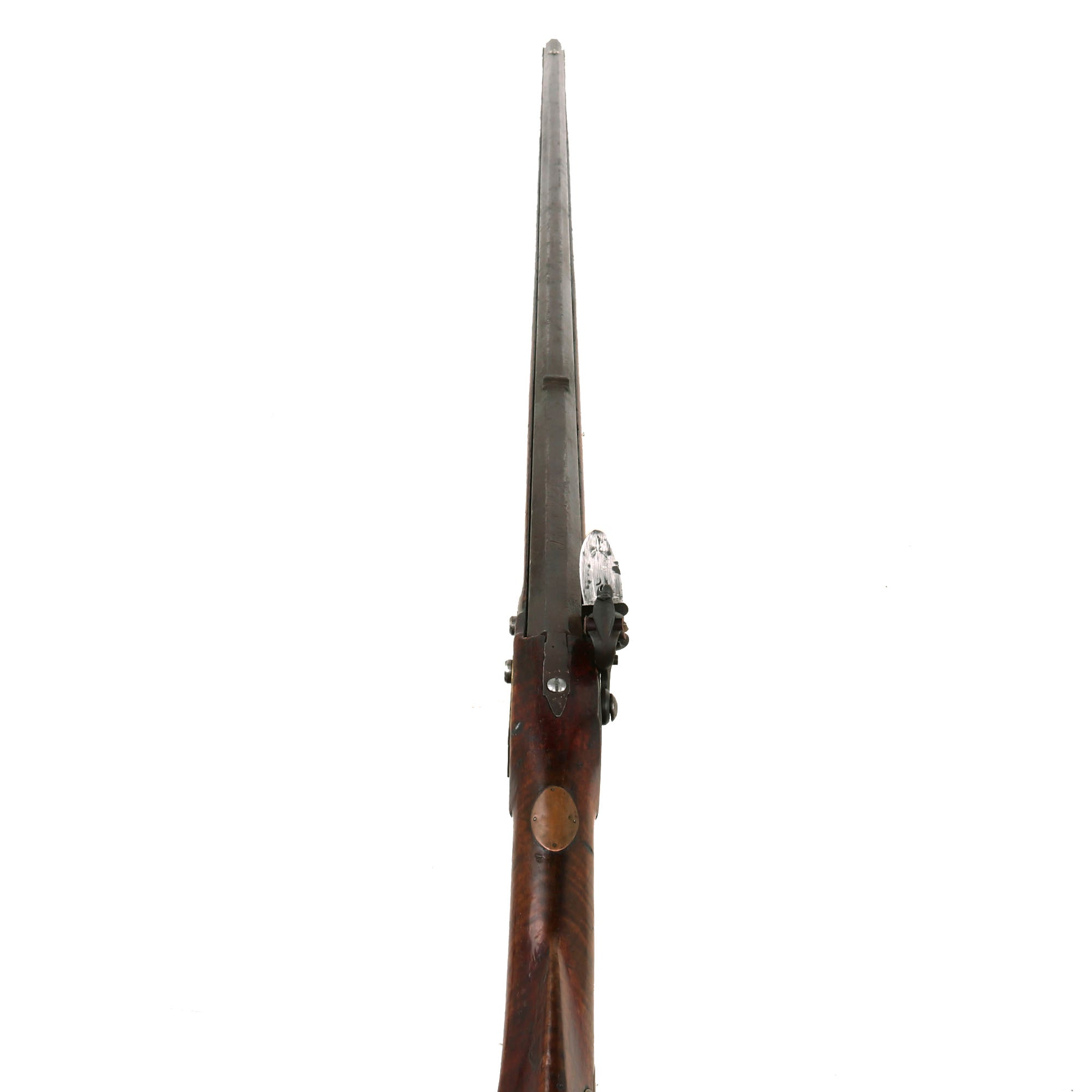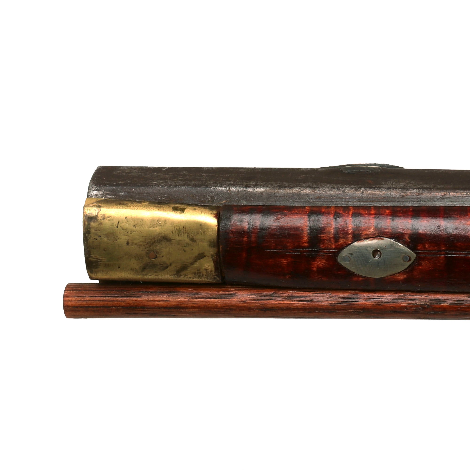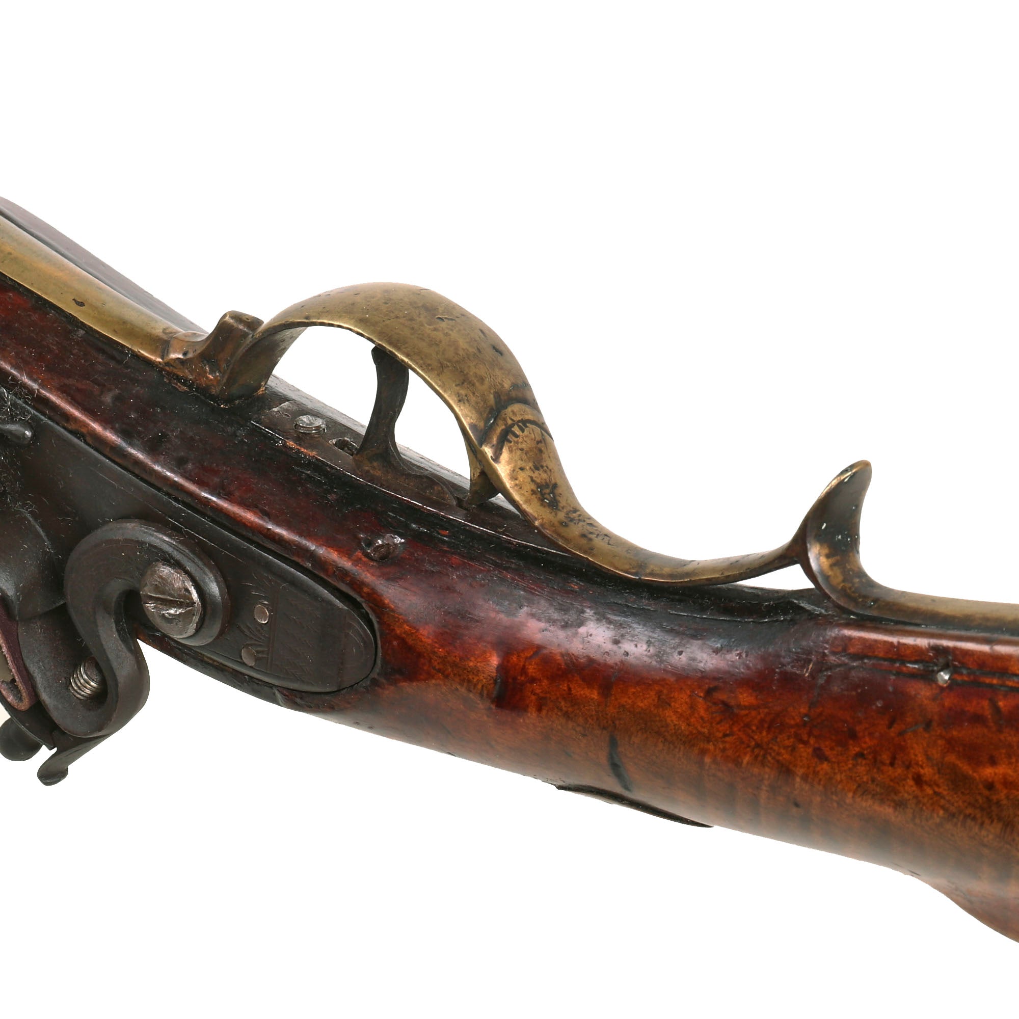 The 60 inch long gun features a smooth bore barrel of 45 inches with a bore of approximately 0.5". However, it is very possible that it was once a .30" or .39" rifle, which was worn down or smoothbored over the years to use as a fowling piece. While these rifles are beautiful works of art, they were just as famous for their effectiveness, and were made to be used. The beautiful well grained elegantly curved tiger maple full stock is carefully fitted with all brass mounts, characteristic of the style. An arstisan-made recently produced replica of a John Moll Sr. rifle by Eric von Aschwege can be seen at his website here: John Moll Sr.. While the replica is more upmarket than our example, it definitely gives a good approximation of the style.