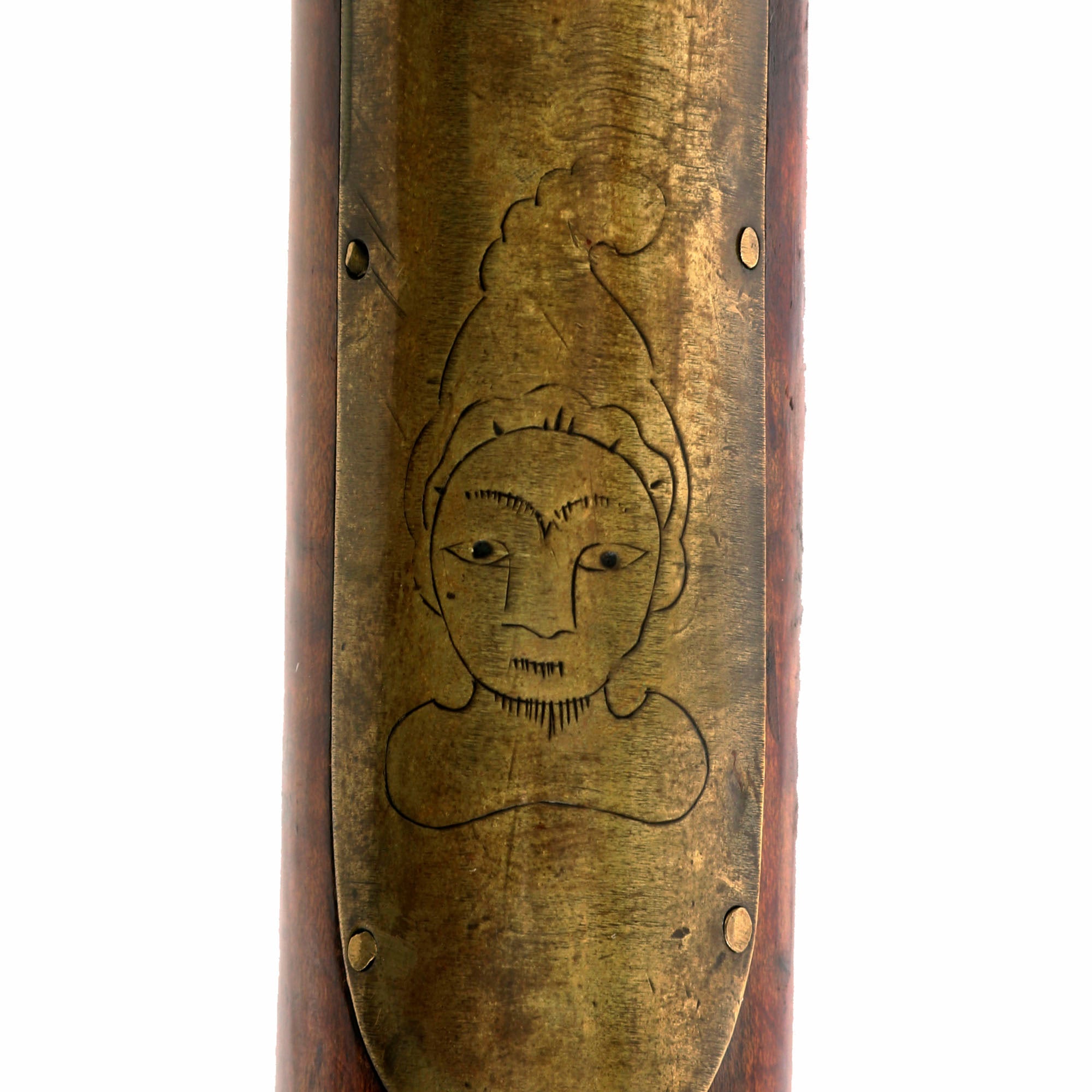 The lock on this rifle looks to be a "Trade Lock", as we often see on these rifles, though it is possible that it is a working life replacement. We can make out "R" On the top line, and "PH" on the lower line, so it was most likely made by one of many makers in Philadelphia during the early 19th century. The other side of the rifle features a German-inspired Lehigh style brass side plate, with an arrow at the tail. The slender gently sloping design is a typical Lehigh county form. Another Allentown area specific trait is the "Liberty Head", engraved onto the brass hand guard on the underside of the stock. Also called an "Indian Head", this design is iconic, and definitely adds to the displayability of the rifle.