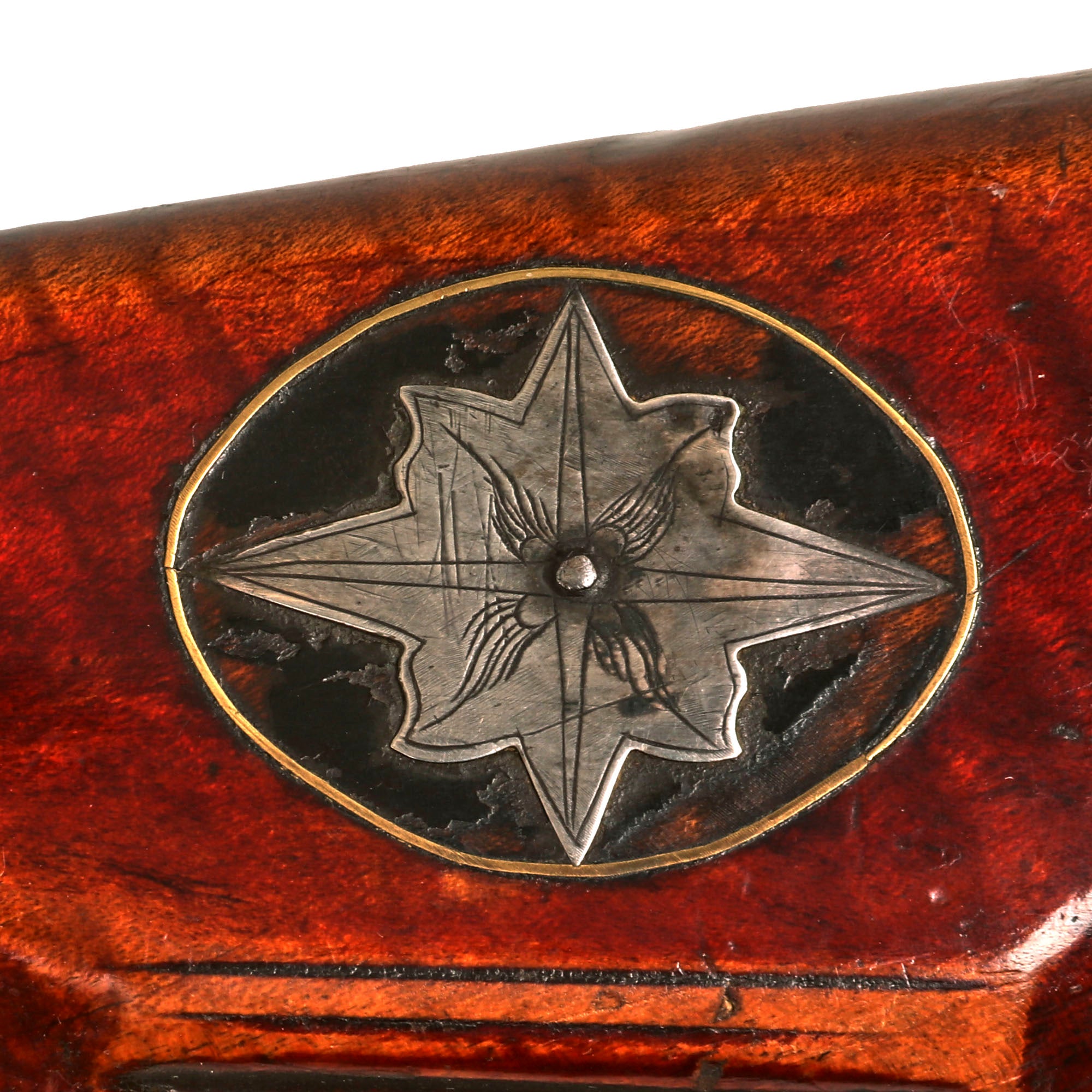 The rifle does not have a carved stock, as some early examples did, however it still is quite well ornamented. The left side of the butt stock has a lovely characteristic German style cheek rest, above which is a silver "hunters star" inlay, surrounded by a brass wire inlaid oval. The left side of the stock features a two piece patch box, retained by the characteristic 3 screw retained fitting. It is opened by sliding down button on the rear of the butt stock, which is no longer springy like it once was, so it does not hold it closed securely. The end of the cover features an engraved / stylized reversed C around the riveted end of the latch, a Moll family trademark. There is also some lovely brass wire inlay around the patch box as well.