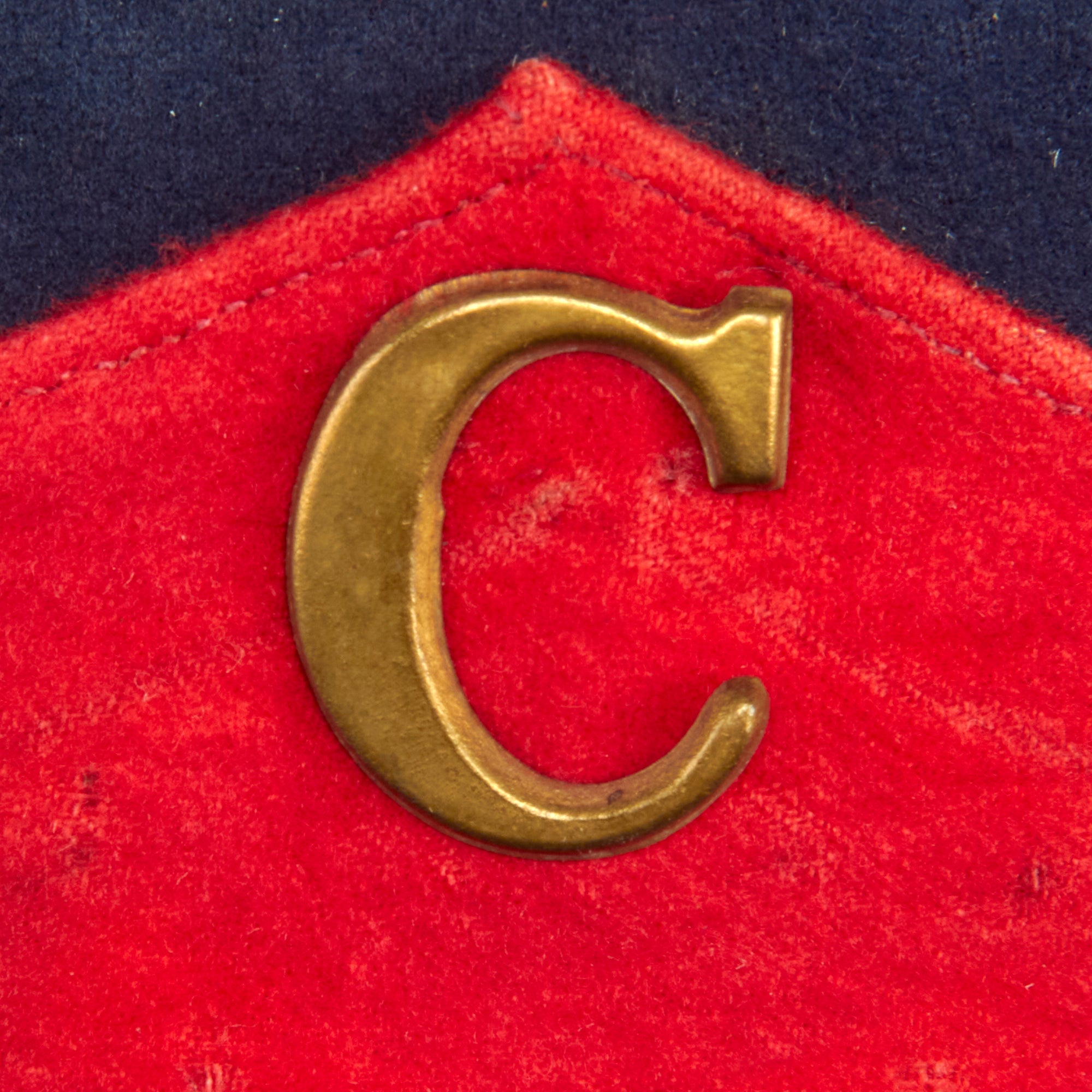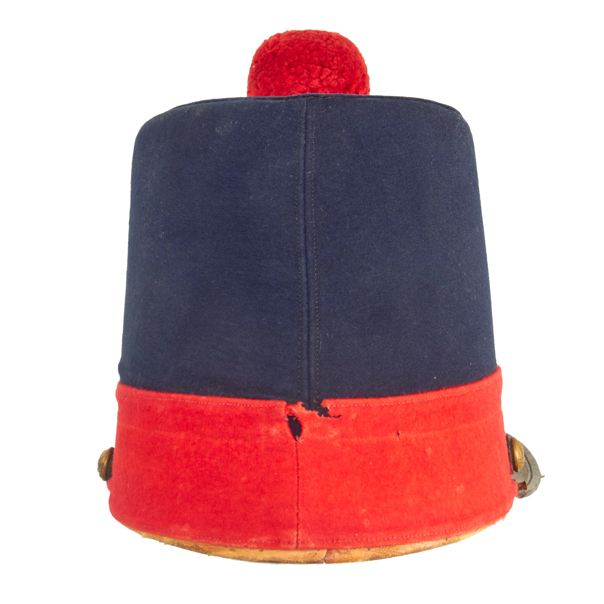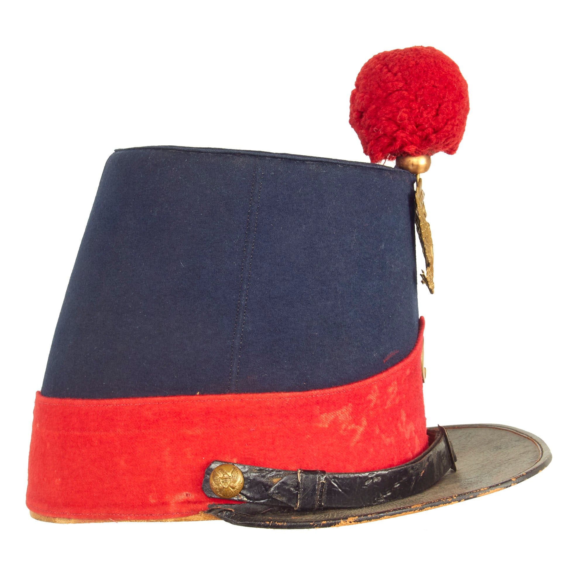 This is an impressive 1851 pattern dark blue shako, with the correct red artillery felt bottom border with welted seams. Stands approximately 6 ½ inches tall, with a blue wool-covered pasteboard body, this shako follows the lines of the US regulation 1851 pattern shako with a flat, bound leather visor that flares slightly from side buttons forward. The flat crown is about 5 ¾ inches in diameter and is pierced at the forward edge for the scarlet red pompom, the branch color for Artillery. Below this on the top front is a regulation stamped brass eagle with the arms of the U.S., familiar to collectors from its later use as a side plate on the Hardee or Jeff Davis hat. Two welted seams form a point-up chevron near the base of the hat, beneath which is the stamped brass letter "C", most likely for the company the wearer was in.