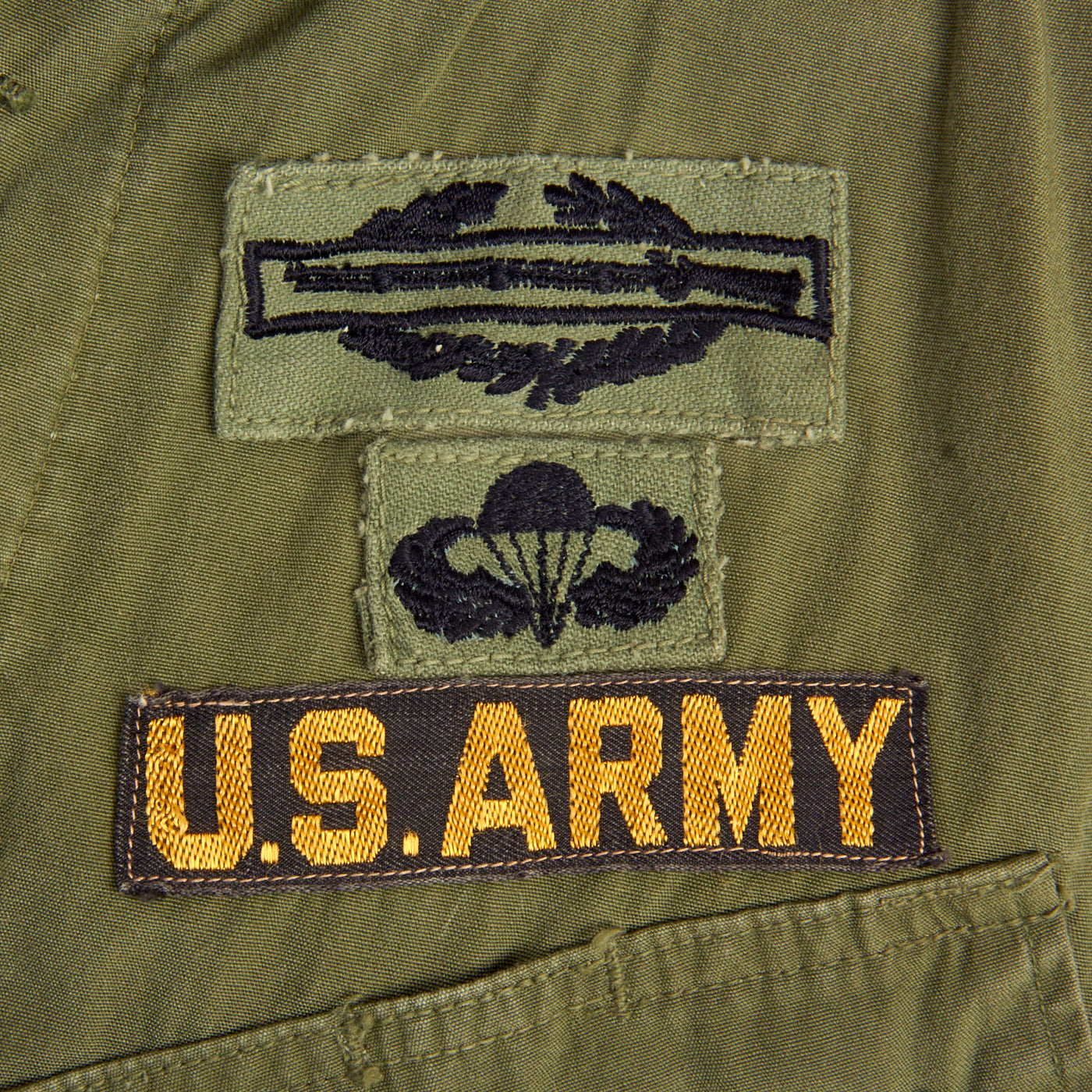 The insignia is a mix of U.S. Manufactured and “incountry” Vietnamese made pieces. Of note is the full color name tape that is bilingual (English and Vietnamese), above that are Vietnamese-made South Vietnamese Army Jump Wings. Above the left breast is a U.S. Parachutists Badge and a Combat Infantryman’s Badge. The MACV Shoulder Sleeve Insignia is Vietnamese Made. All insignia is original to the jacket, and shows signs that it has been sewn in place, and worn. The insignia sewing does not look “new”, as there are many unscrupulous dealers who commonly add insignia to these uniforms.