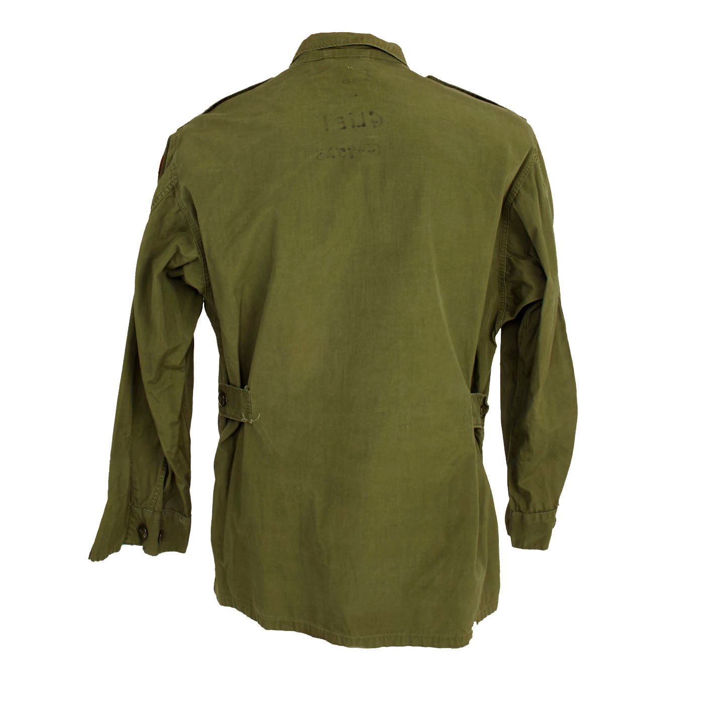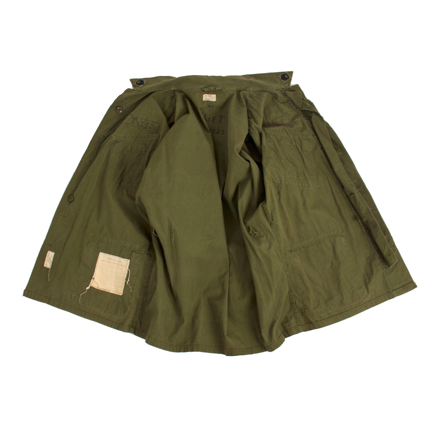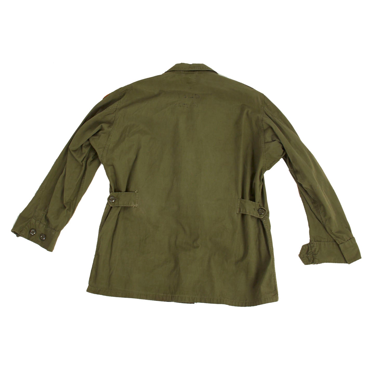 Original Item: Only One Available. A very nice example of a rare 1st Pattern Jungle Fatigue Blouse, dated 1964, with all original insignia! This jacket is of the desirable 1st Pattern, which was based on the WWII U.S. M-1942 Paratrooper Jump Jacket. The jungle fatigue featured exposed buttons, waist adjustment tabs, and epaulettes. It was constructed of poplin cotton.