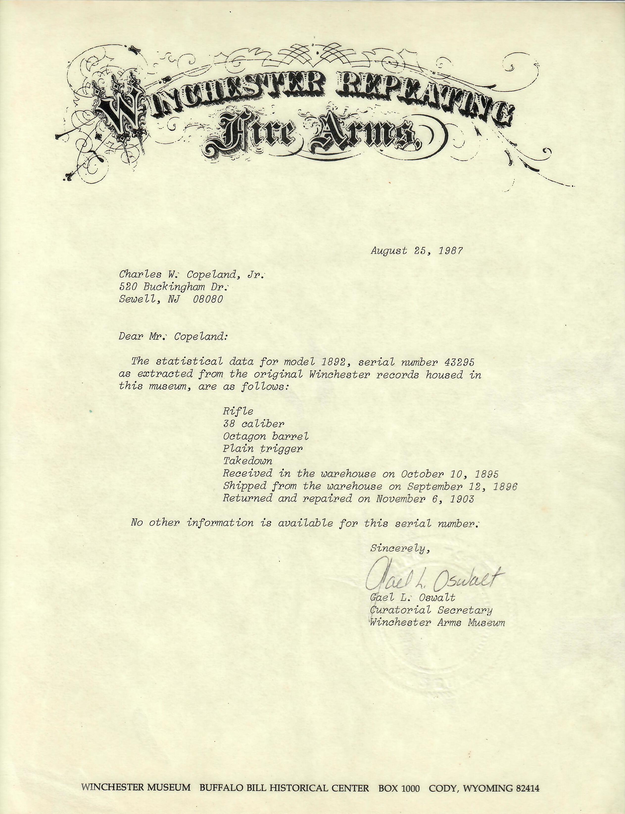 This rifle comes with an original factory letter from the Winchester Museum at the Buffalo Bill Historical Center in Cody, Wyoming, which has been laminated in plastic. This would later become the "Buffalo Bill Center of the West" at the Cody Firearms Museum, which now houses the original Winchester factory records. The letter is printed on WINCHESTER REPEATING Fire Arms letterhead, and dated August 25, 1987, and is signed by Curatorial Secretary Gael. L. Oswalt with a raised seal.
