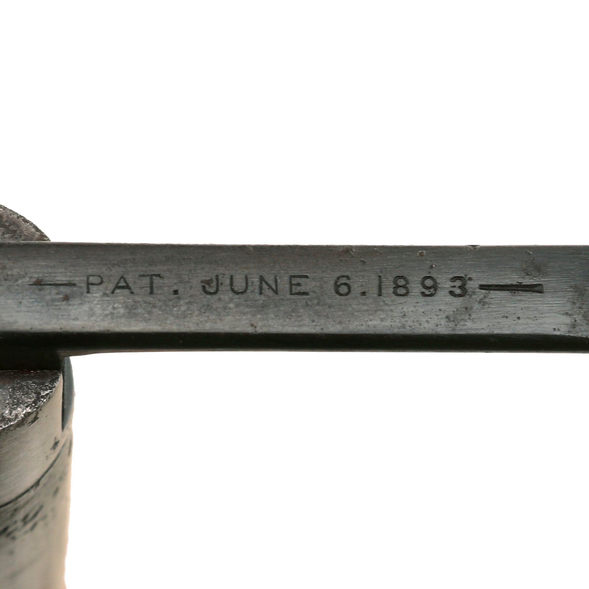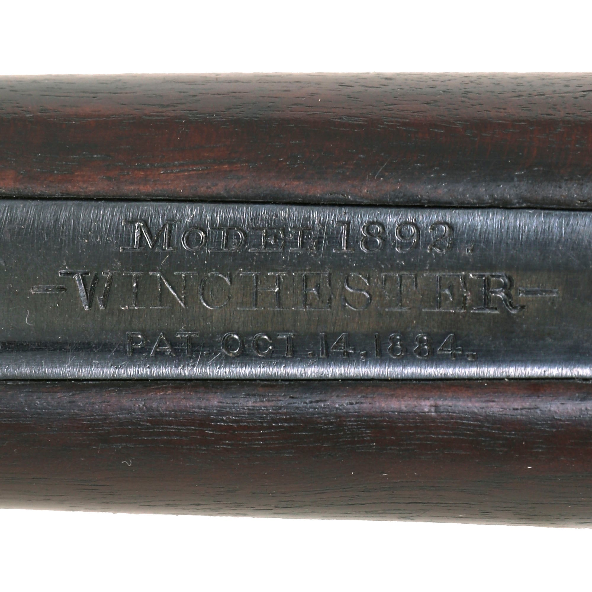 The take down magazine is marked with -- PAT. JUNE 6. 1893 --, as is correct. The original walnut stocks are in excellent condition, with a lovely dark red brown color and great finish. they show only minor wear, and both the fore stock and butt stock have some lovely curl to the grain. This is especially true with the fore stock, which is almost "burl" walnut in places. The butt stock features a crescent butt plate without a storage compartment.