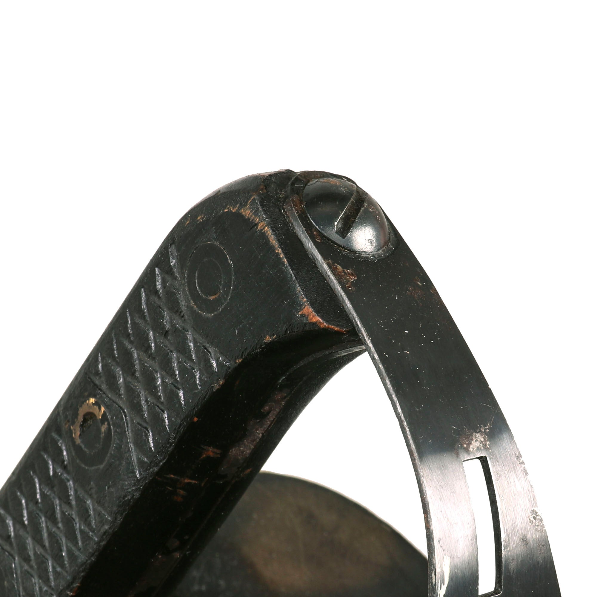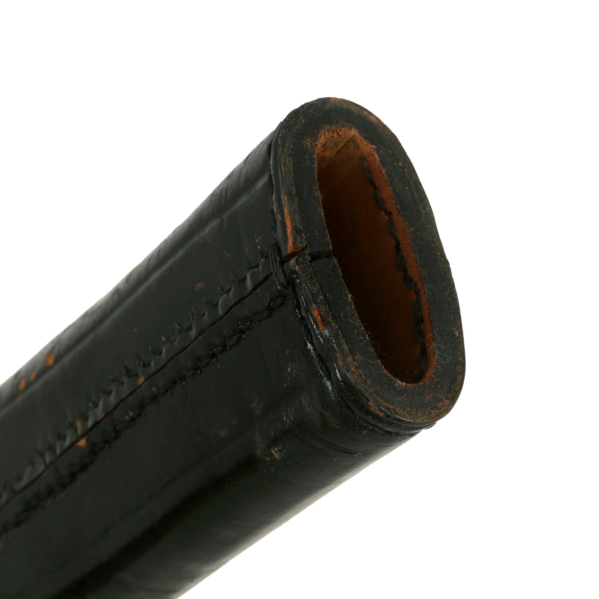 The leather scabbard is also in great shape, showing some some scuffing on both sides, but no major damage. The blacked brass drag of the scabbard is in great shape, with no major damage, just some scuffing and paint marks. There are no bends or tears in the leather.