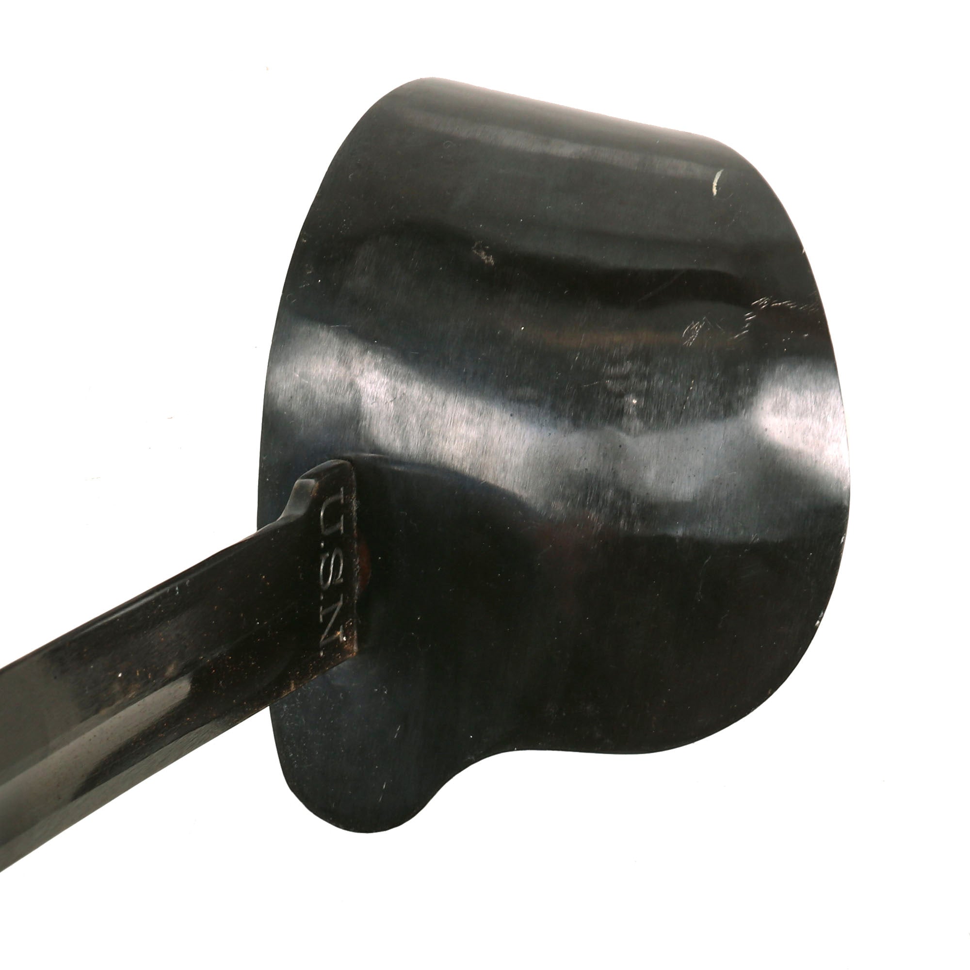 Along with the distinctive clipped point, full half basket cup, and wooden cross-hatched grip the only other identifying mark on this cutlass are the large initials U.S.N. found on the obverse ricasso.