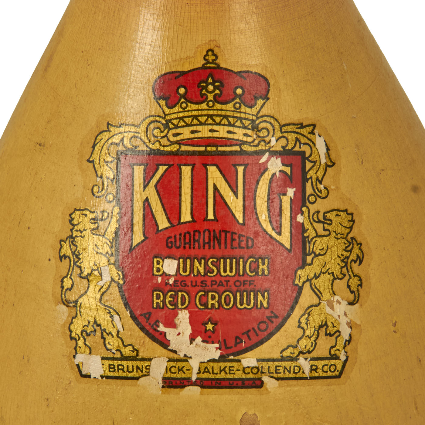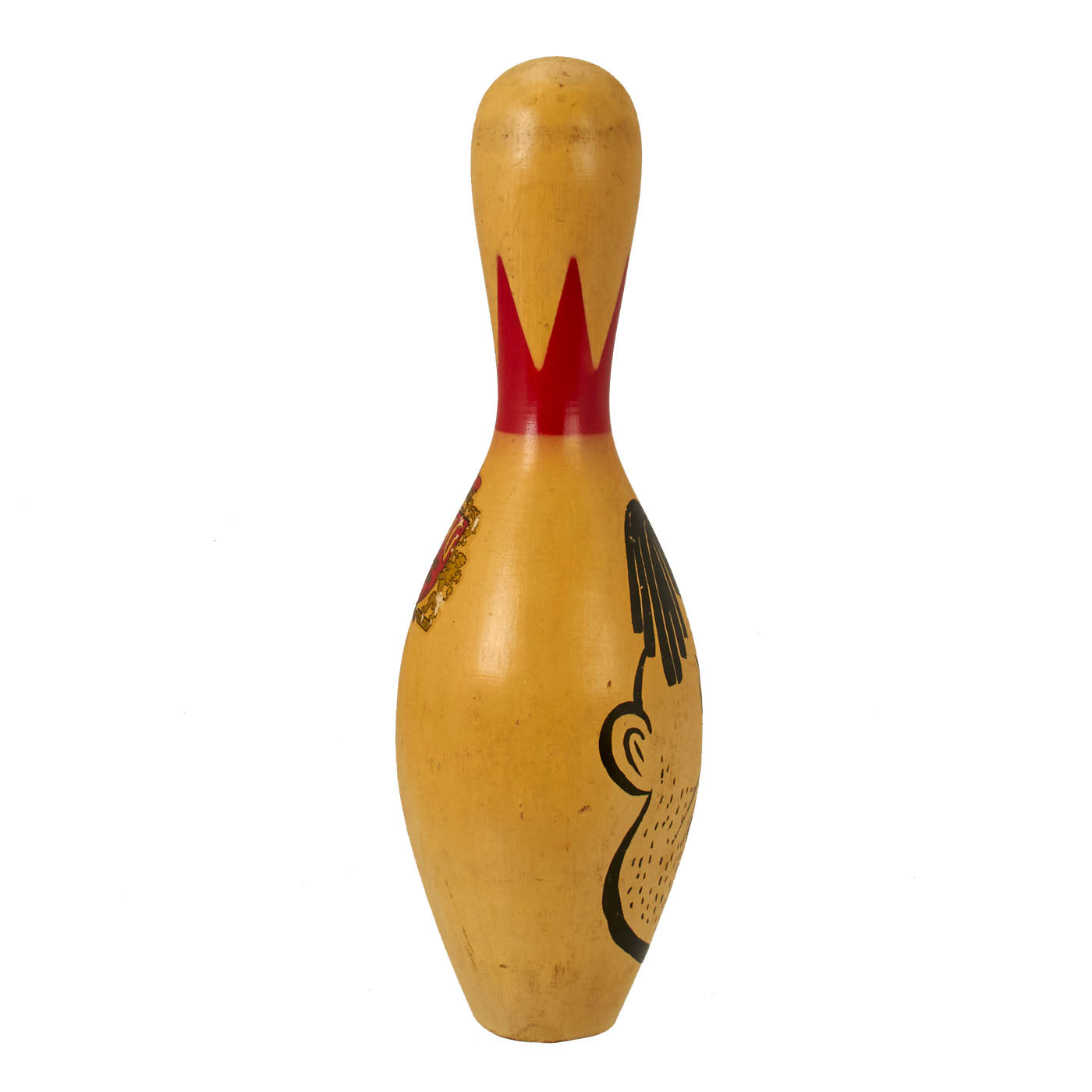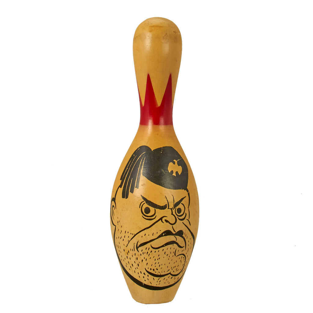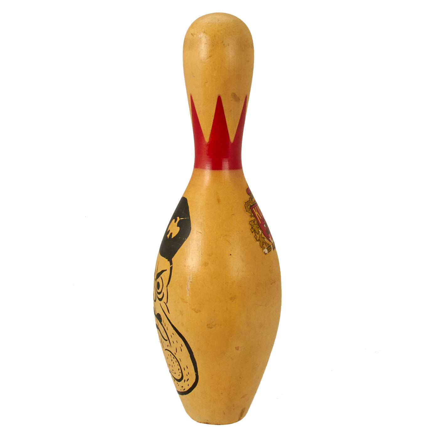 Original Item: Only One Available. This is an extremely rare WWII anti-axis "KING" bowling pin, made by the Brunswick-Balke-Collender Co.. These 15 1/4 inch tall pins were made during the WWII era so that people could "bowl over the Axis powers", or something to that effect. These were all produced for an bowling alley in Indiana, and only about 150 of these were originally made, with very few still known to exist.