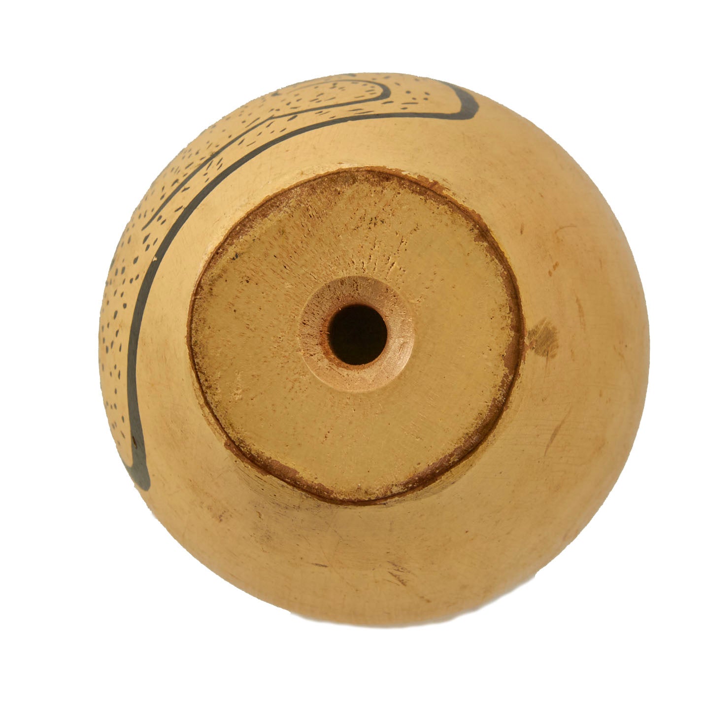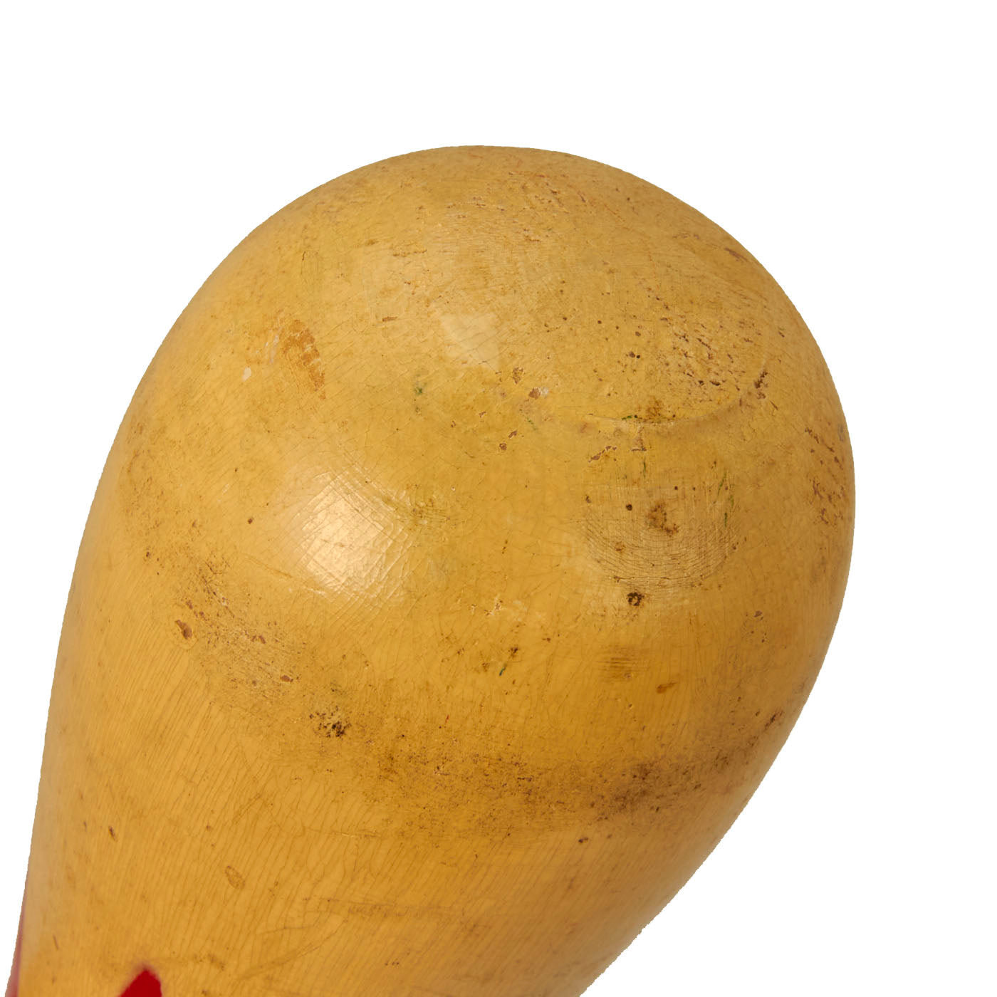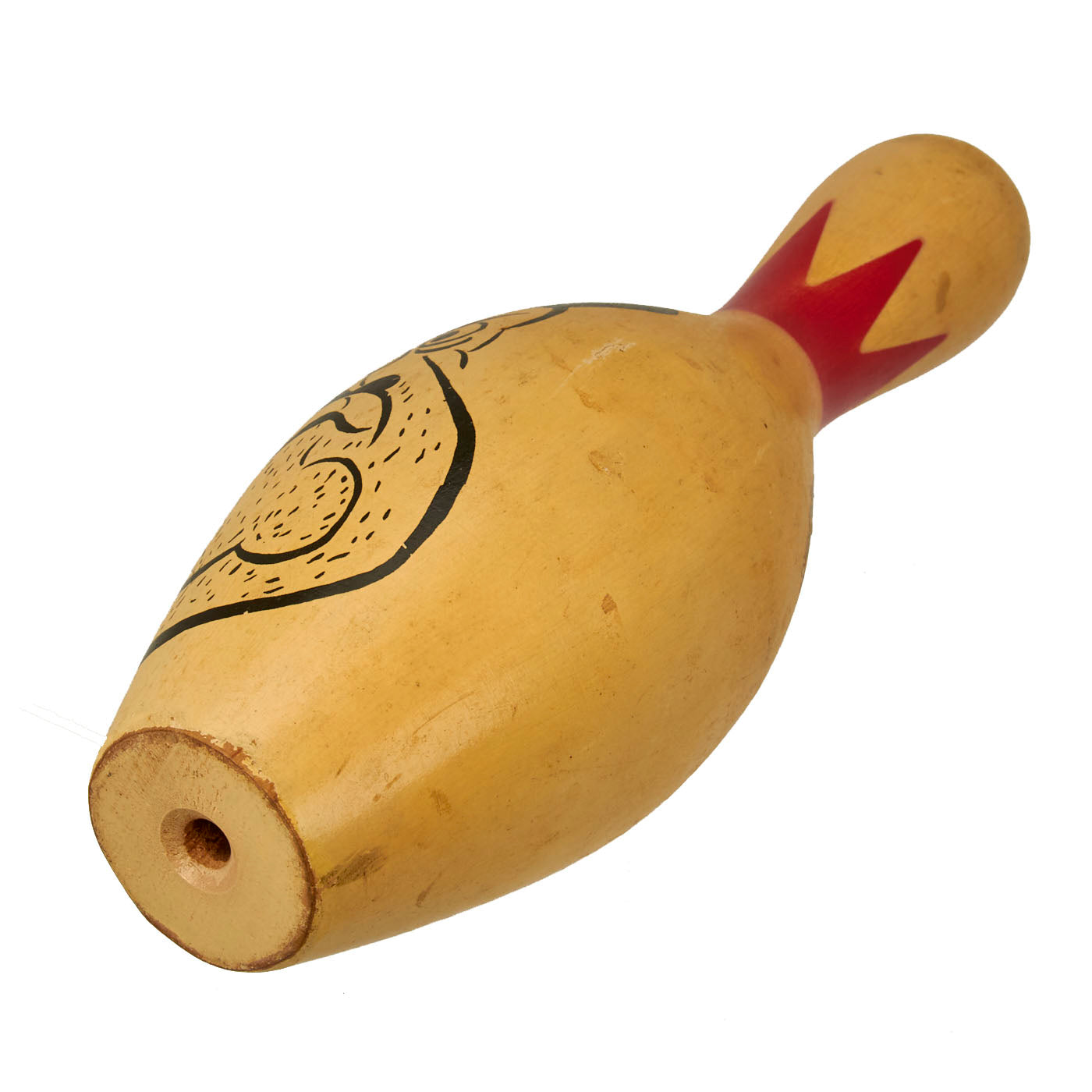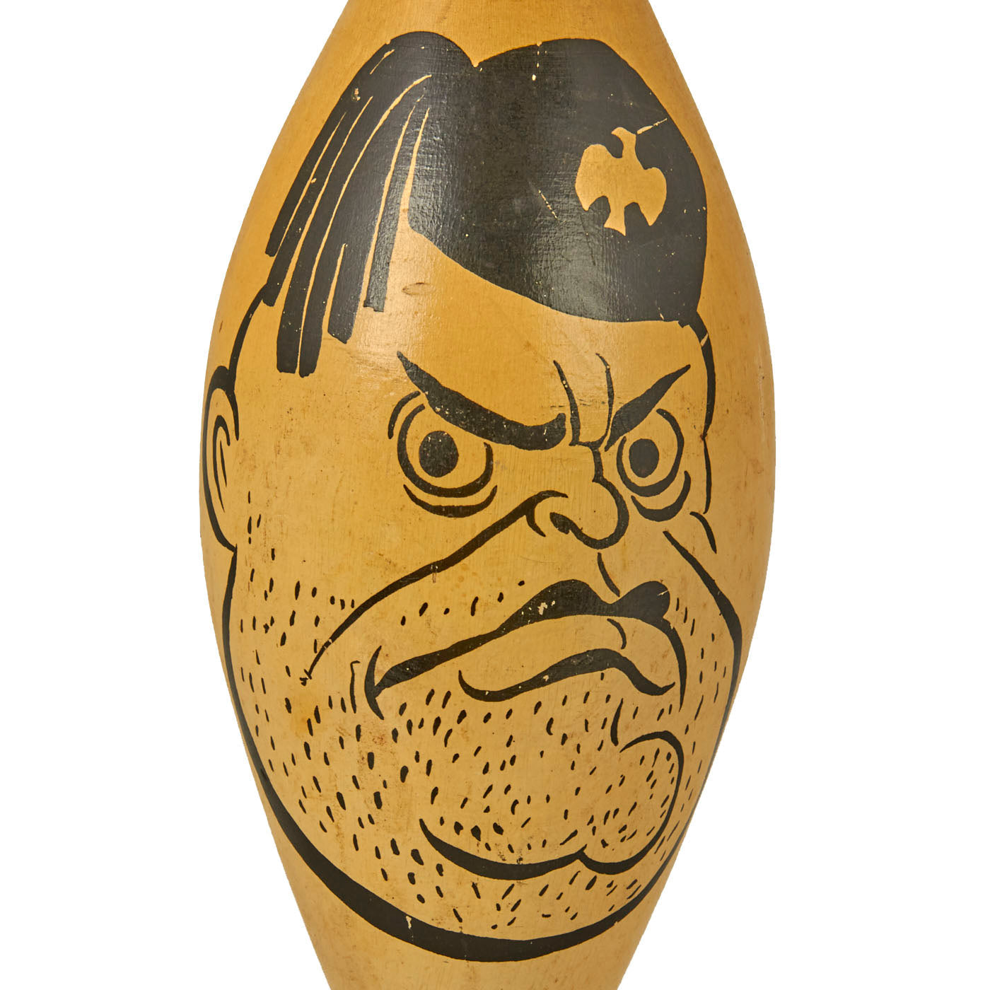 Three versions of these bowling pins were made, with caricatures of the major leaders of the Axis powers painted onto them. These included an Anti-German version with A H and a Swas on it, an Anti-Japanese version with General Hideki Tojo on it, and this, an Anti-Italian version with Dictator Benito Mussolini on it. The caricature is definitely not flattering, with a scowling expression on Mussolini's face, fat lips, and a protruding unshaven chin.