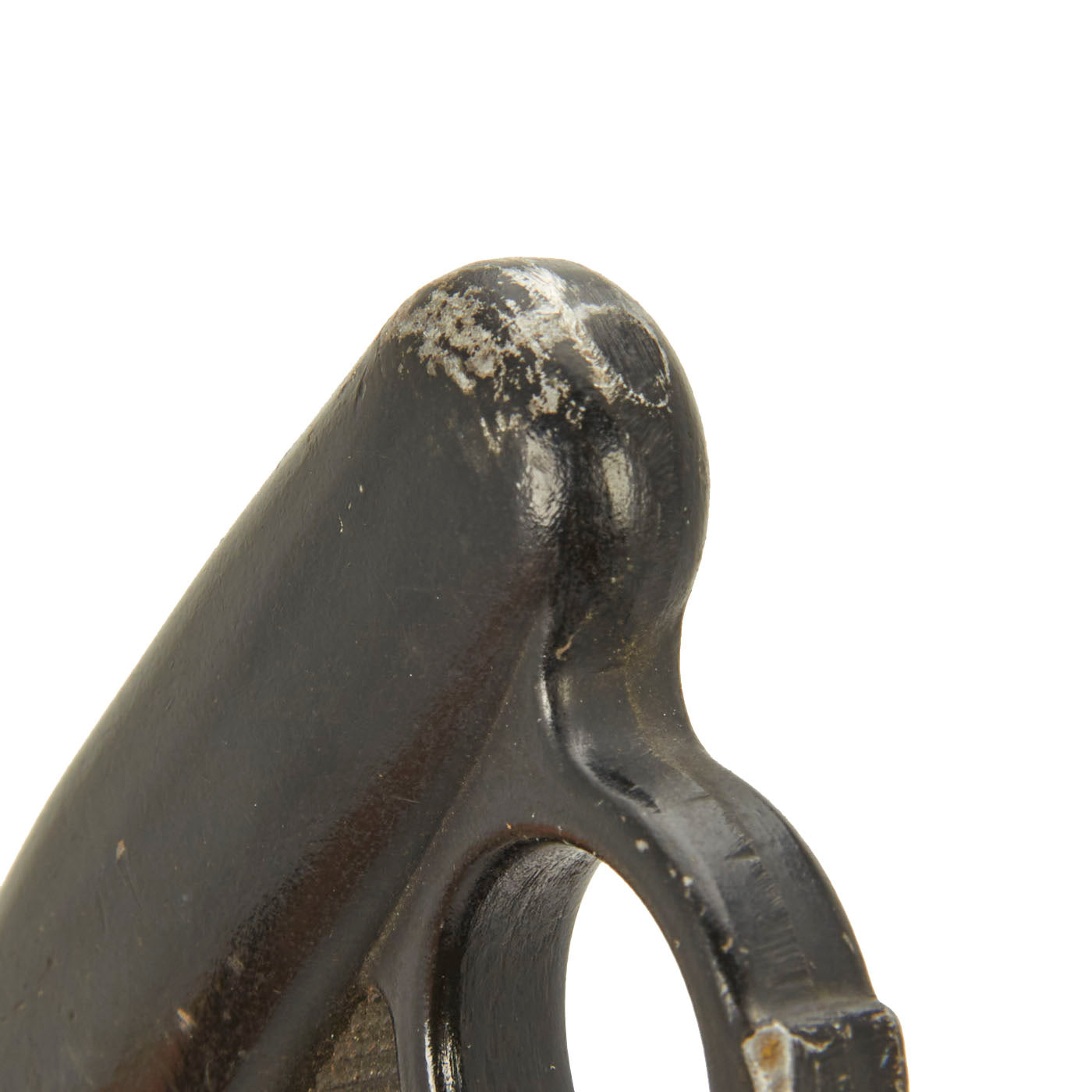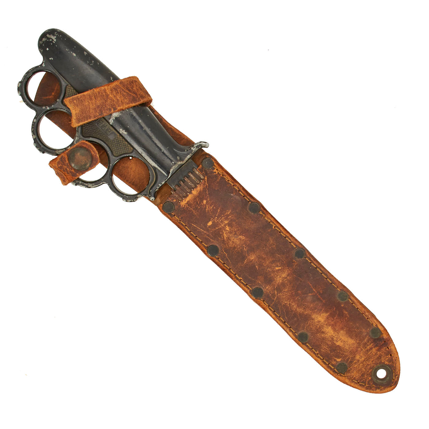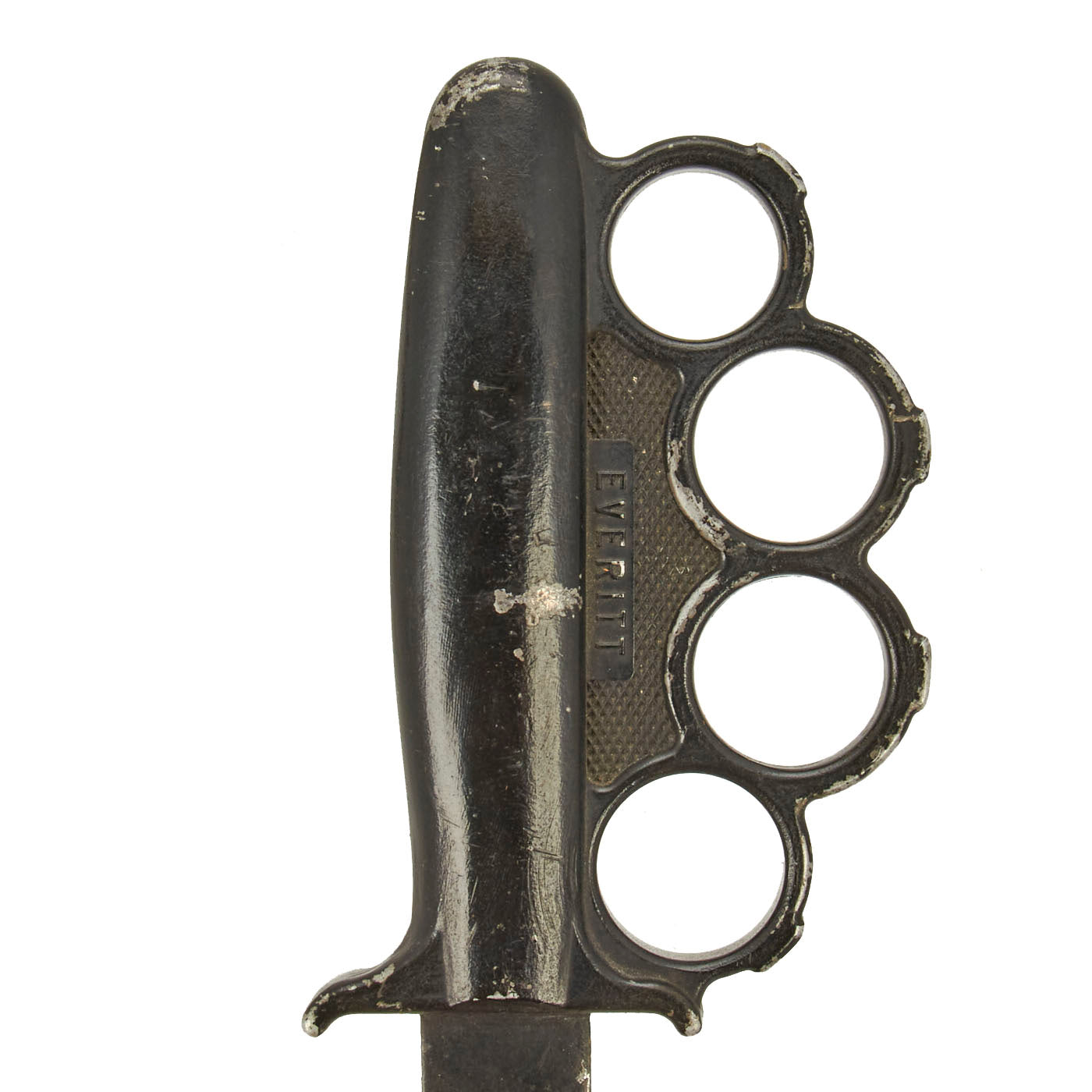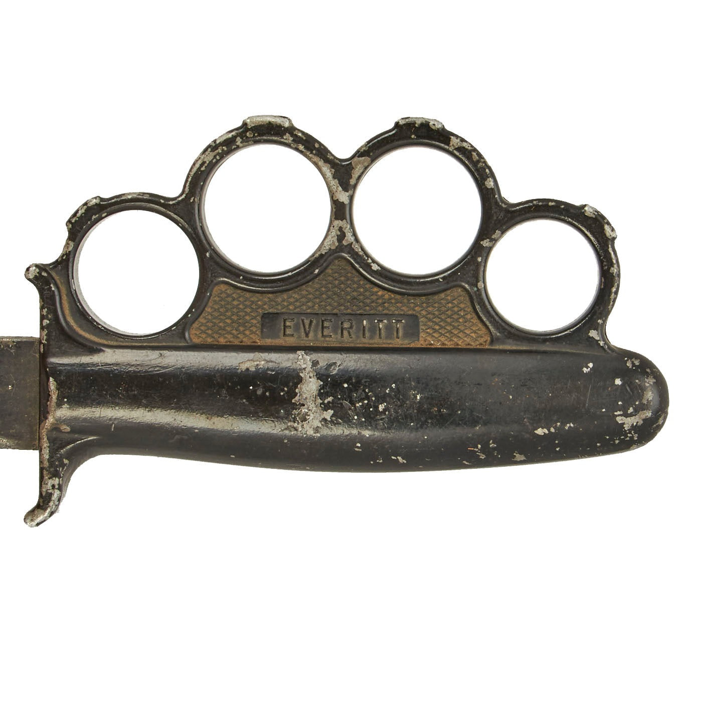 Original Item: Only One Available. This is the third example of the rare U.S. WWII Everitt Knuckle fighting knife that we have had, and it features a black painted handle, with the correct original scabbard. No reference indicates that anyone knows who “Everitt” was, or who the company that produced the knives was. Some have surmised that it was the location of manufacture, but due to the passage of time, most likely the true answer will never be known.