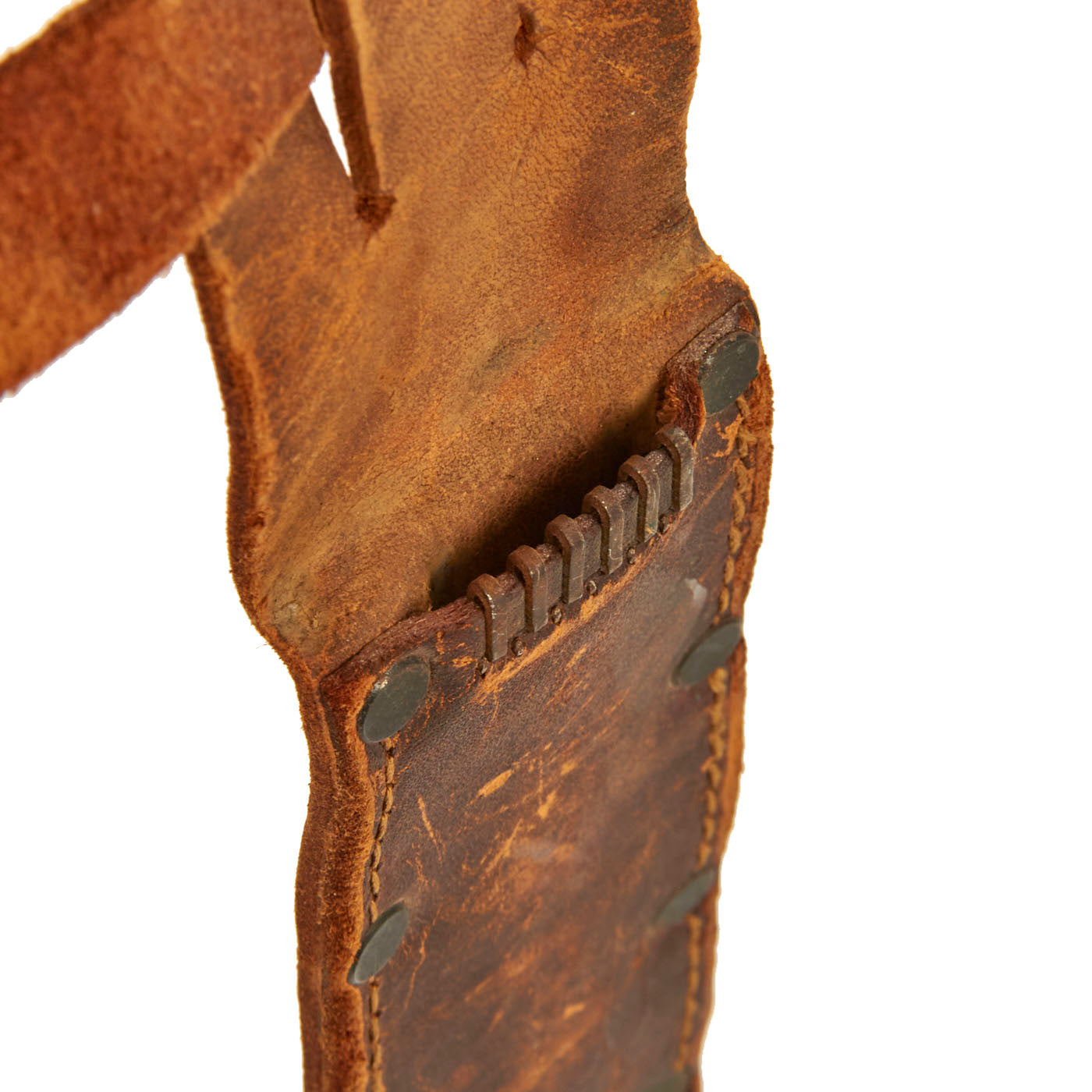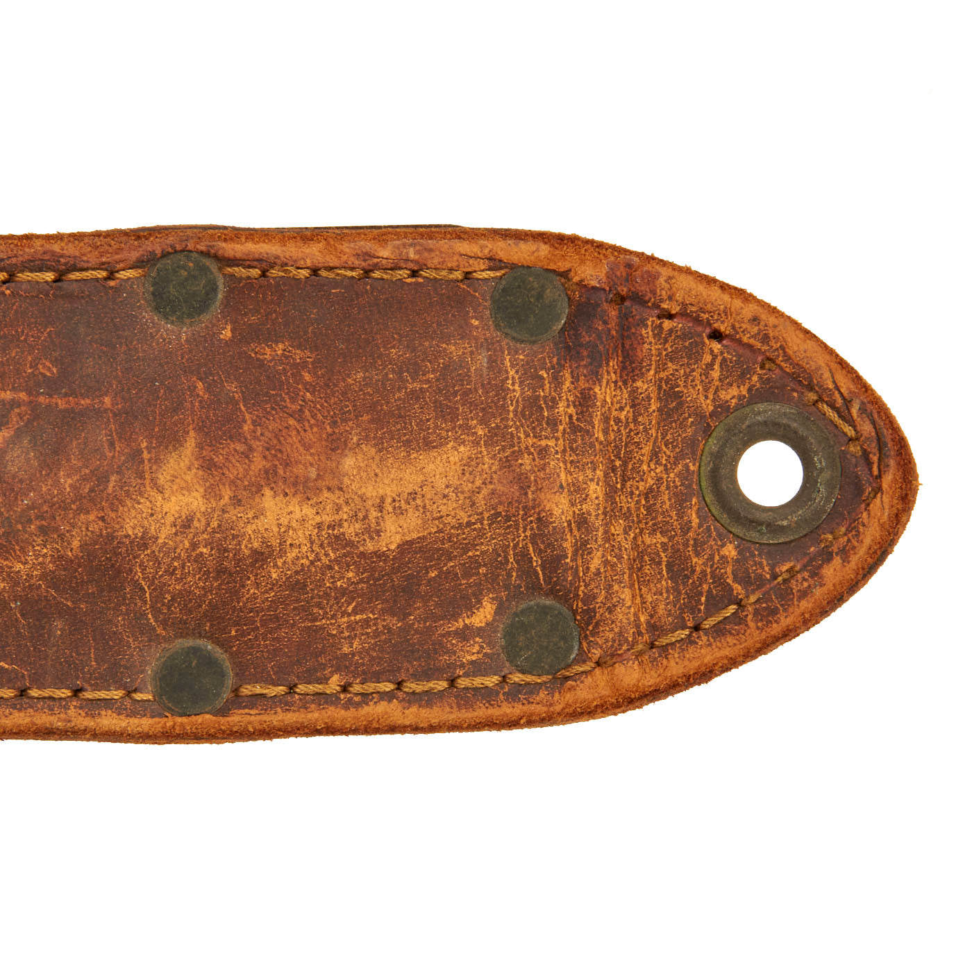 The correct scabbard for these knives is almost rarer than the knife itself, as they often degraded and were lost. This scabbard is absolutely correct, with the 6 staples on the throat, along with 10 round side rivets, and the metal plate on the BACK of the scabbard. The design is somewhat like the M6 leather scabbard, but definitely has some important differences, as can be seen. The scabbard is in good shape, however there is definitely evidence of moisture damage, which is on the back of the scabbard. This side matches the corrosion on the blade, so this knife and scabbard are matched.