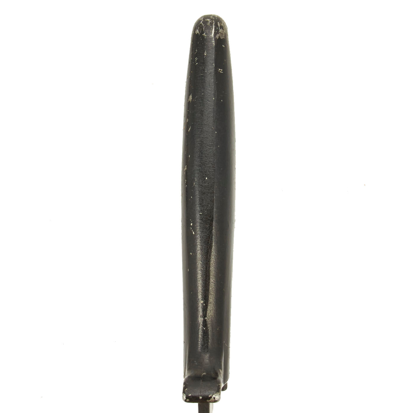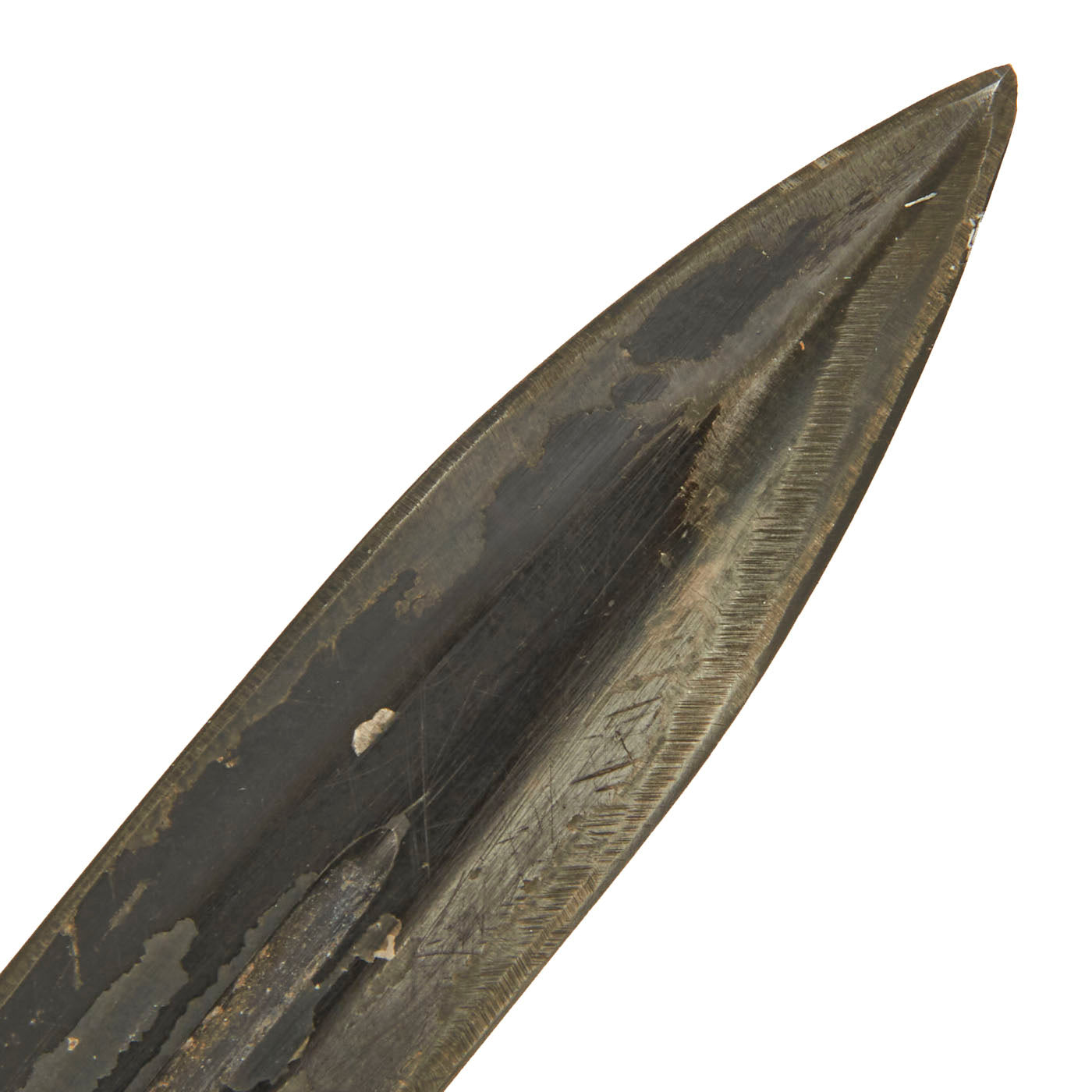 The blade is a simple double-edged spear-point design, which measures about 7 inches long with thin central fullers. The knife is clearly intended for stabbing and only offered limited utility for the other duties that a combat knife might be called upon to deliver. The blades were usually painted with black enamel, however this example is blued, and this looks to be the original finish. The blade does have some small areas of rust on one side, with some more advanced oxidation on the other. This has resulted in the blued finish degrading on that side from attempts to remove the rust. The blade itself does not show any real signs of use.