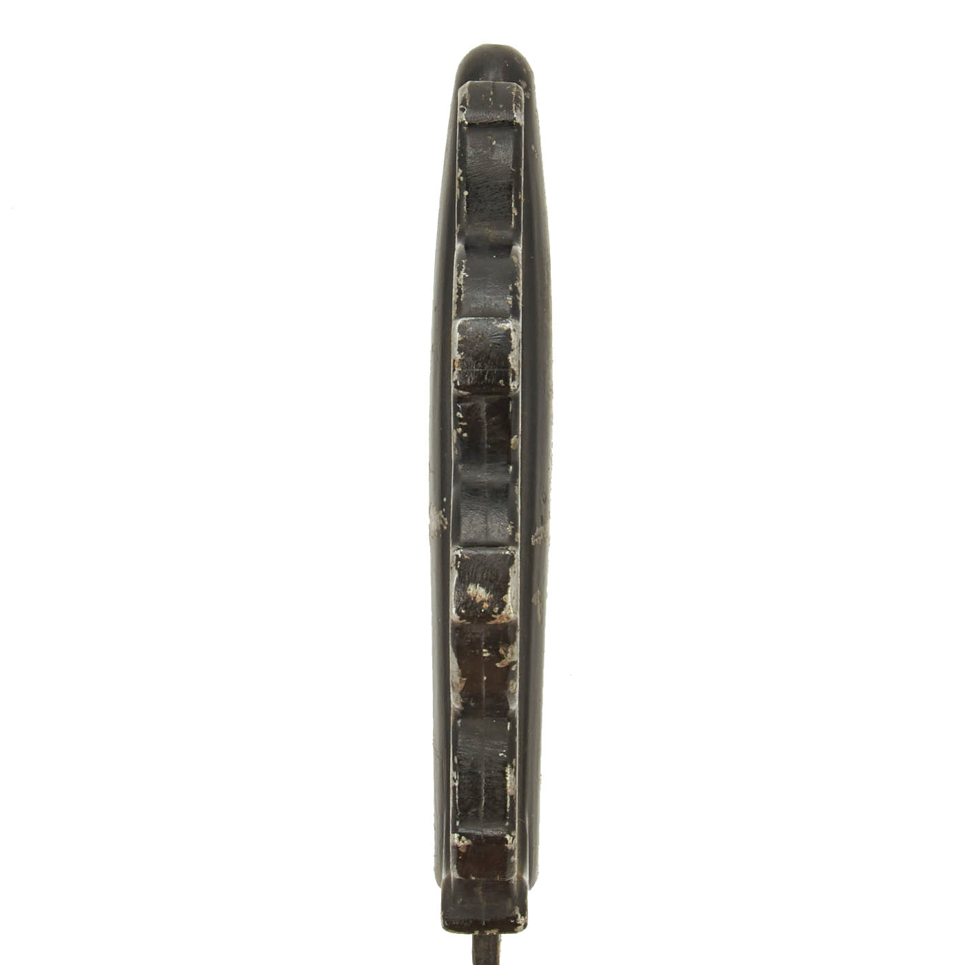 What is known is that these fighting knives were produced for use by US troops in the Pacific Theater of operations, and measure almost 12 inches in overall length. They feature a 5 inch long cast aluminum hilt, with four finger holes, which have small flat raised areas on the outside of each. The "palm" area of the grip is checkered, with a raised EVERITT marking. This is important to note, as most replicas of these have a stamped marking, and lack the proper texture. These knives came with either a black or green enamel paint on the handle, and this example has the less often seen green paint. There is some chipping to the paint, but it is very well retained. These are often found nearly devoid of paint.