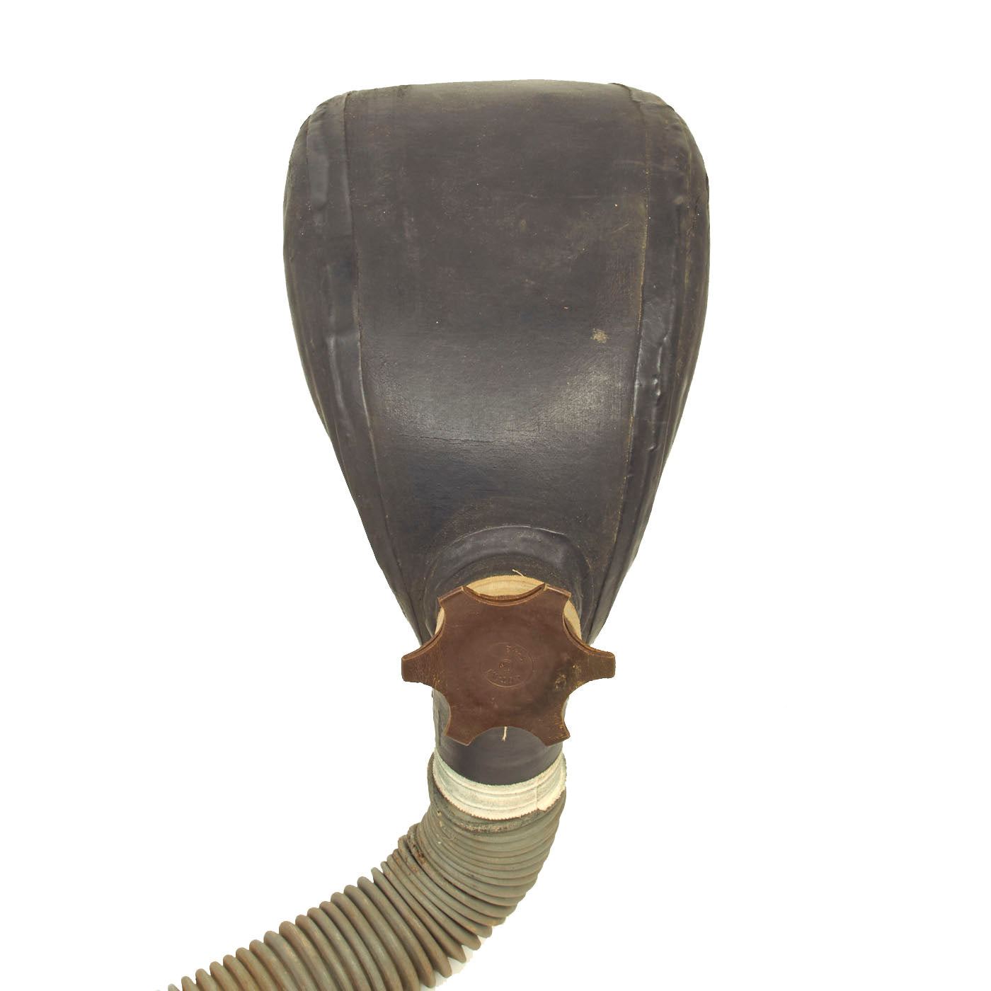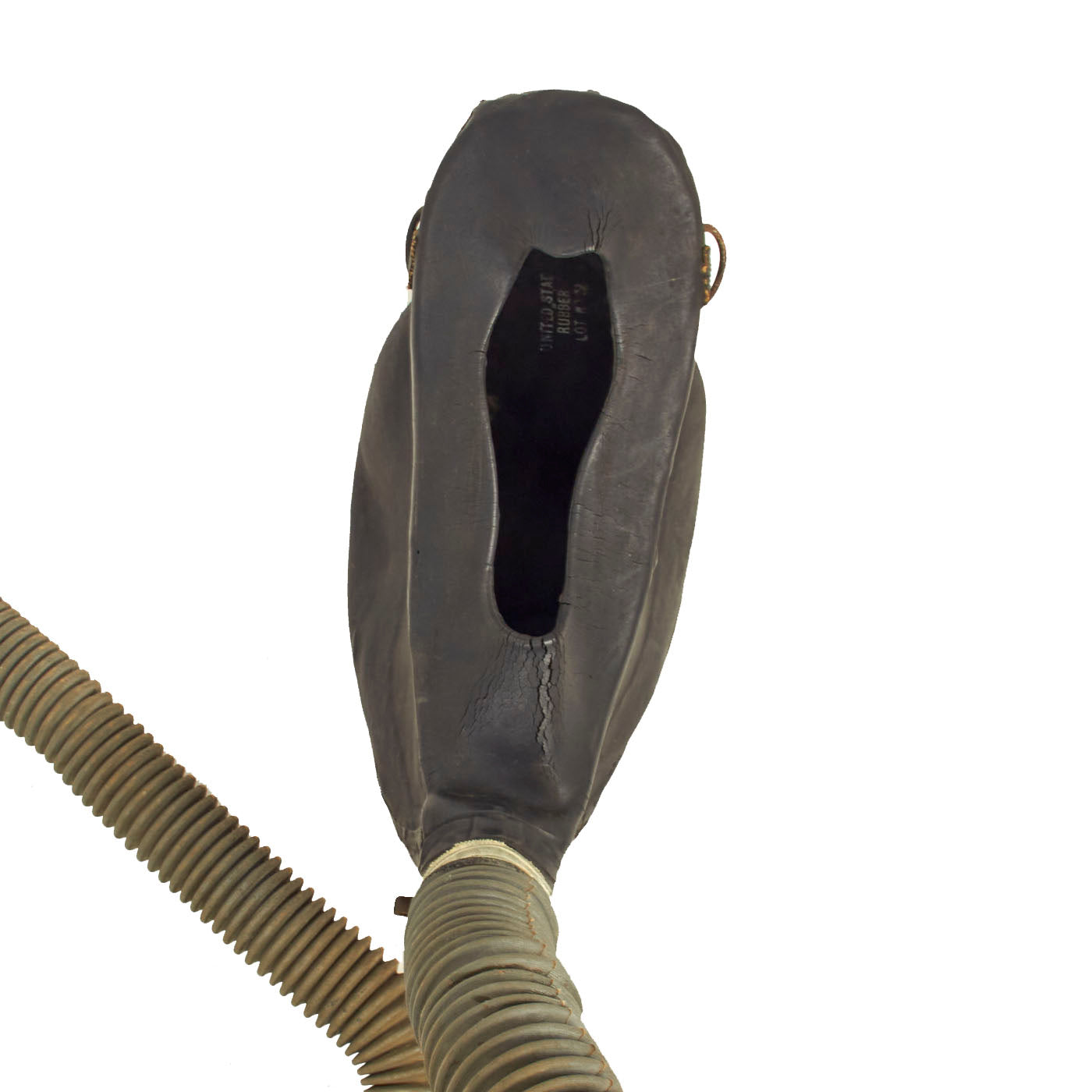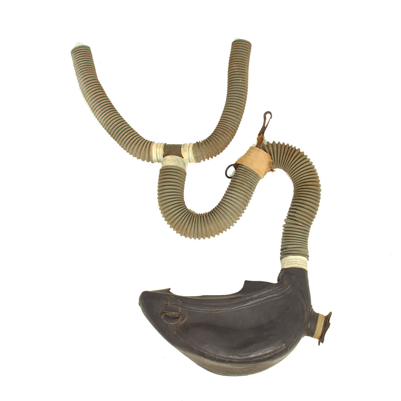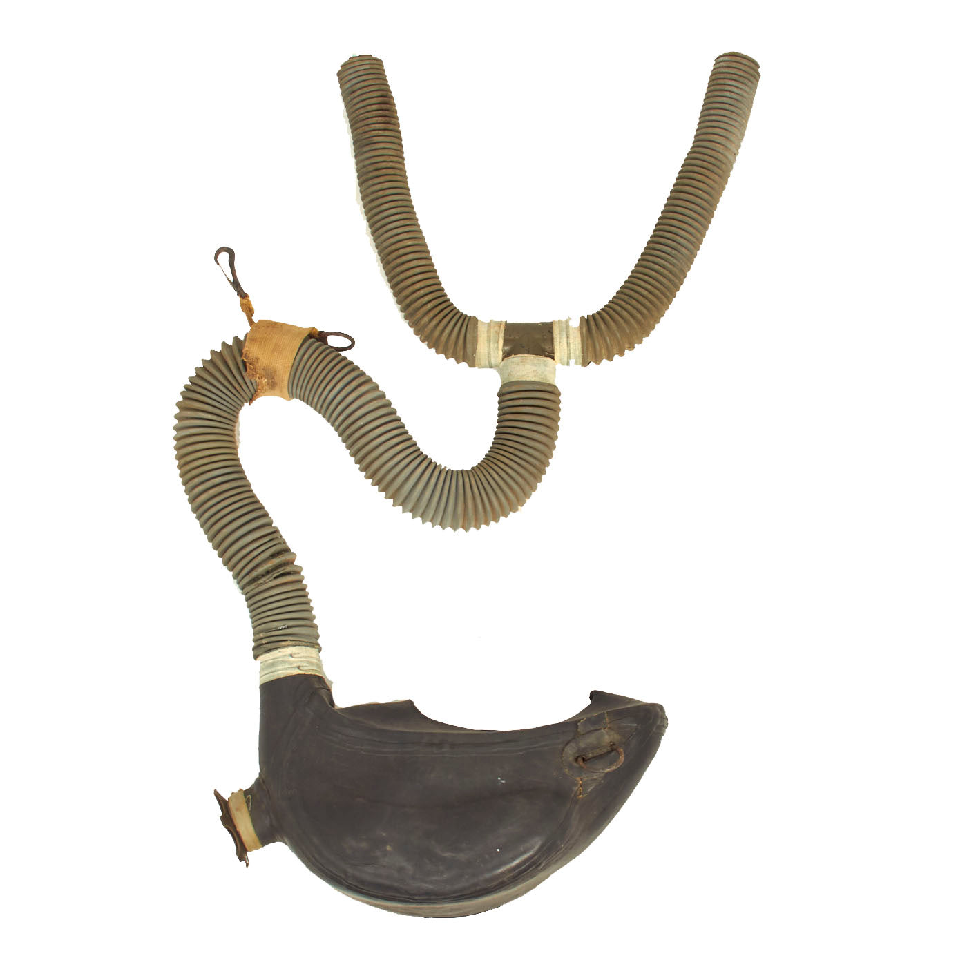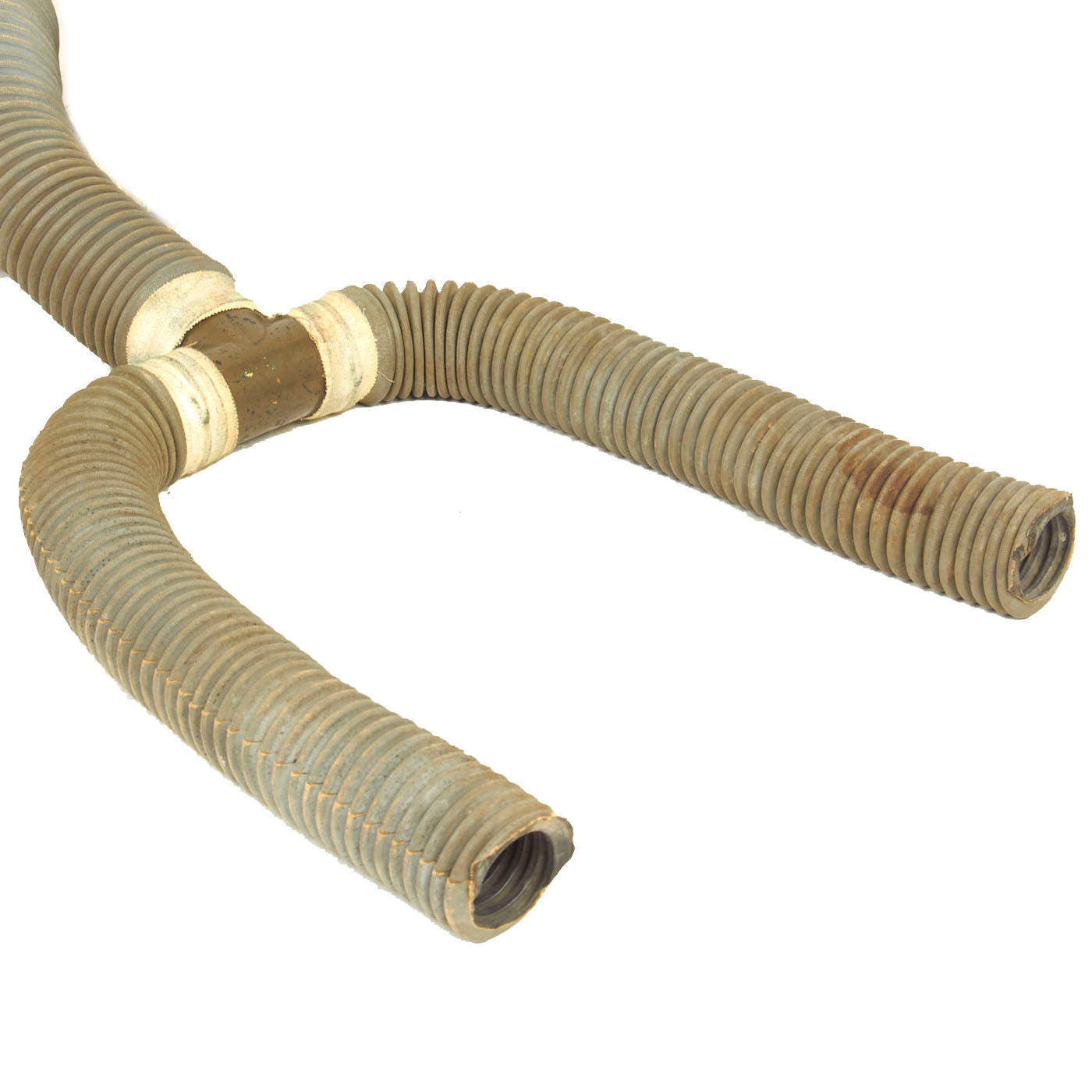 The mask itself is in good condition and does not appear to have seen much use, however, the rubber hoses were cut where the connection is made to the canisters.