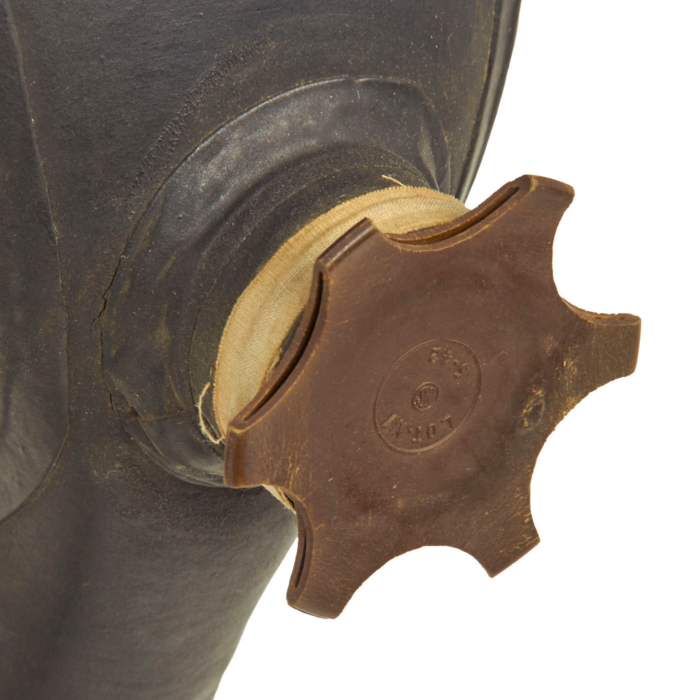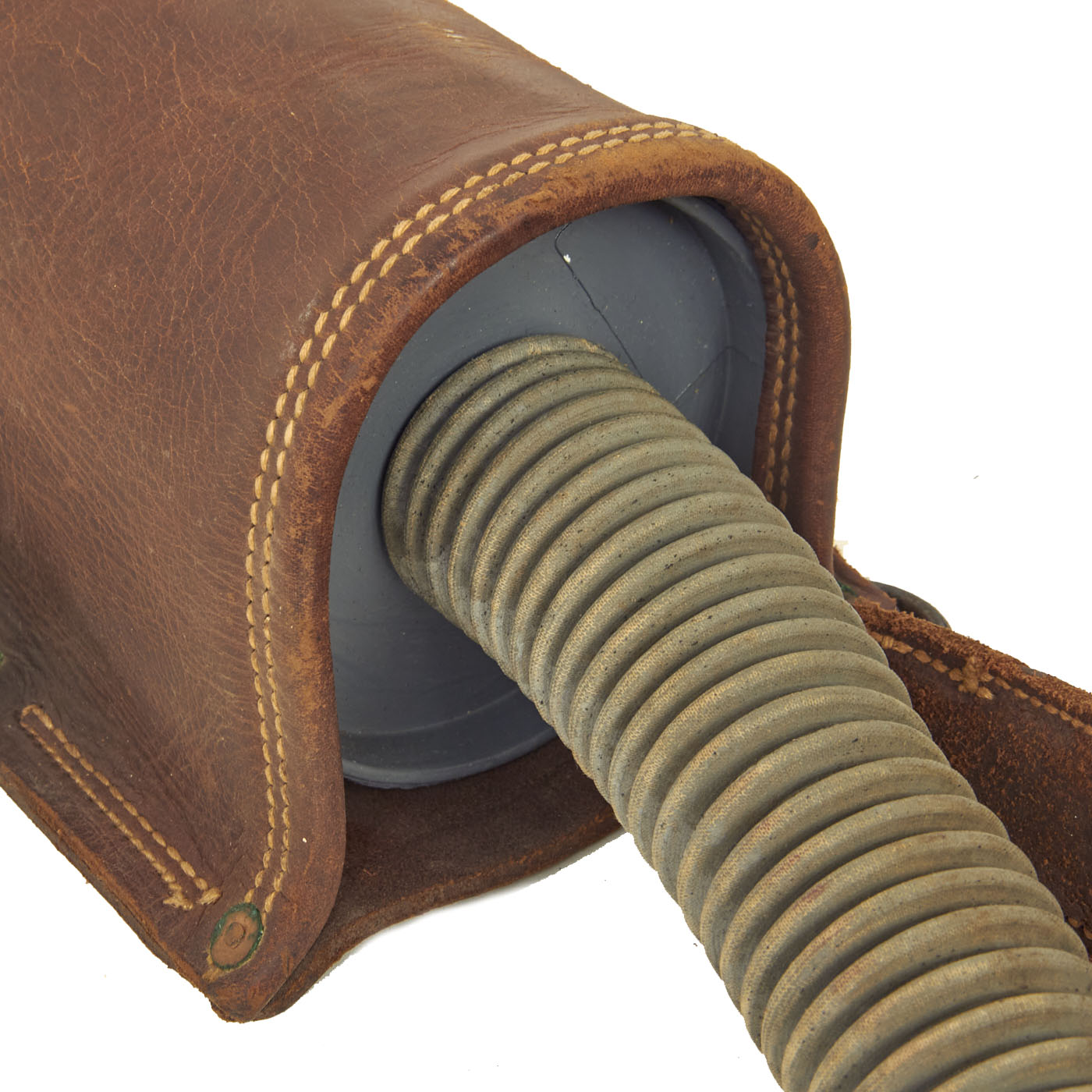 The left and right leather canister carriers are in similar condition to the leather on the canvas carry bag for the mask. The leather cases show minimal use with minor cracking due to age. The leather is still soft with no tears or holes with all stitching still intact. The brass fittings used to attach the buckles, clips and rings have some oxidation present, leaving the surrounding leather surface a greenish color. The leather top tie down string is still present on both the left and right carrier and are in perfect working order.