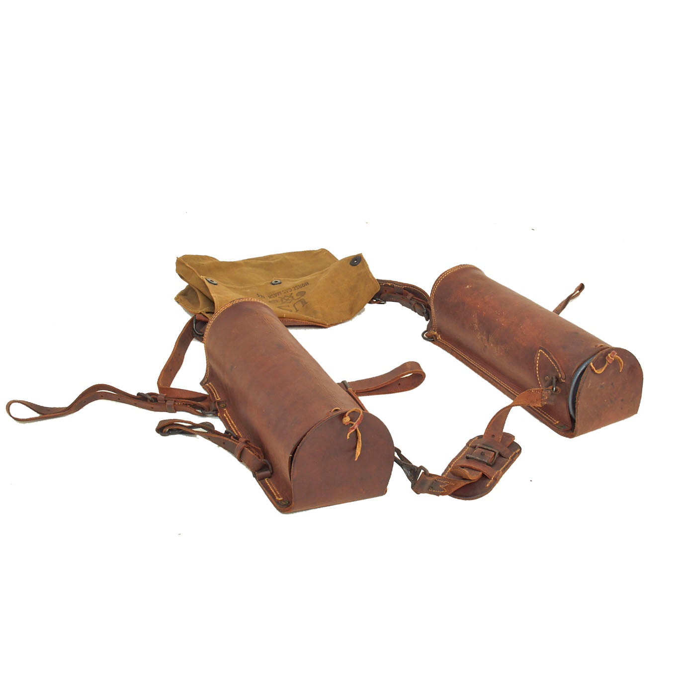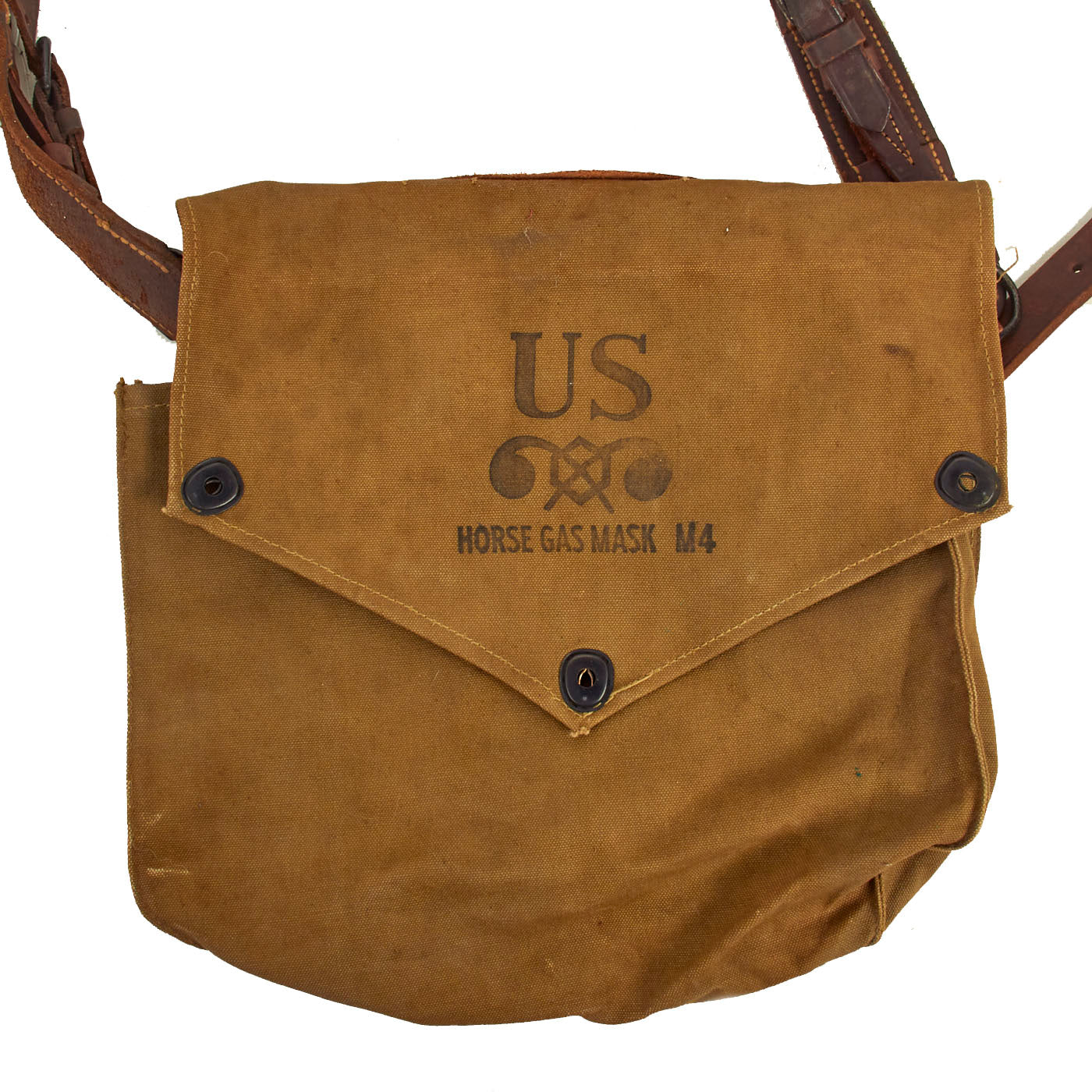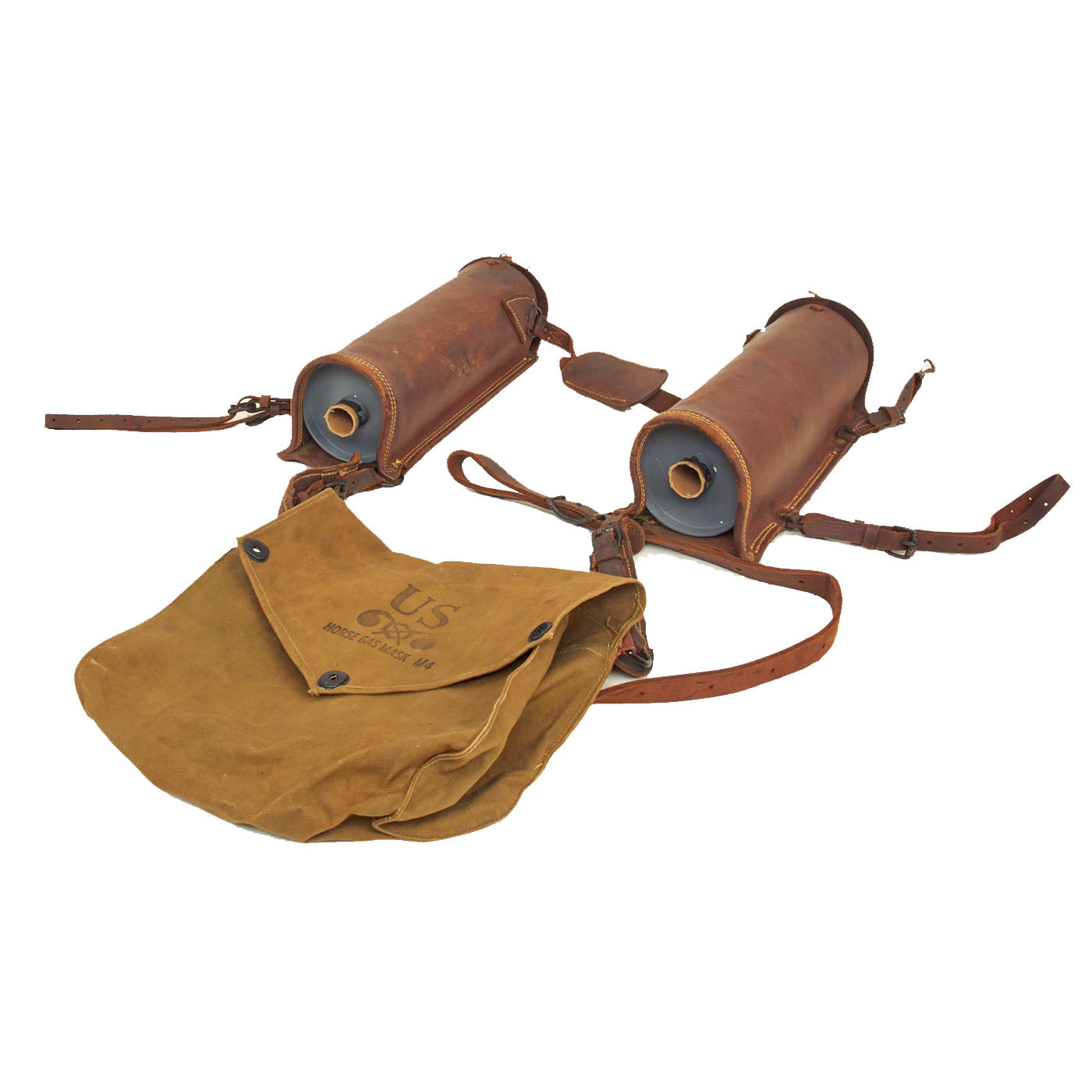 Original Items: Only One Set Available. Even without the actual gas mask, these items are still extremely rare and scarce to come by. In 1941 and 1942, the U.S. government issued the M4 gas masks for the horses being used in service. Surprisingly enough, this set still has the actual mask! Horses in the Cavalry and Pack Mules were not as common in WWII as they were in WWI, making the Horse Gas Mask all the more rare. The mask carrying case is in near mint condition with only minor staining to the canvas and minor staining around the brass fittings and buckles, leaving a greenish residue. The leather straps and buckles are in perfect working order and condition, displaying no damage or paint loss to the buckles and bales.