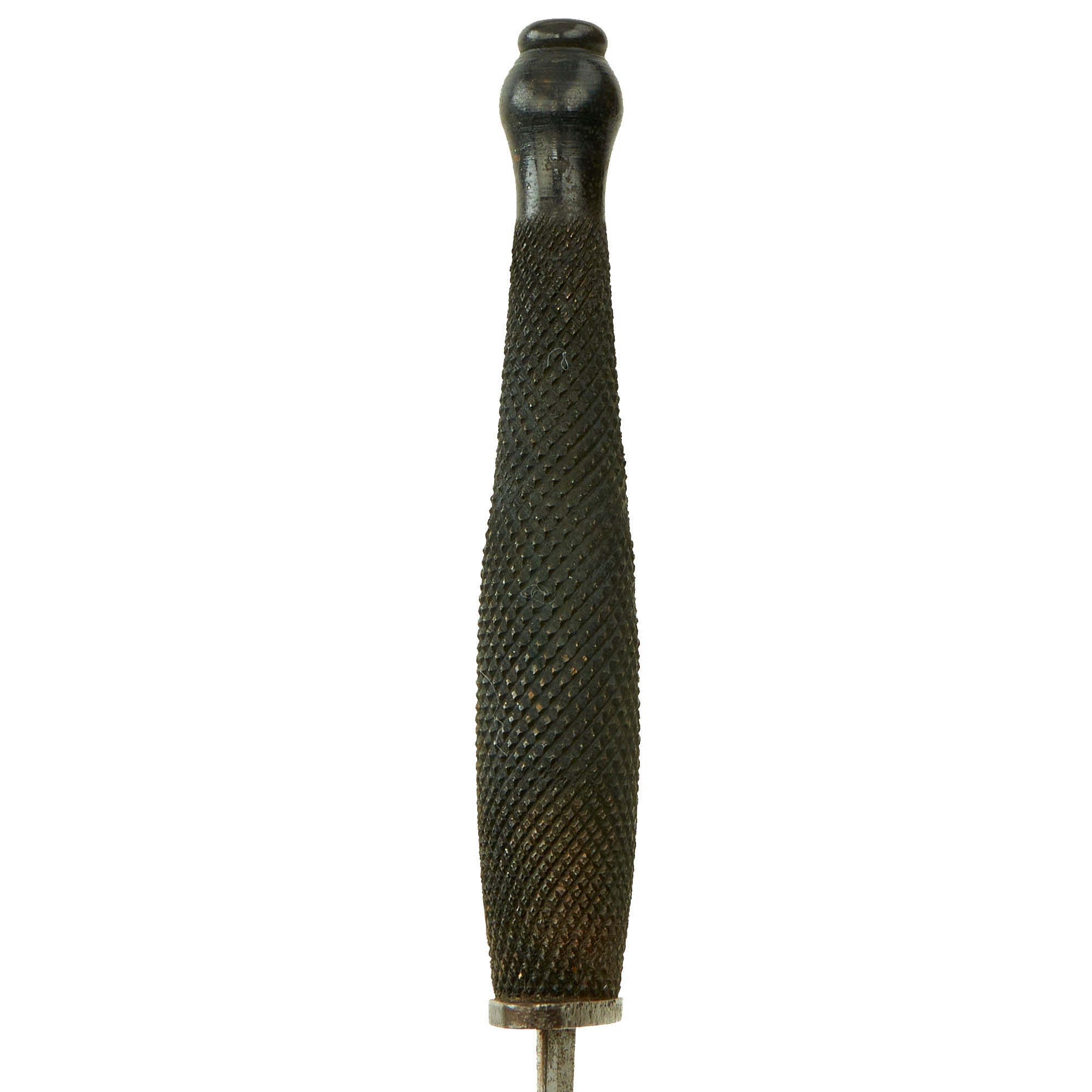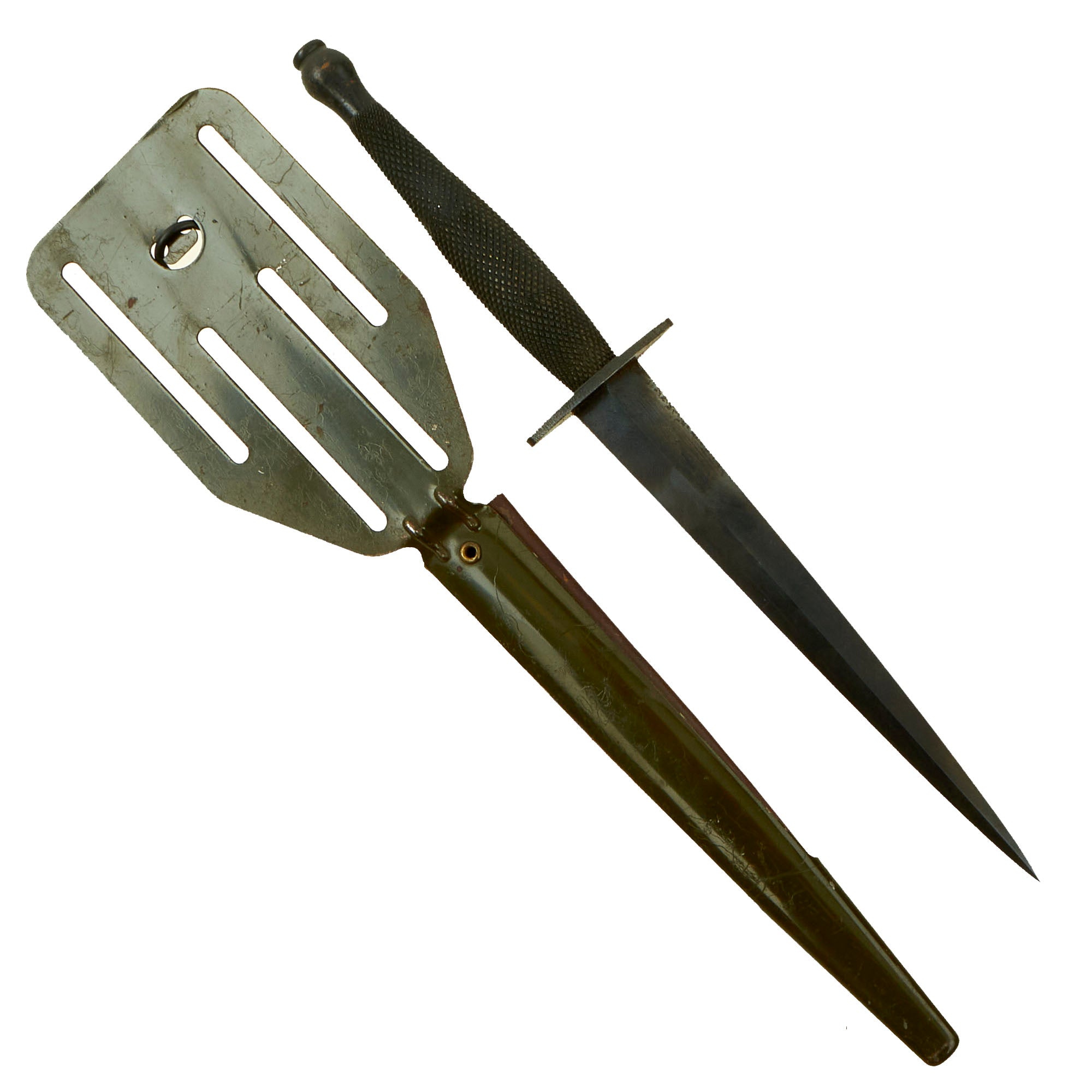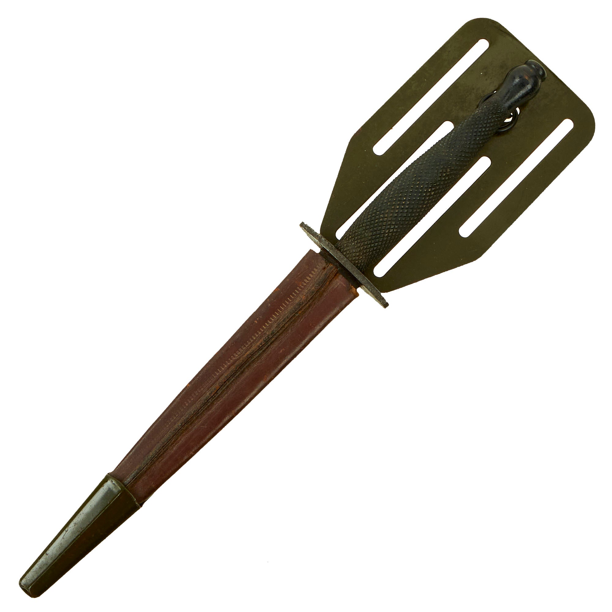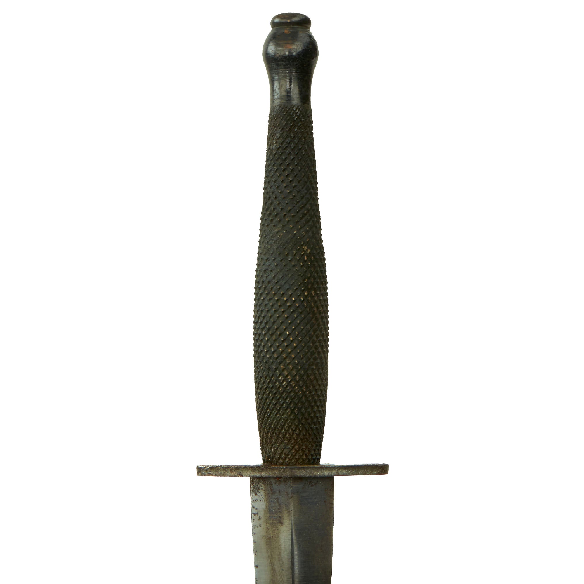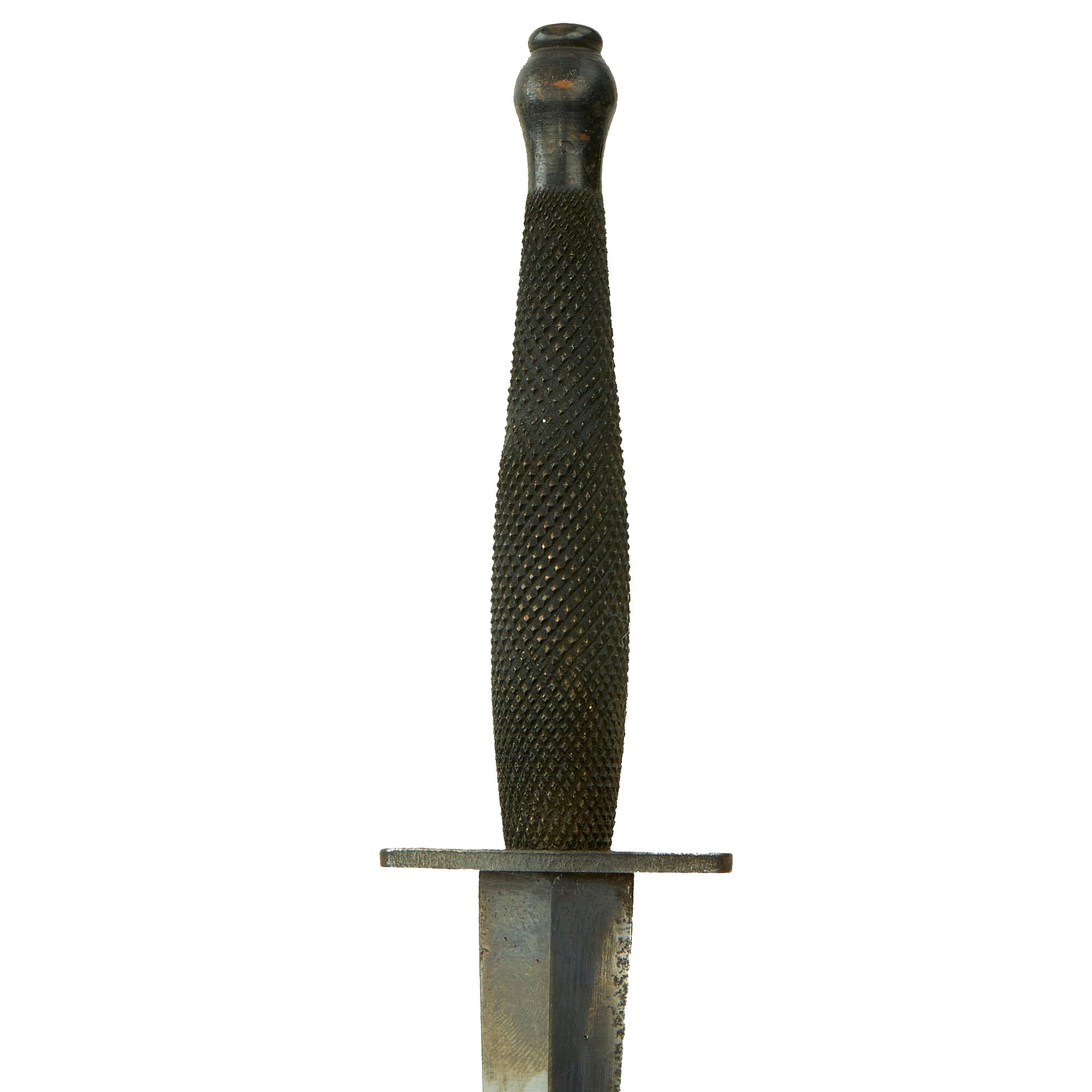 Original Item: Only One Available. Now it does not get better than this! This Fairbairn Sykes copy, known affectionately as the “Pancake Flipper,” is a rare knife produced between 1942–1943 and was believed to be manufactured by Landers, Frary, and Clark in New Britain, CT. There are no maker marks or any stamping on this knife which was logical to a clandestine weapon such as this. The stiletto was designed for members of the OSS (Office of Strategic Services), the American version of the British Special Operations Executive or SOE, operating deep in enemy territory, far from friendly lines.