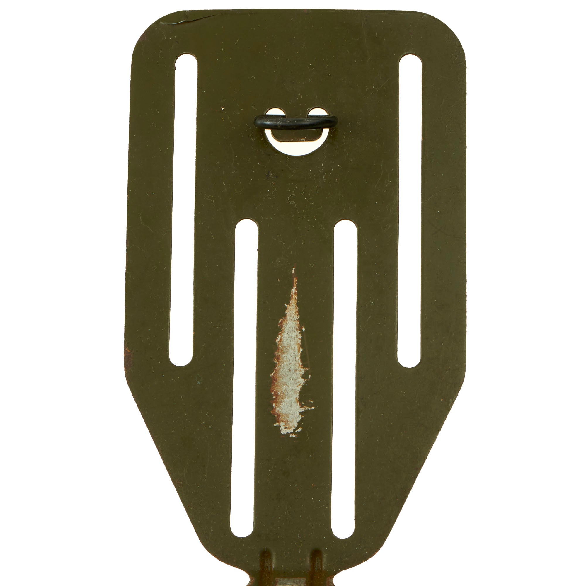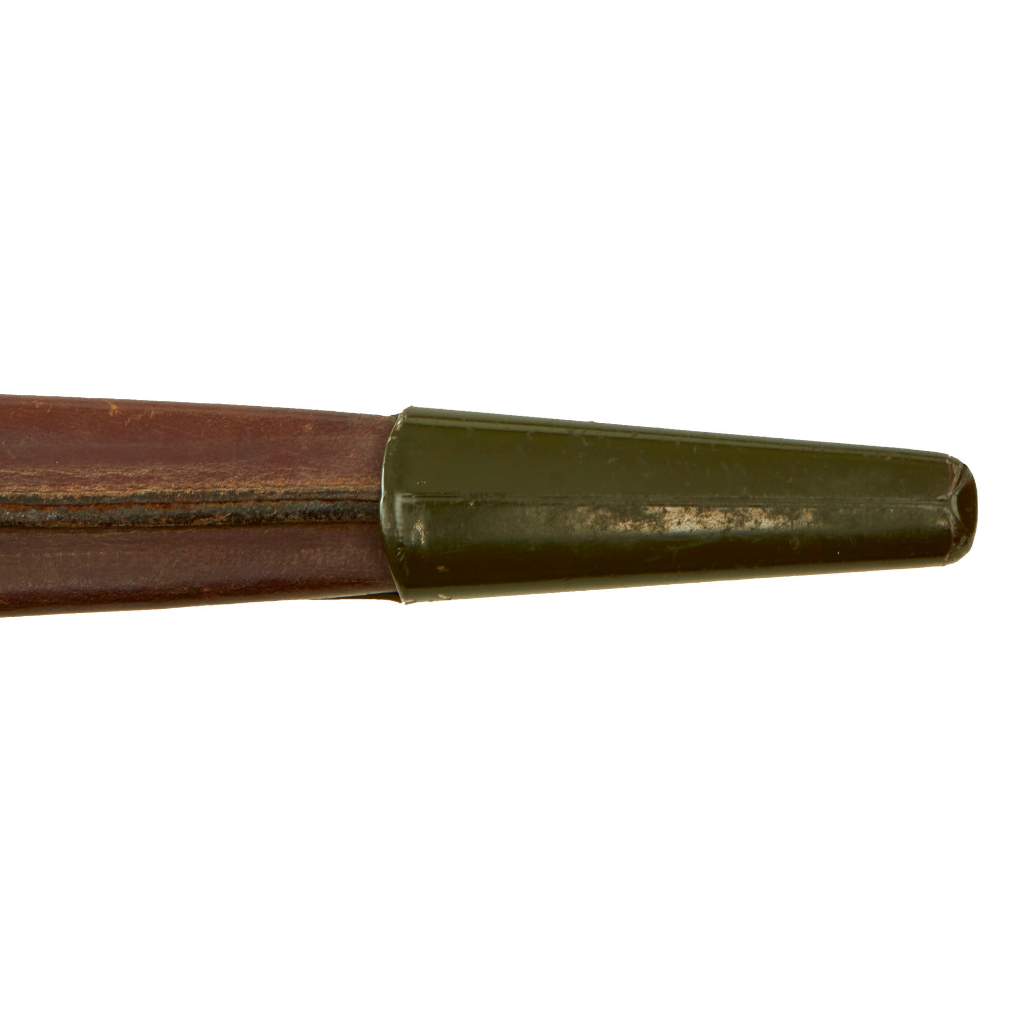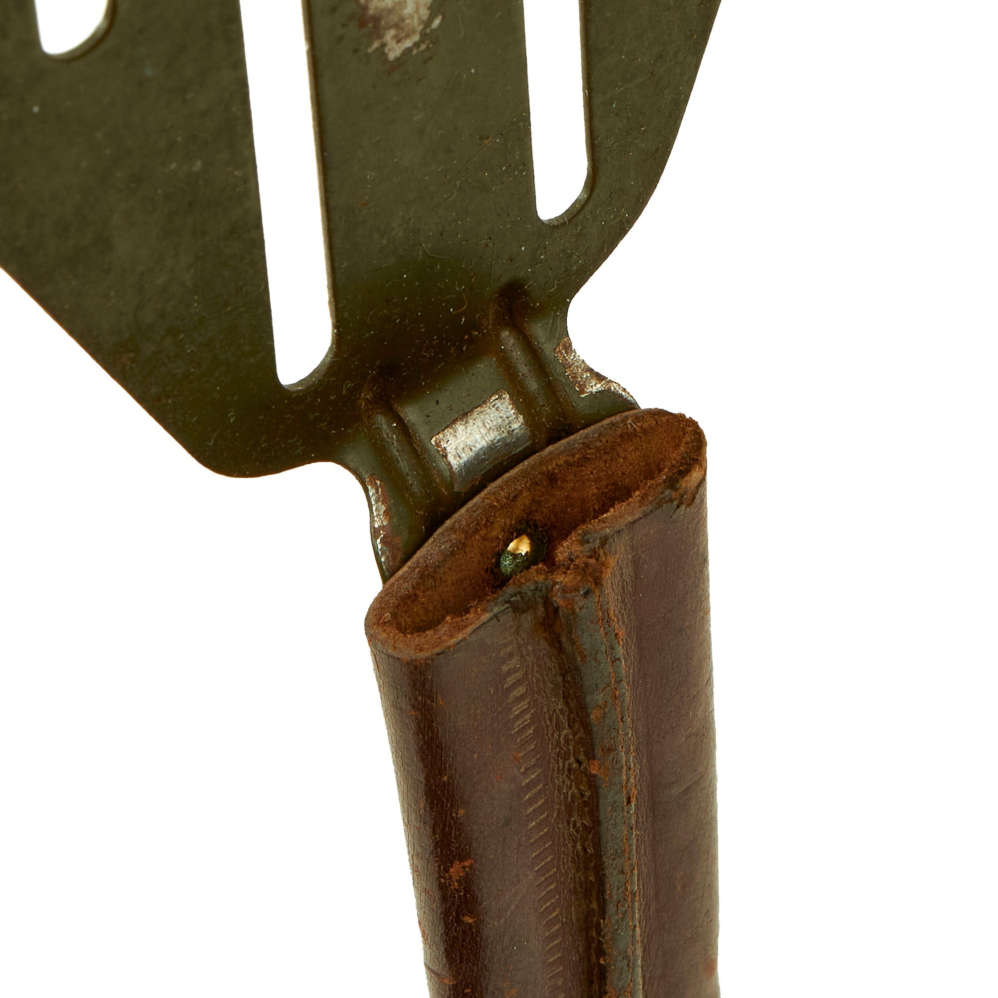 This rare fighting knife, with its equally rare M-6 sheath, shows signs of little to no use and the blade retains nearly 100 percent of the original finish. The "pancake flipper" frog for the M-6 sheath is still in original configuration and has not been cut down like other examples we have seen. I don't believe you could ever find a nicer example than this one! The knurled brass grip retains 99% of its original blackening, with some light wear to the pommel area revealing some bare brass. The brass grommet holding the leather sheath to the frog is present but no longer holds the two together tightly. The leather is in excellent condition as well as the frog. The OD green paint on the frog still covers about 98% of the metal, with some wear in certain spots like through the belt loops.