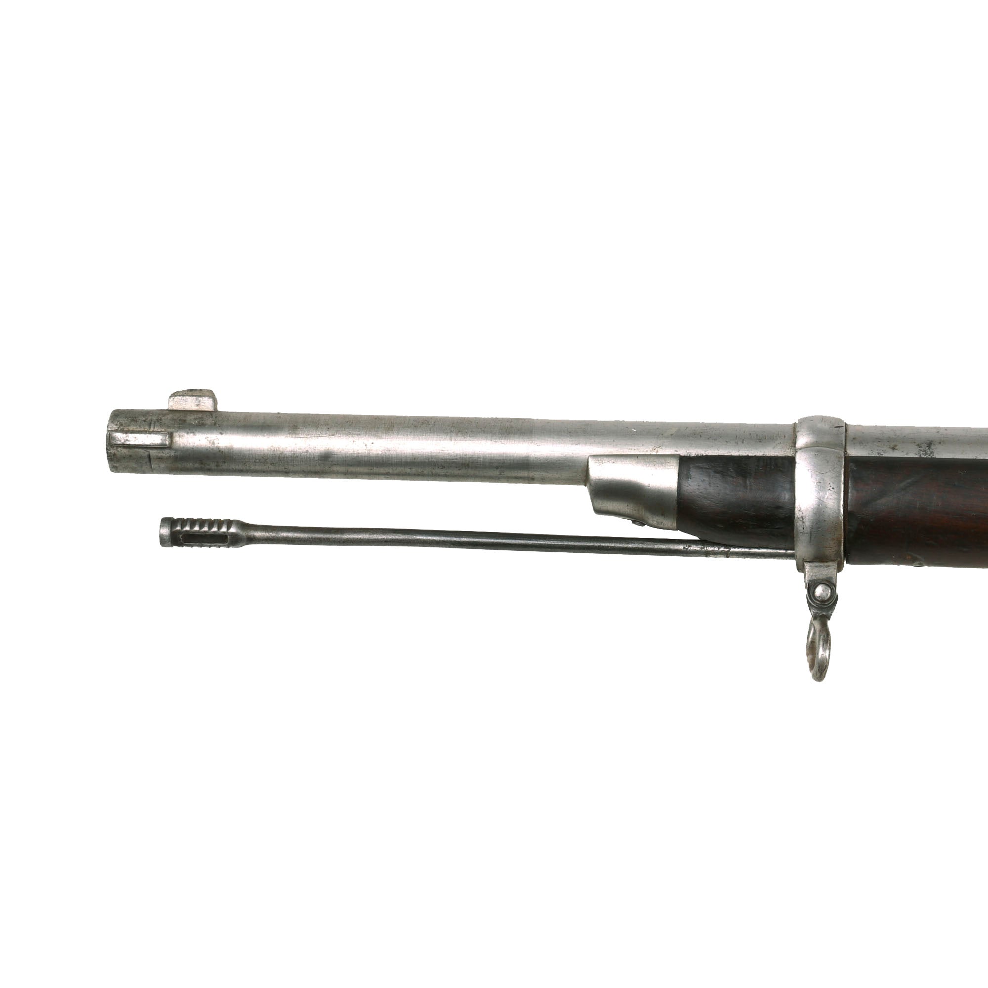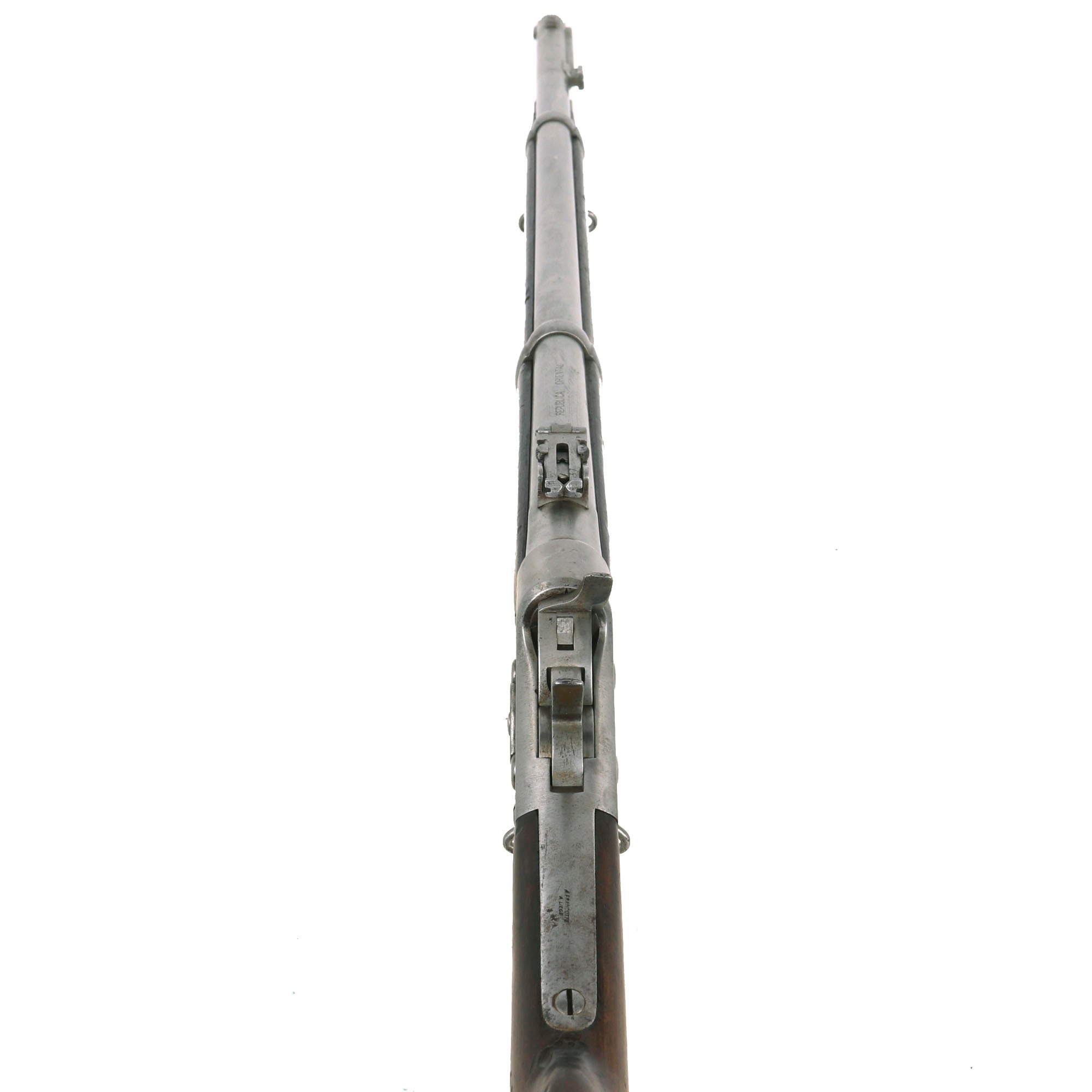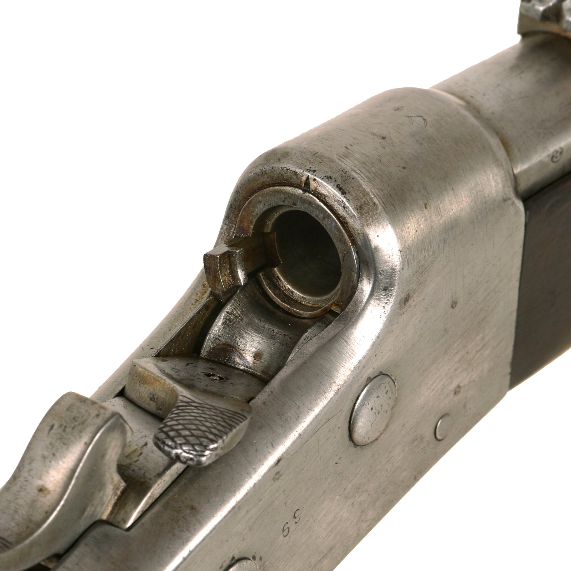 The rifle is complete with its cleaning rod and reverse ladder back sight, which is fully functional. The metalwork overall shows some fading and oxidation to the original bright finish, as well as wear from use and cleaning. There is some evidence of past oxidation in areas, but no major pit rusting. The action cycles correctly, with a crisp dry fire, and the firing pin retractor is fully functional. The ejector presents when the breech is opened, though we have not tested it on spent brass. The bore is in very good condition, with a bright finish showing crisp lands and grooves. There is just a bit of wear to the lands, and a bit of past fouling in the grooves.