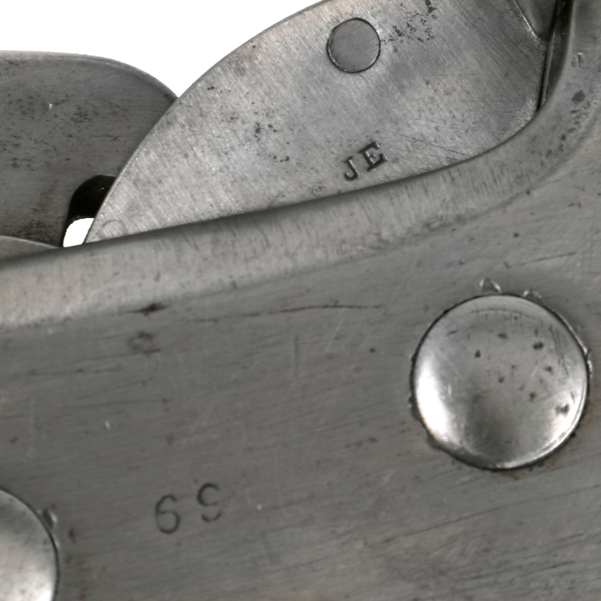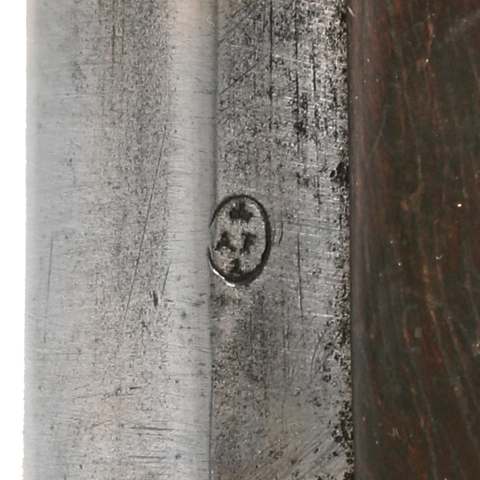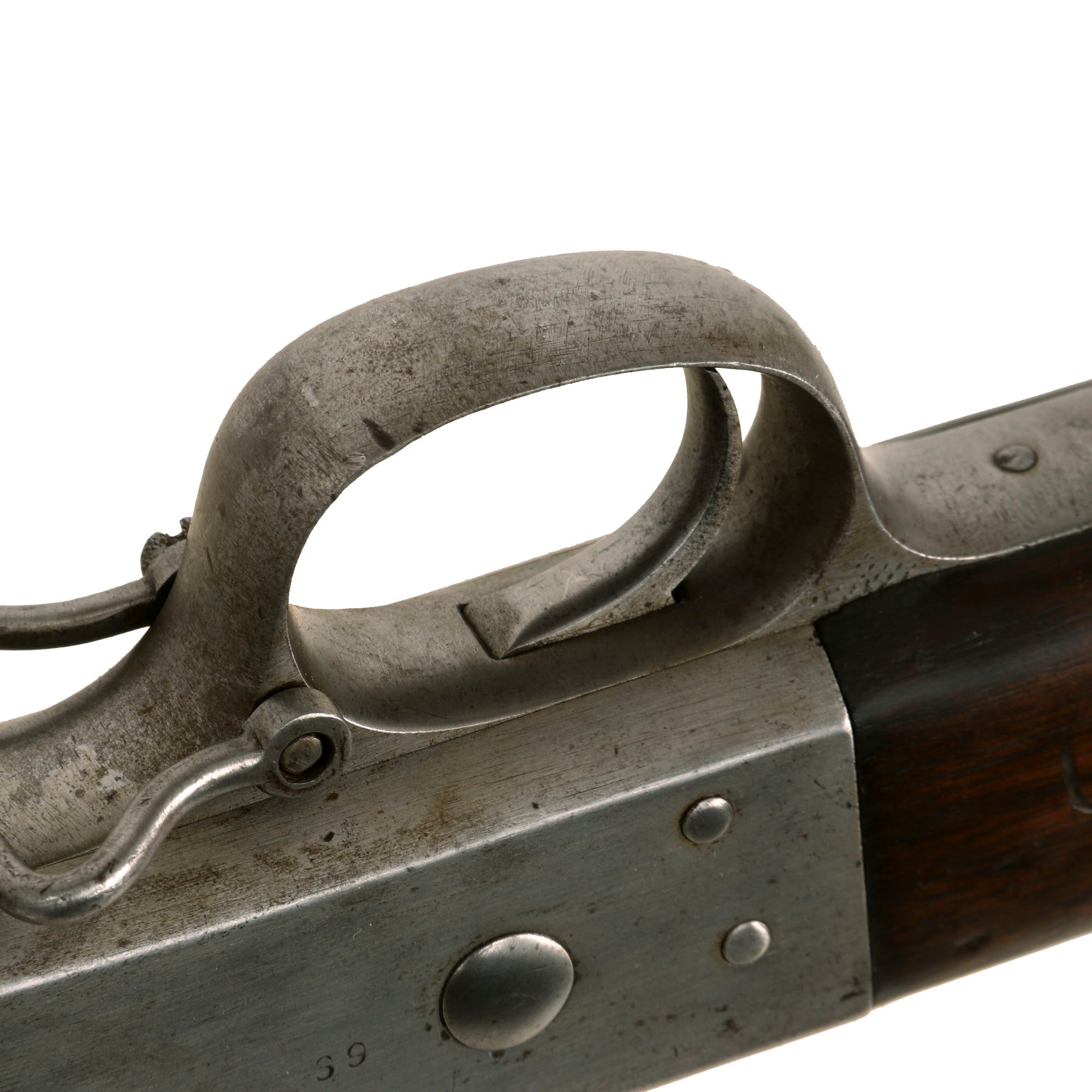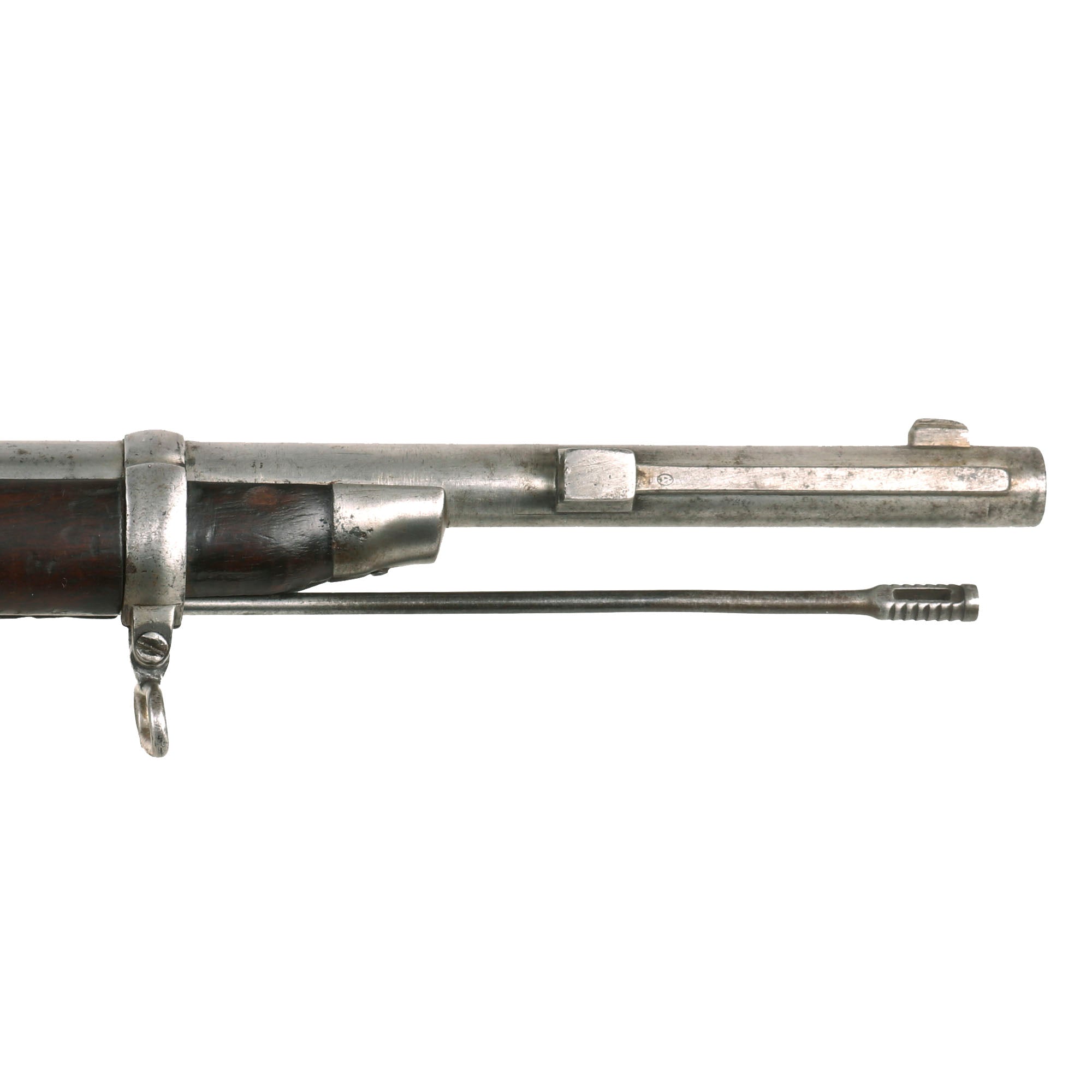 The rifle is complete with its cleaning rod and reverse ladder back sight, which is fully functional. The metalwork overall shows some fading and oxidation to the original bright finish, as well as wear from use and cleaning. There is some evidence of past oxidation in areas, but no major pit rusting. The action cycles correctly, with a crisp dry fire, and the firing pin retractor is fully functional. The ejector presents when the breech is opened, though we have not tested it on spent brass. The bore is in very good condition, with a bright finish showing crisp lands and grooves. There is just a bit of wear to the lands, and a bit of past fouling in the grooves.