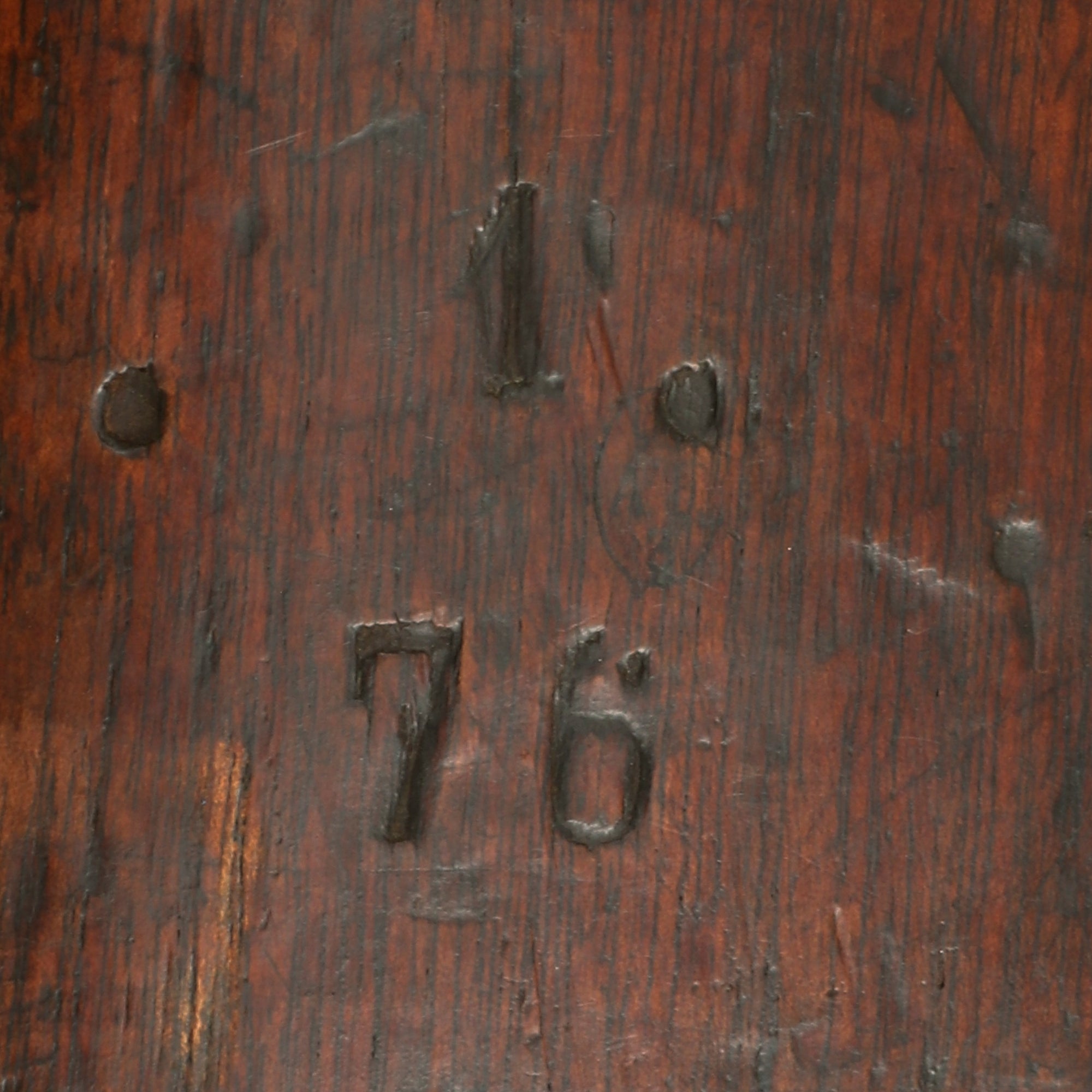 There are also Belgian proof markings on various components, as well as a small CROWN / AF on the right side of the barrel nocks form, the marking for Francotte. There is a 69 stamped on the right side of the receiver, and we removed the butt stock, and the receiver is marked on the top tang and trigger guard with serial number 116. There was originally a "crossed cannons" marking on the top of the chamber, but that is mostly worn away now.