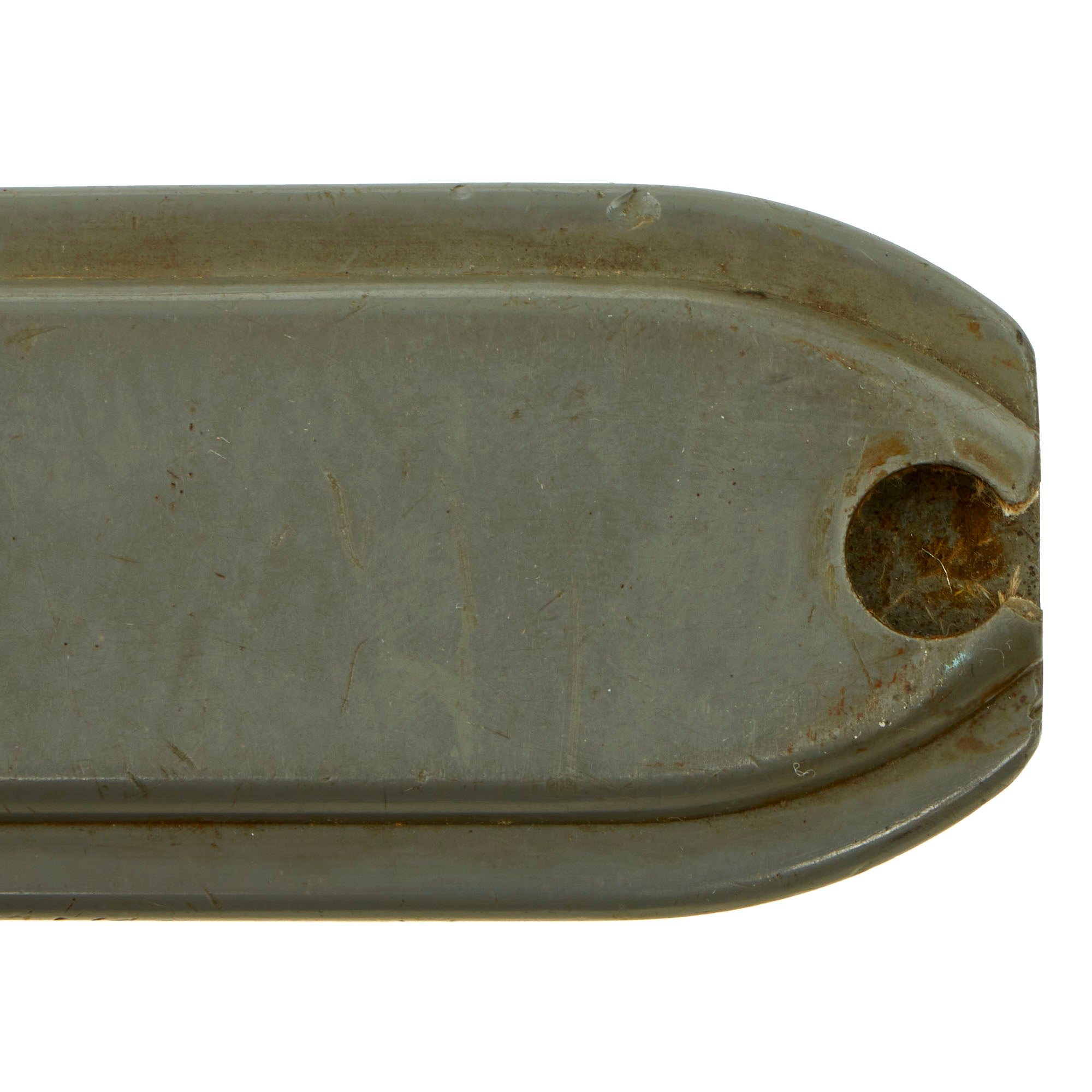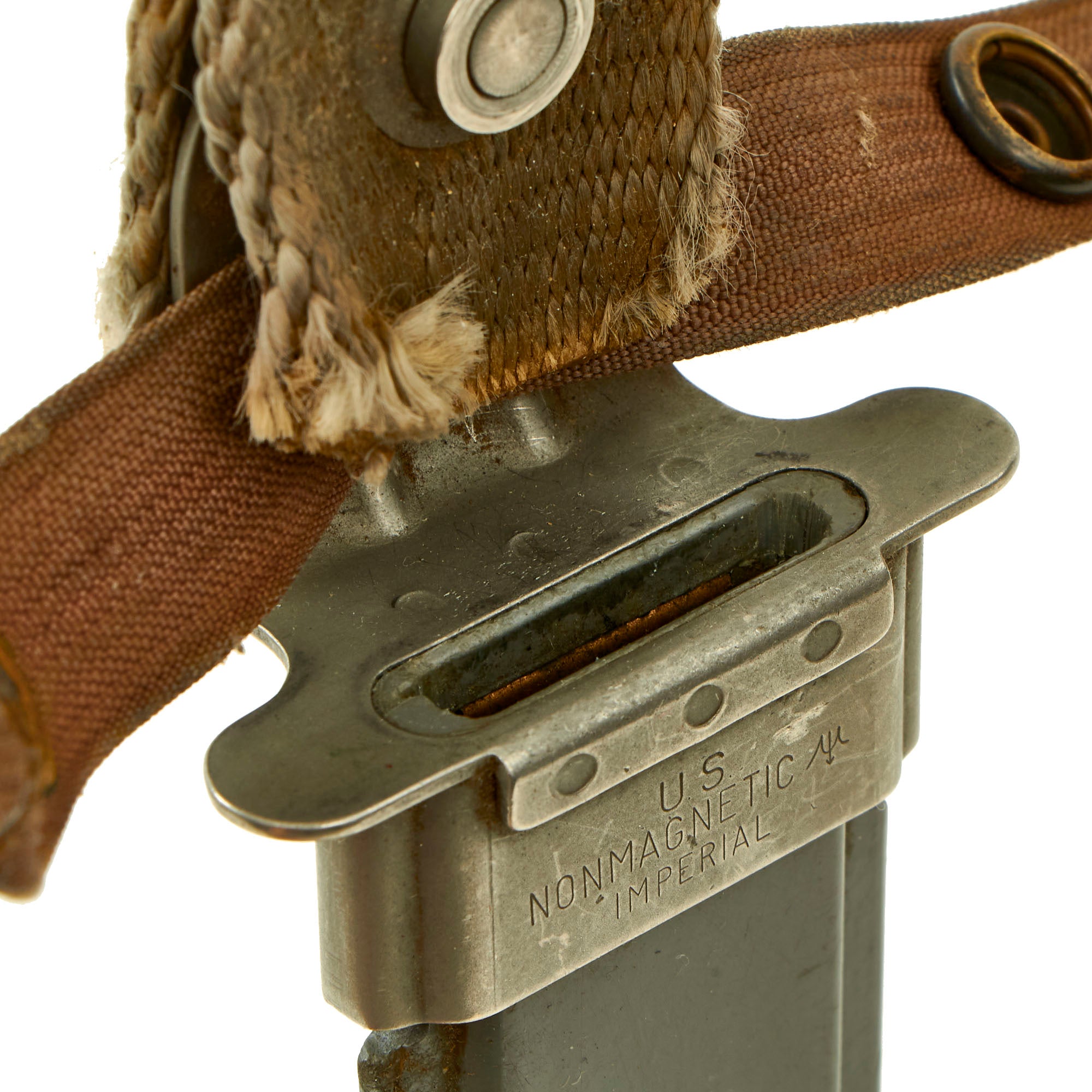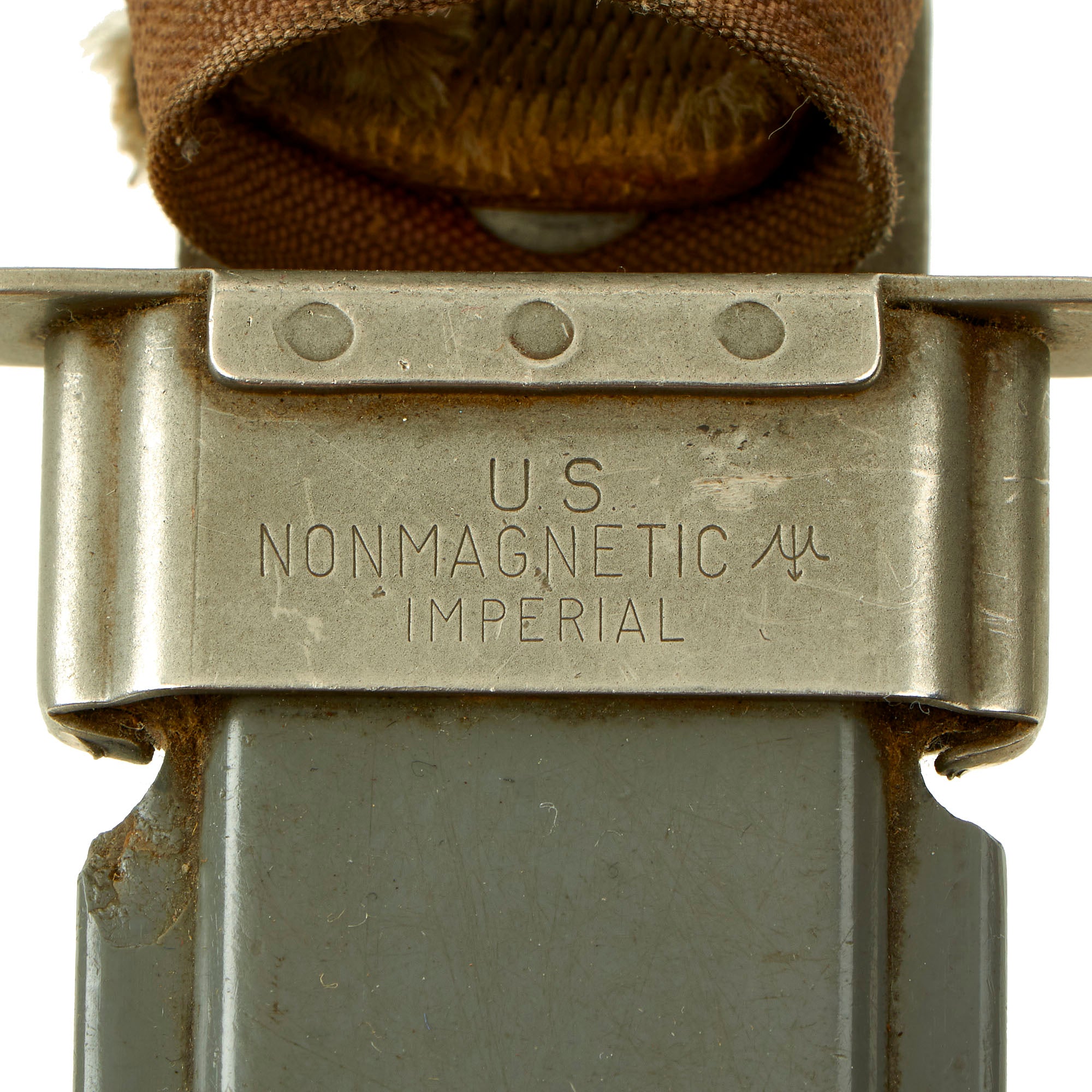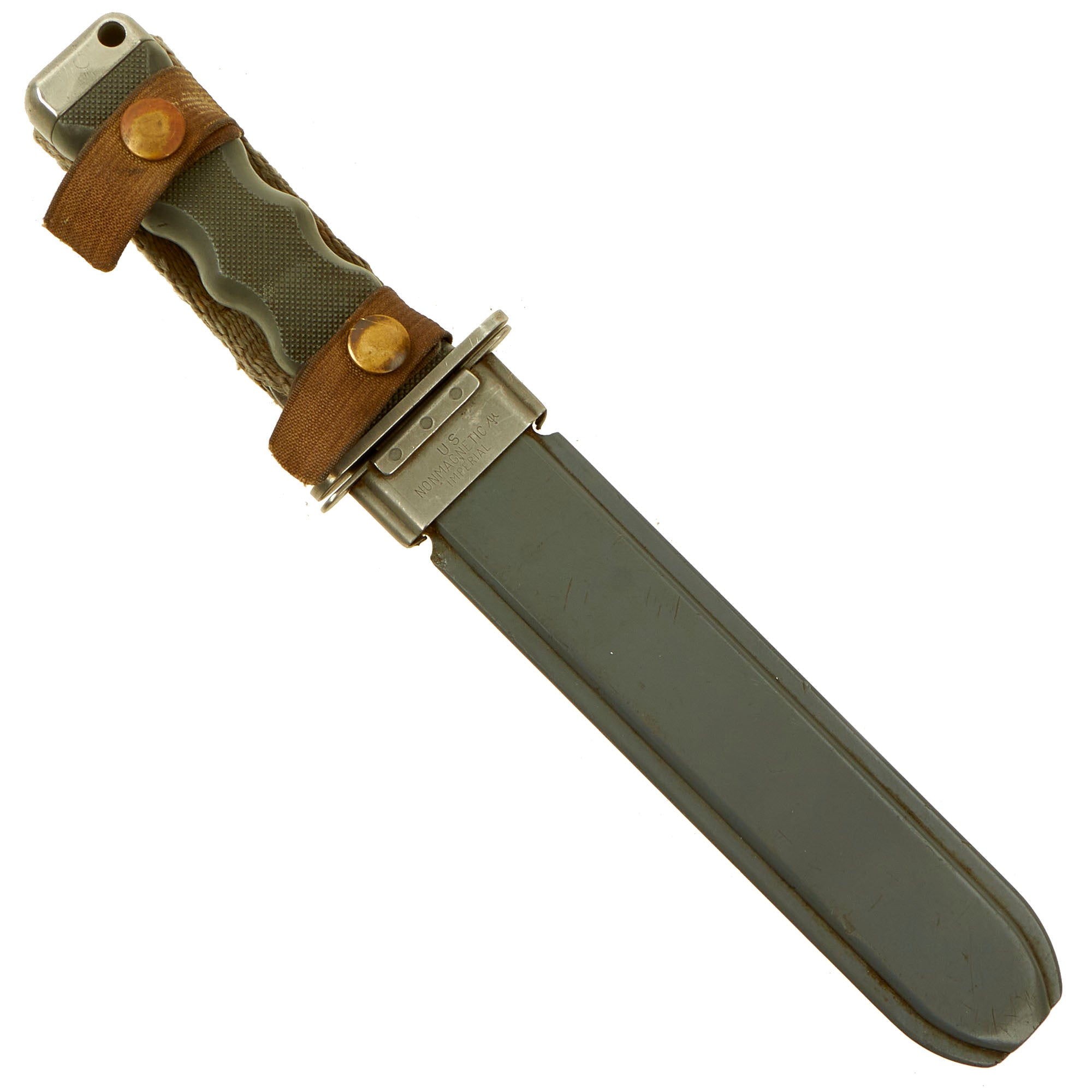 The Scabbard is marked on the throat U.S. / NONMAGNETIC / IMPERIAL. The scabbard shows equal amount of use, with some accumulated dirt/grime on the securing straps, and some wear to the belt loop from being carried. The sheath body itself has numerous surface scratches which are to be expected. The snaps and swivel all work perfectly.