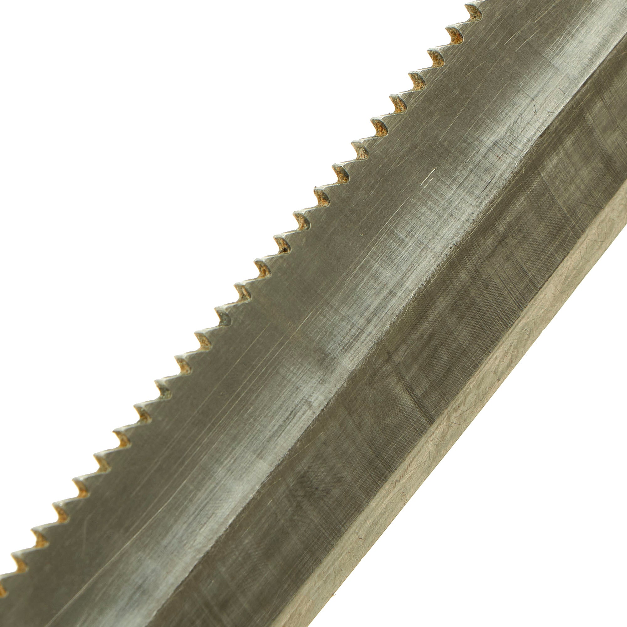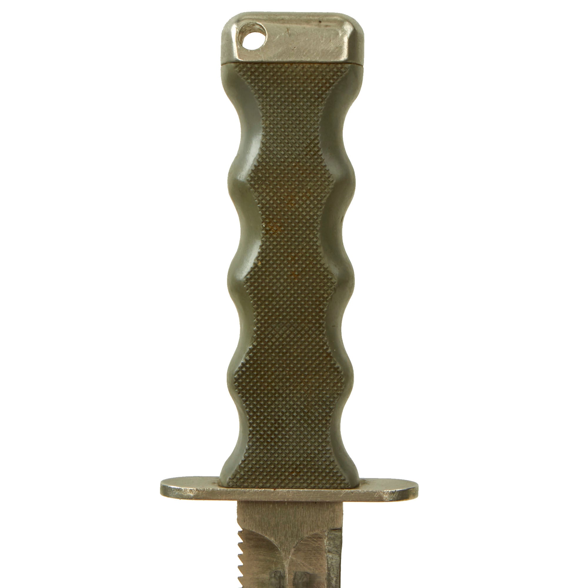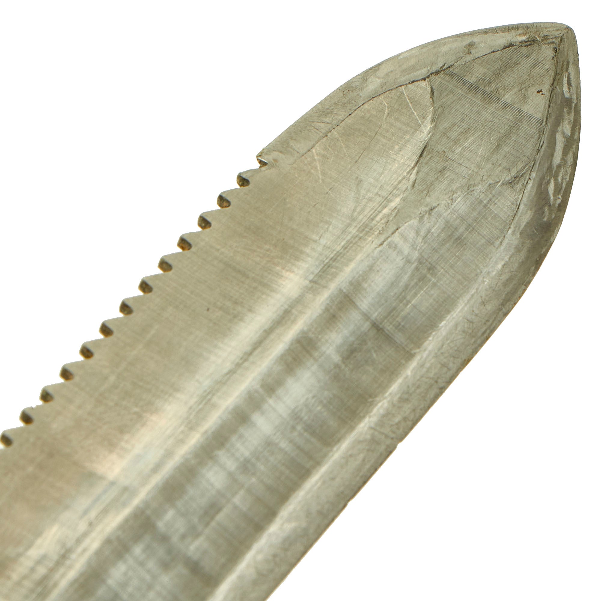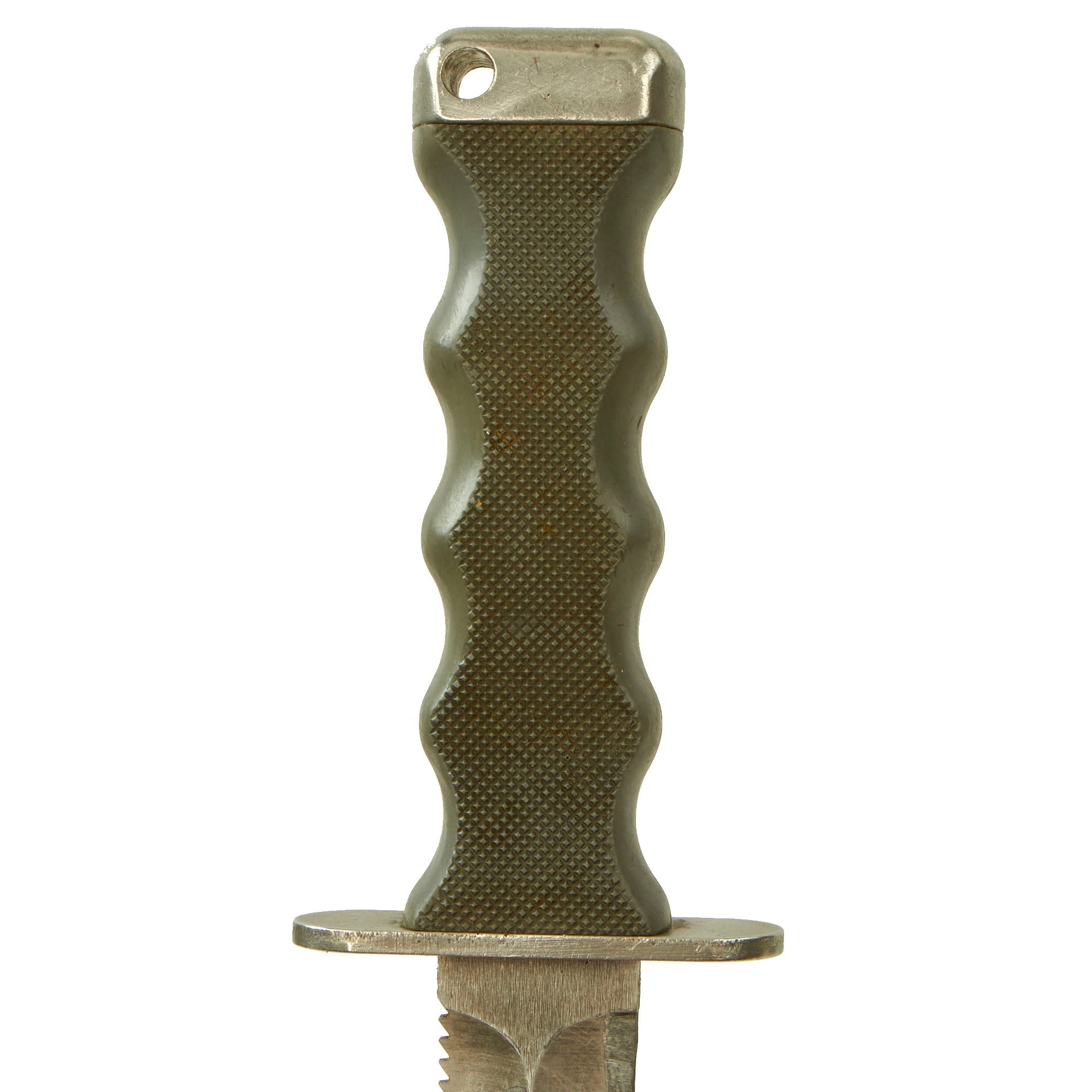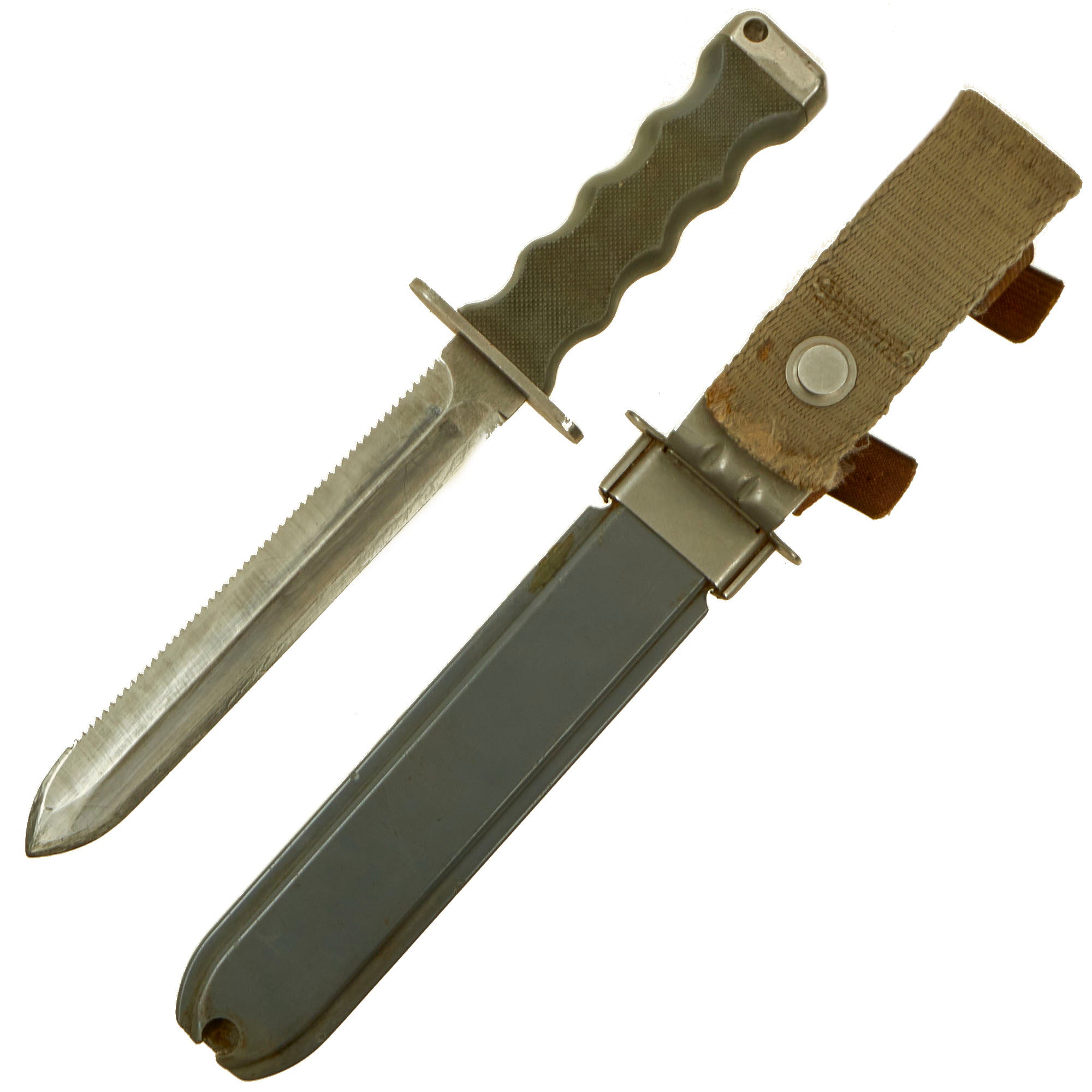 The Knife is made of Haynes Alloy no. 25 which is Copper-Chromium-Tungsten-Nickel Alloy, similar to Stellite. It is non-magnetic, non-sparking and non-rusting even in seawater, yet unlike many other non-ferrous metals like the titanium used in other high grade combat knives, it has the ability to be hardened to allow it to hold a cutting edge with a Rockwell “C” scale value of 53 to 54 which is per the final Naval specification. The specification also stated that the saw edge of the knife be capable of cutting through steel cable that the Diver may encounter on a mission. The Knife and Scabbard set had to pass a magnetic test of under 0.1 millioersted to be accepted per the Milspec.