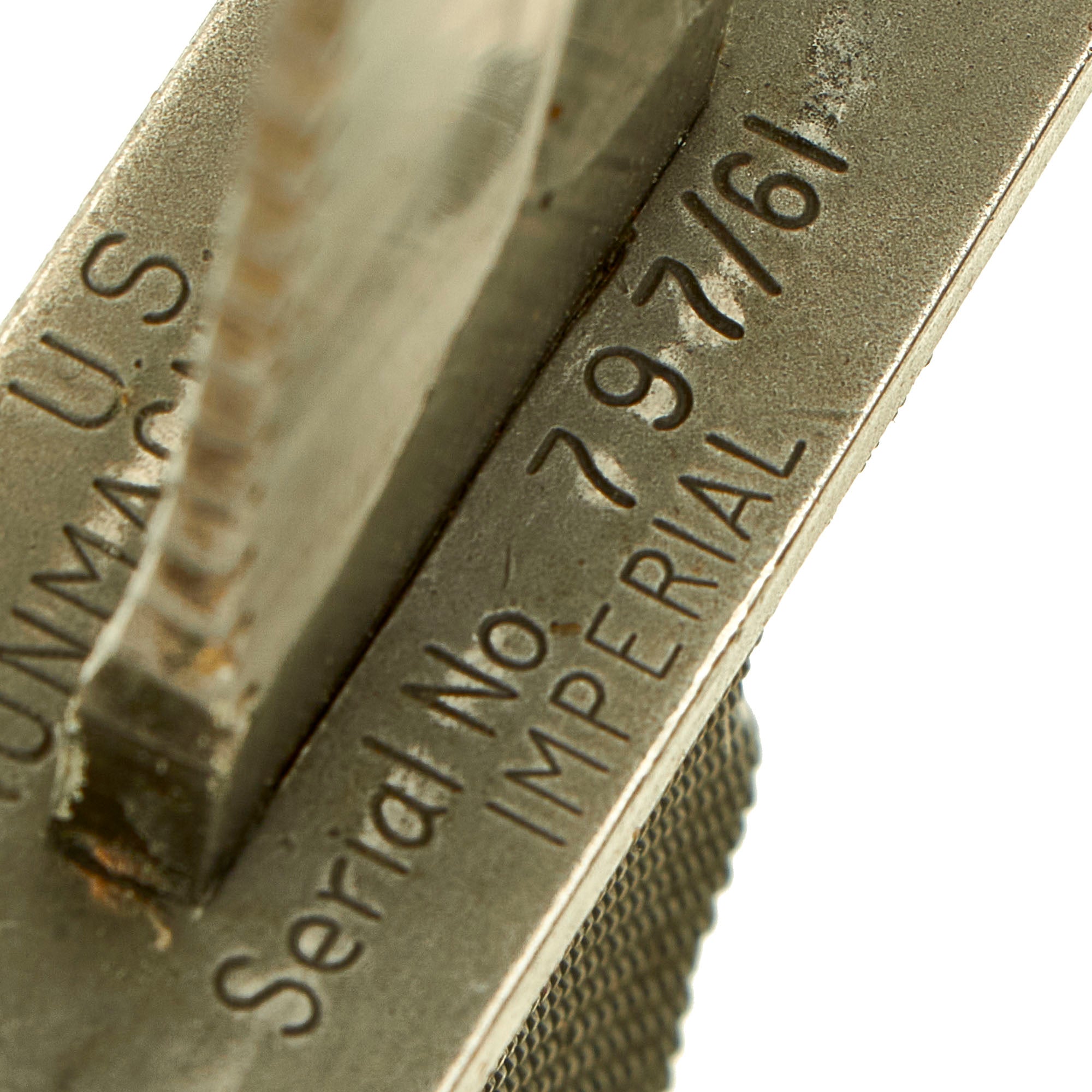 This indicates that it was knife number 797 produced in 1961. The original plastic grips are in very good condition, only showing some light scratching and honest wear from use.