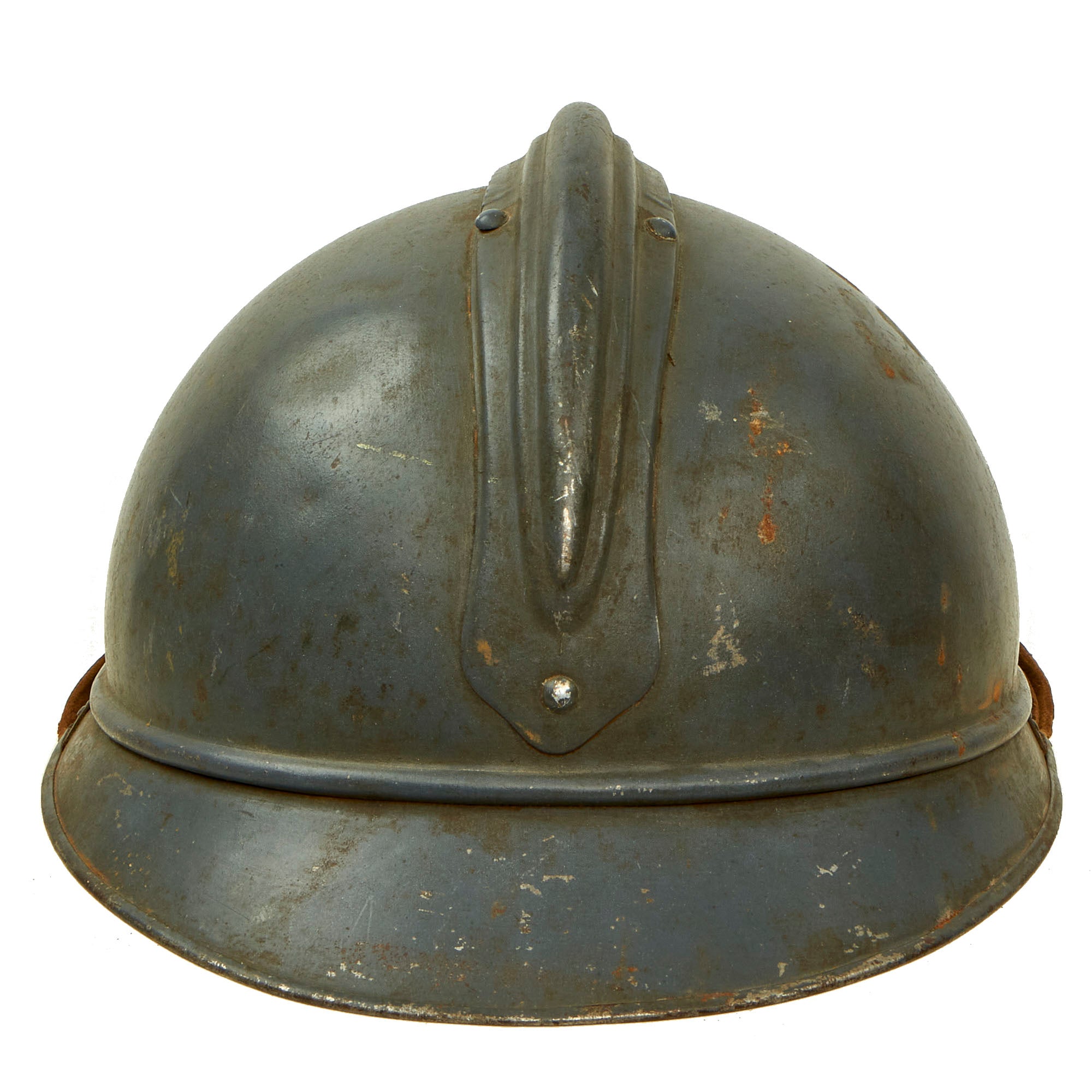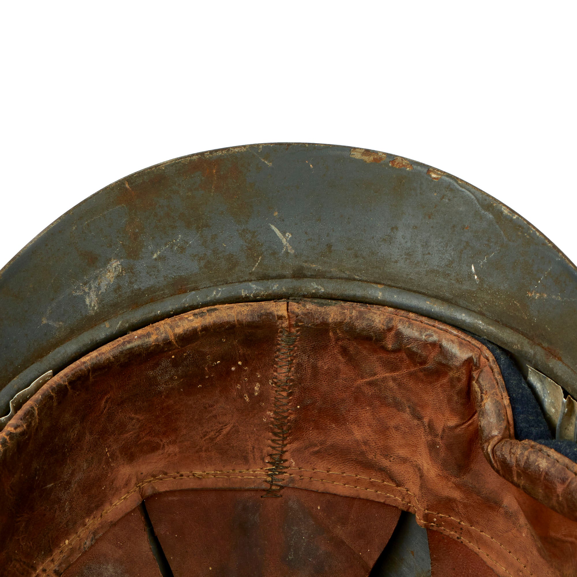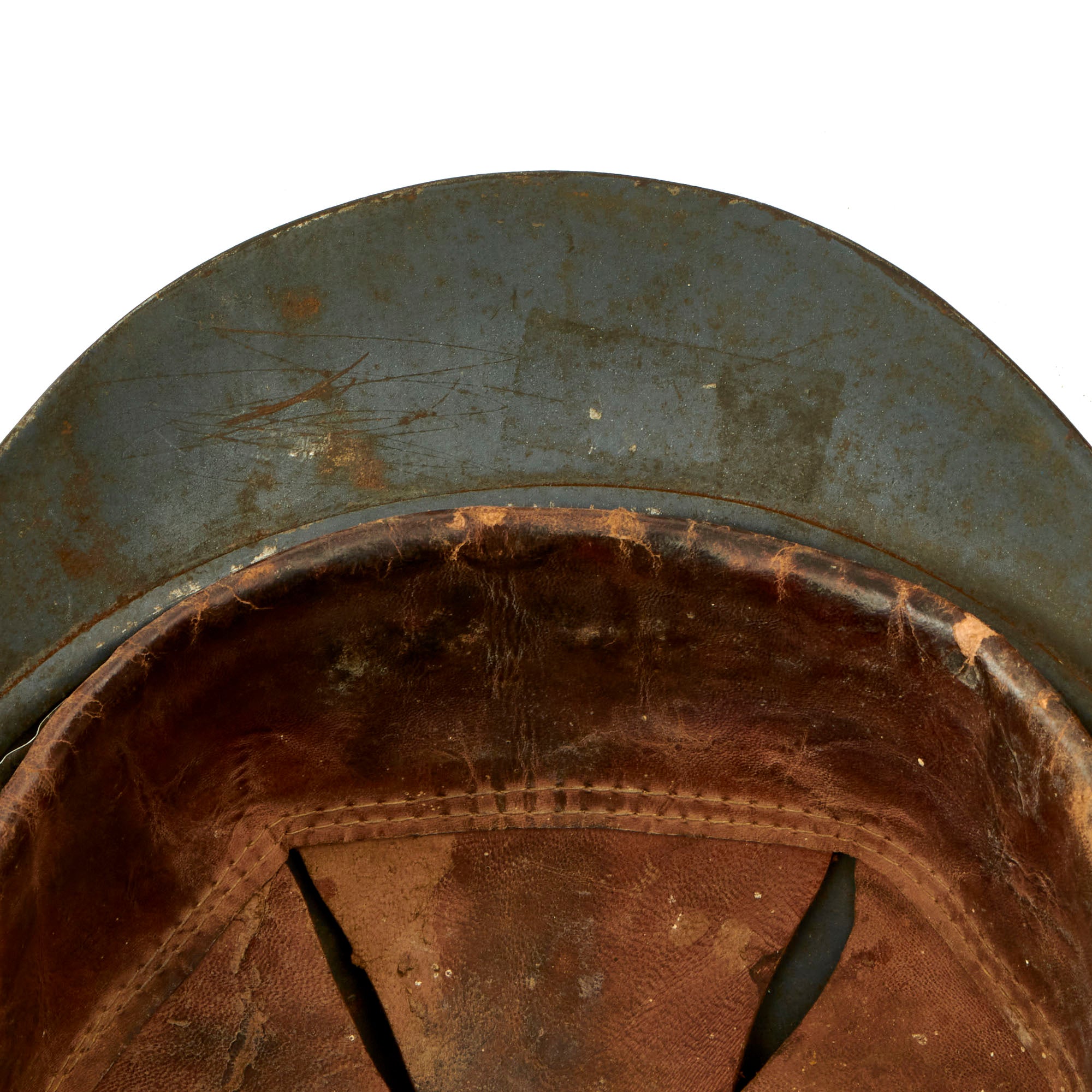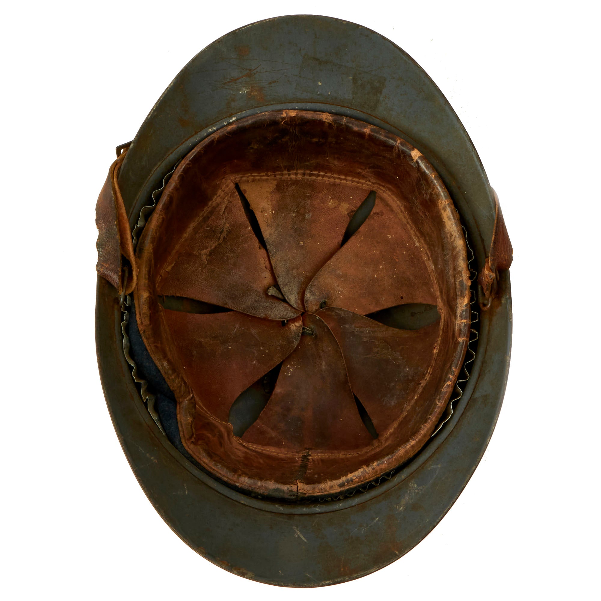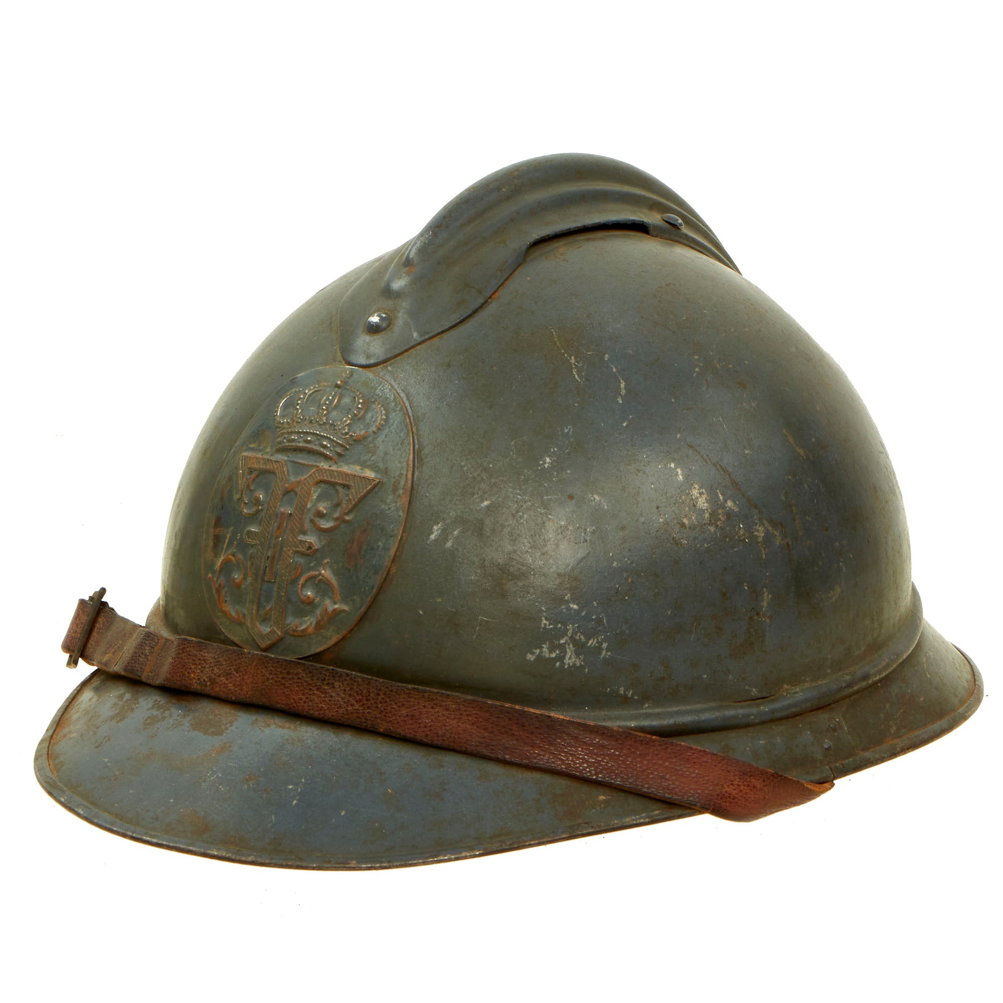 Original Item: Only One Available. This is an absolutely outstanding example of a very rare WWI Romanian M-1915 Adrian Helmet, which is one of only 90,000 that were delivered to and used by Romania in 1917. The badge is the first variation with "King Ferdinand I" and the background cypher of "King Carol I" which was placed in memory after his death in 1914. This helmet was used in WWI to 1923, after which they were repainted green. To find one in the original French horizon blue with a clear badge in this condition is an absolutely incredible find!