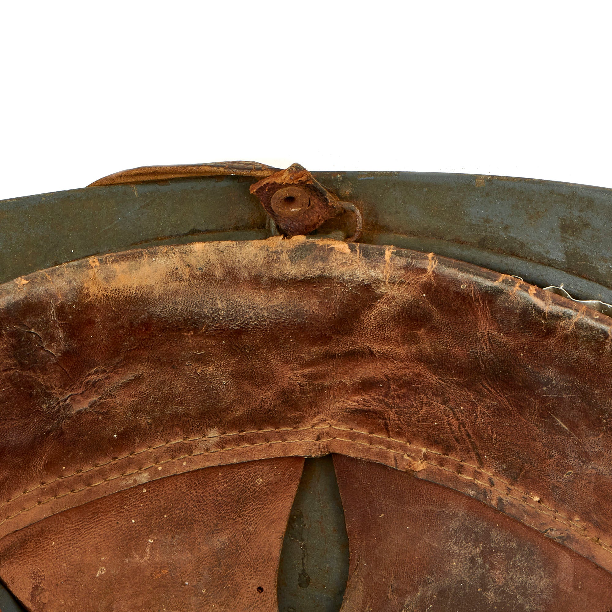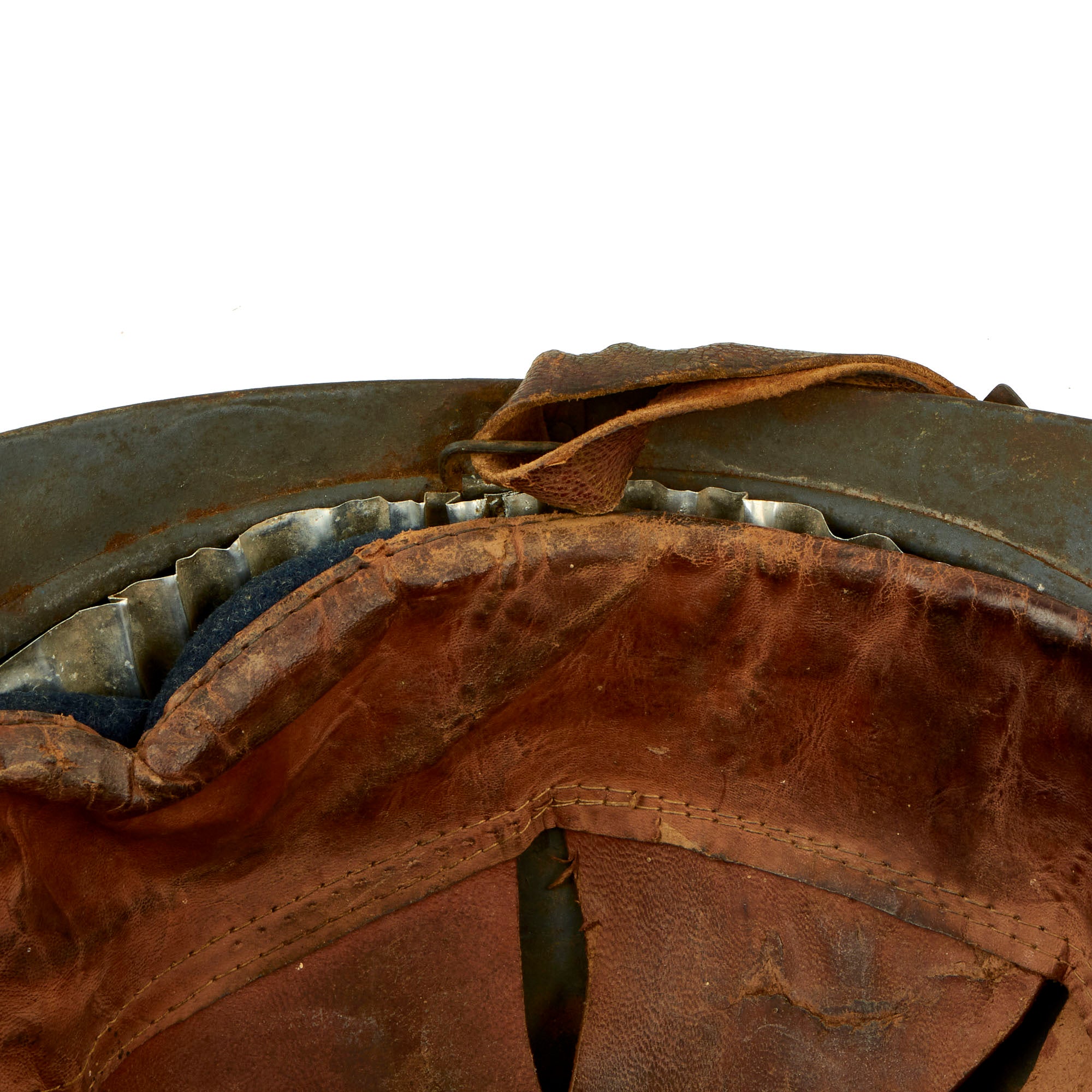 The helmet is in absolutely beautiful, untouched, condition with its original Horizon Blue paint intact. The badge is original to the helmet, showing evidence that it has been in place since the helmet was made! The 2nd Pattern leather liner is present and excellent condition, still retaining its original brown color, aluminum spacers, and even crown adjustment cord! The original chinstrap is intact, and remarkably unbroken! Overall, the condition is excellent!