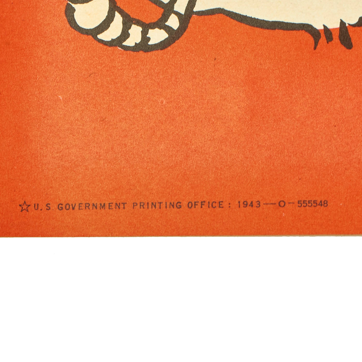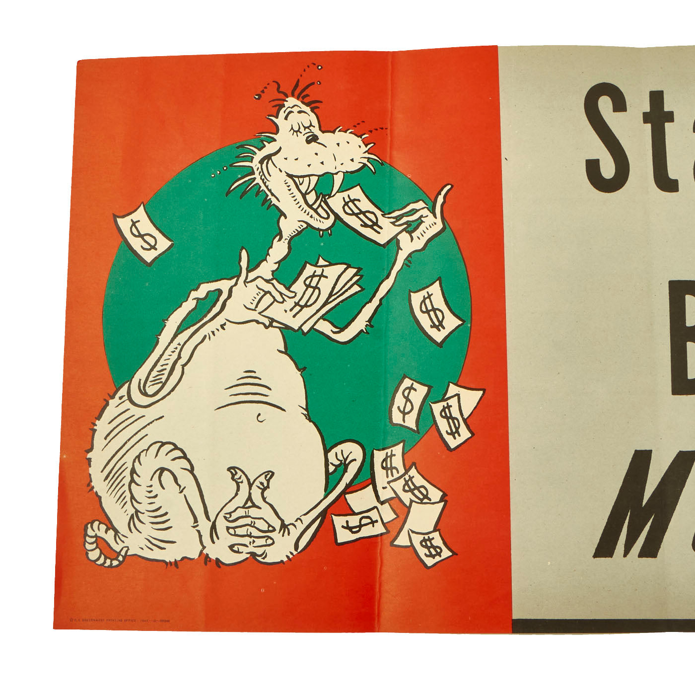 Original Item: Only One Available. These posters with the early artwork of Dr. Seuss (Theodor Seuss Geisel) featuring his rendition of “The Squanderer Bug” are some of the absolute rarest of U.S. Posters of World War Two. This particular poster dates from 1943, and measures approximately 11 ½” x 45 3/4”. The Poster comes in excellent original condition, with great color and only minor wear. No tape or pinhole marks are on the poster at all. One minor crease across the poster when it is fully folded, This is an exceptionally rare poster, and in excellent condition to boot!