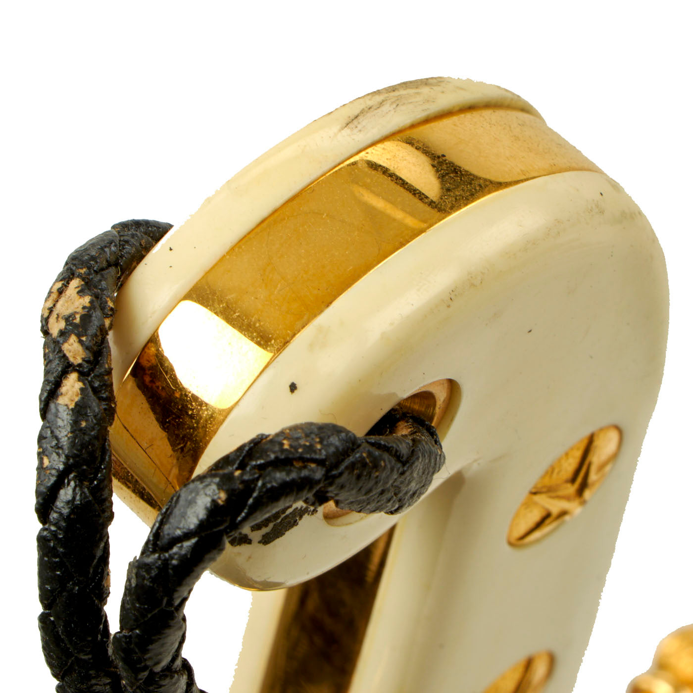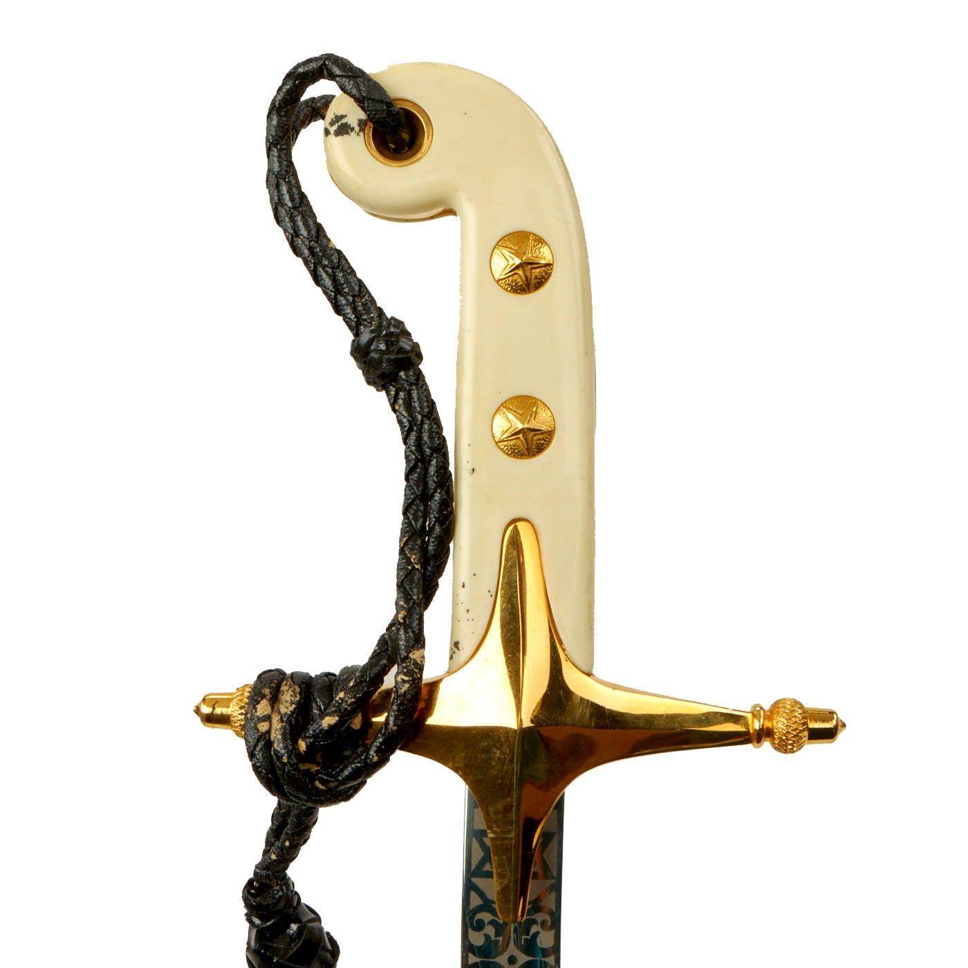 Original Item: Only One Available. Here we have a very nice recent issue USMC Officer's Mameluke sword, complete with its original scabbard and travel case, in very good condition. The sword features lovely ivoroid grip scales that are still in great condition, with no yellowing, cracks, or chips. Sword alone is approximately 33 ½” long overall and in scabbard is approximately 35“ overall. Blade is approximately 28" long, curved, and unsharpened.