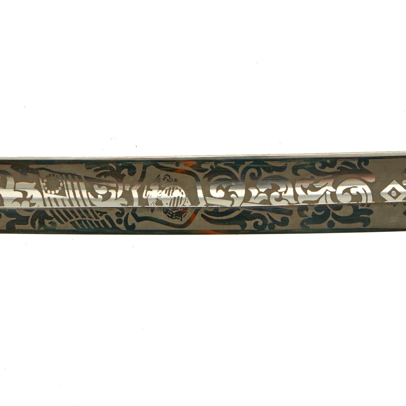 Overall condition is excellent, with just a bit of oxidation and verdigris on the brass components of the handle. Scabbard is also in great shape, with both of the original hanger rings, as well as the brass throat. There is a bit of speckling on the scabbard plating, which looks to be chrome.