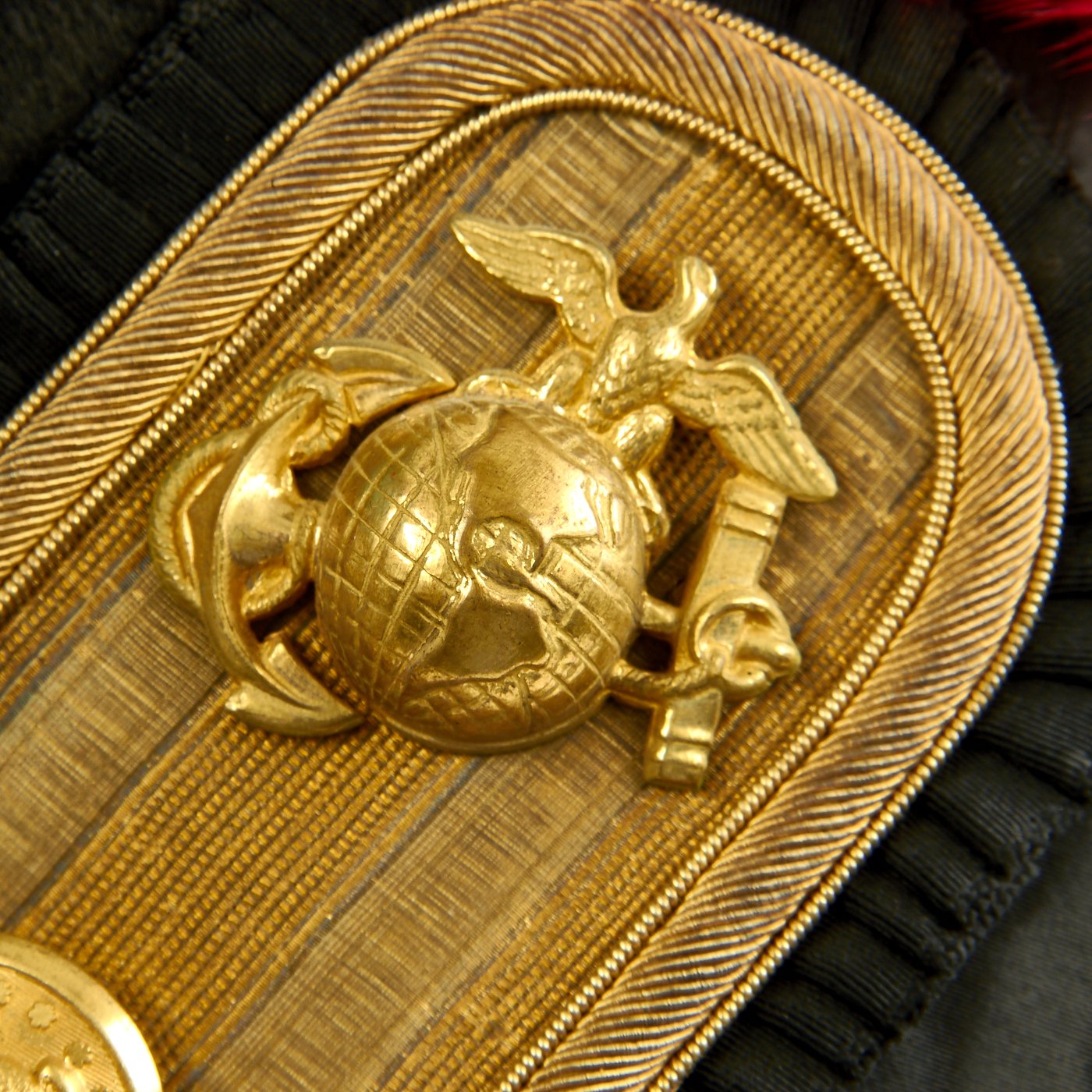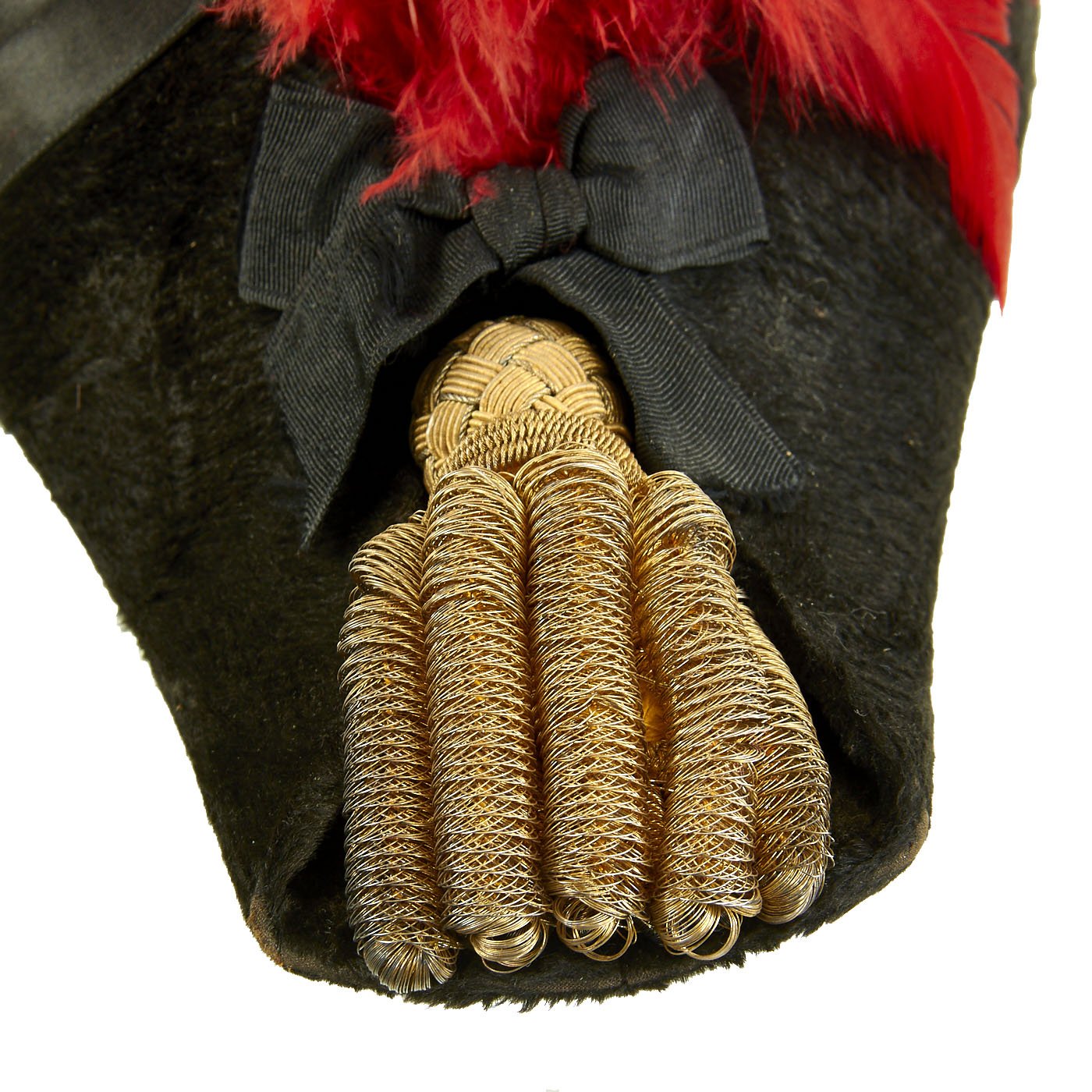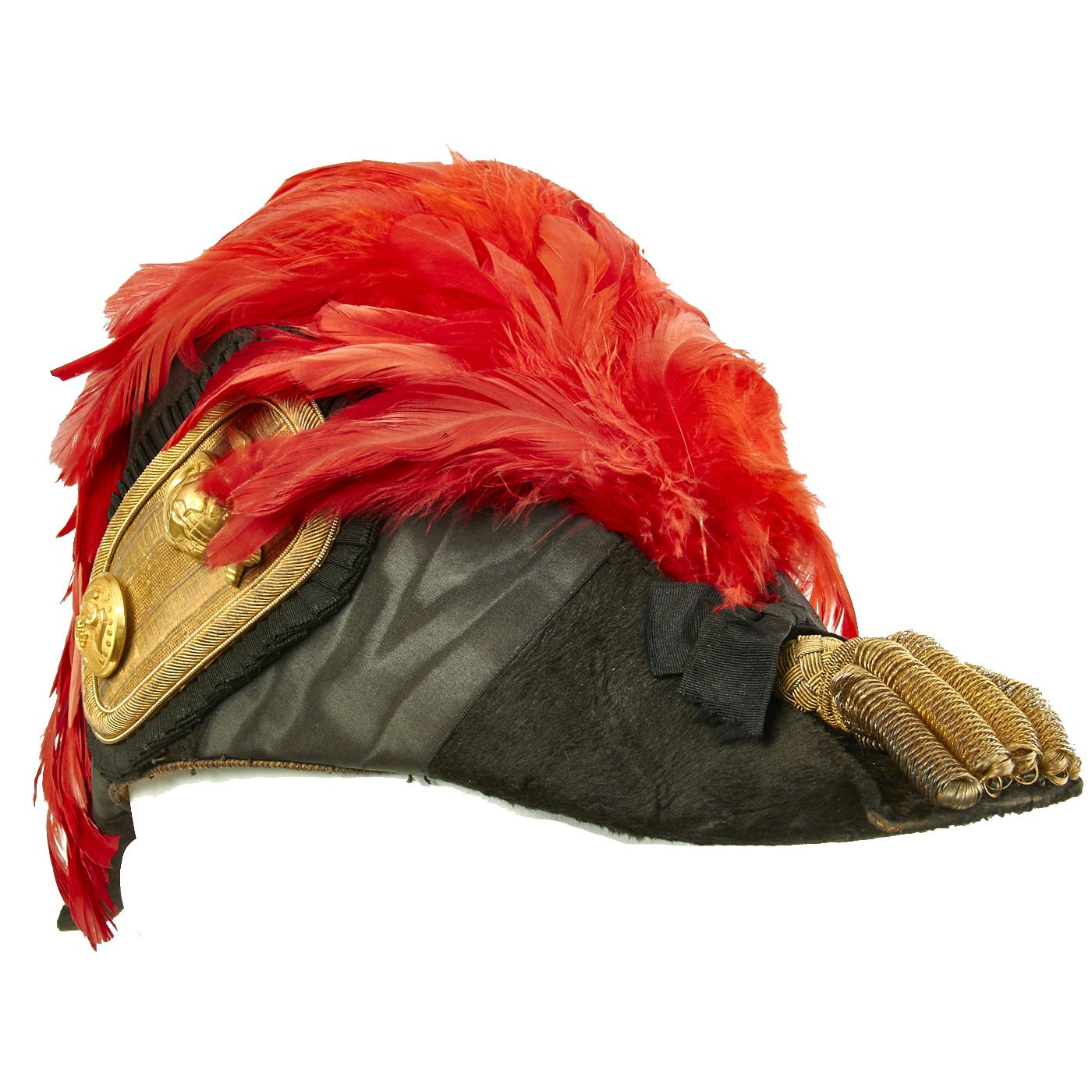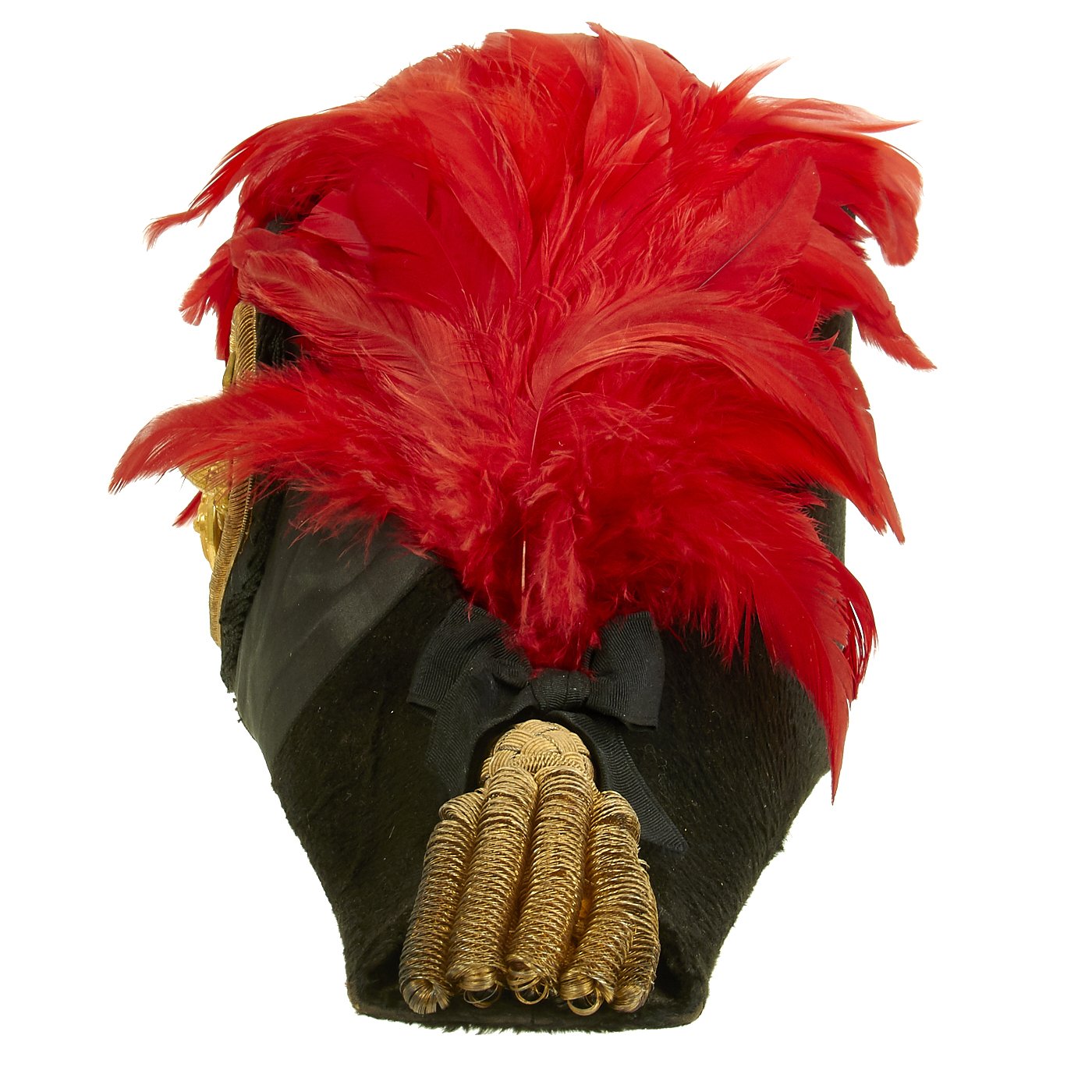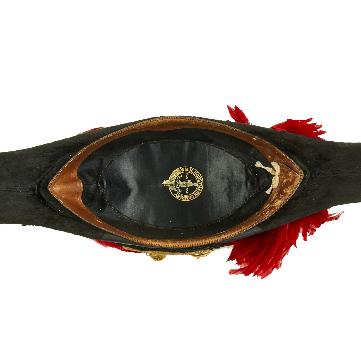 Original Item: Only One Available. Created from original parts this is a recreation of a late 19th century United States Marine Corps USMC bicorn hat for an officer. It is beautiful and offered in very good condition. This is a collapsible high quality black sealskin fore and aft hat, or cocked hat, with gold wire tassels (which should have a red wool base) and a large red feather plume. The exterior also features a gilt enlisted EGA insignia (this should be an officer insignia), USMC Eagle Globe Anchor button and bullion embroidered ribbon. On the interior that black satin lining is in excellent condition and bears in gold lettering that reads: