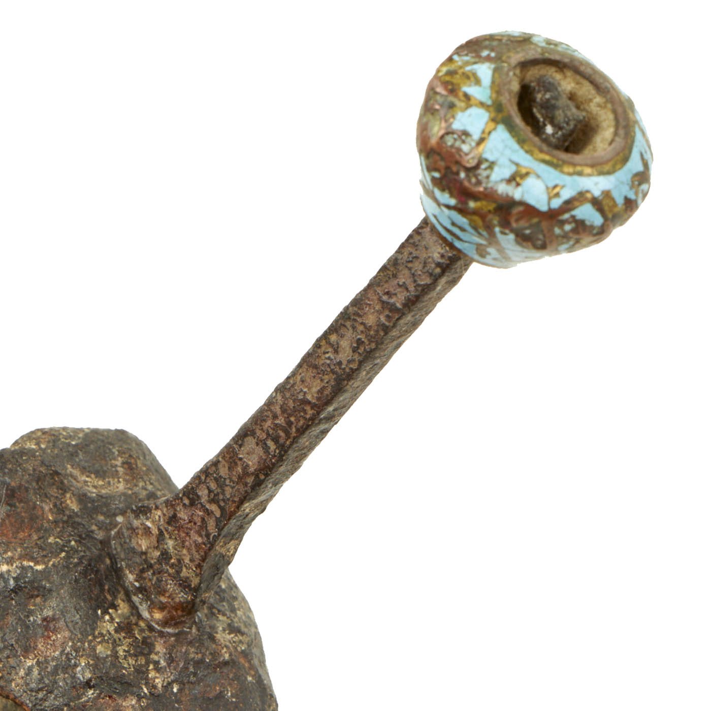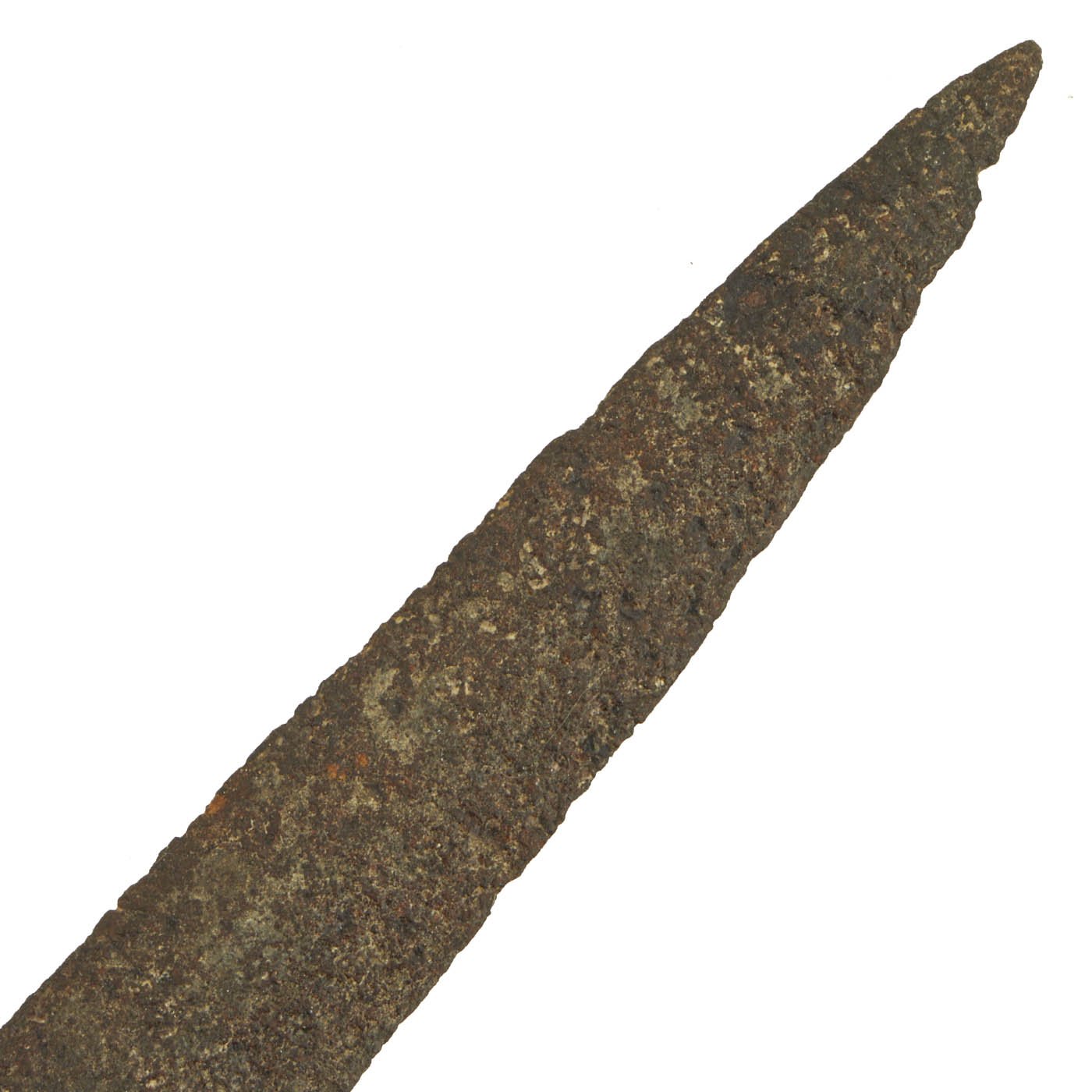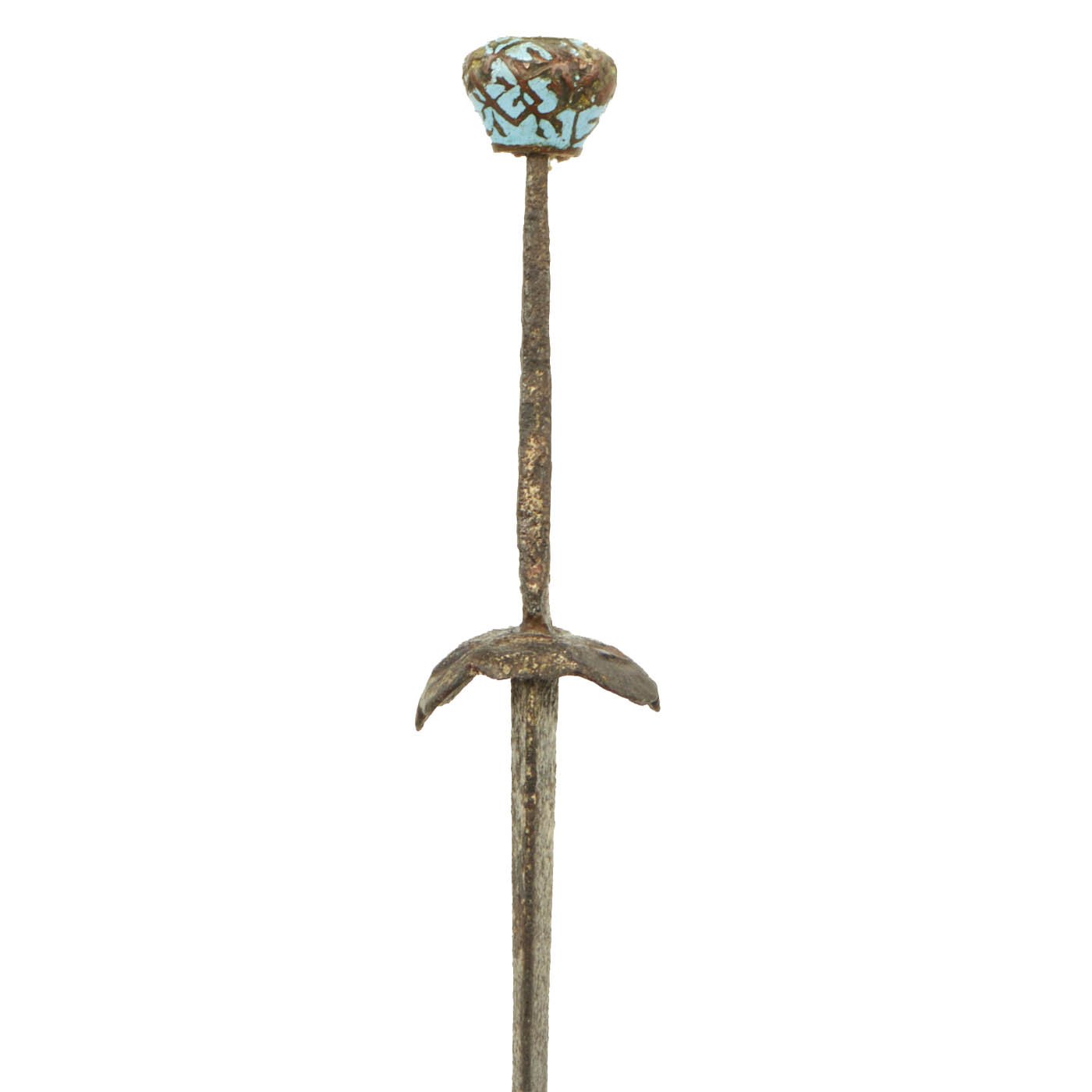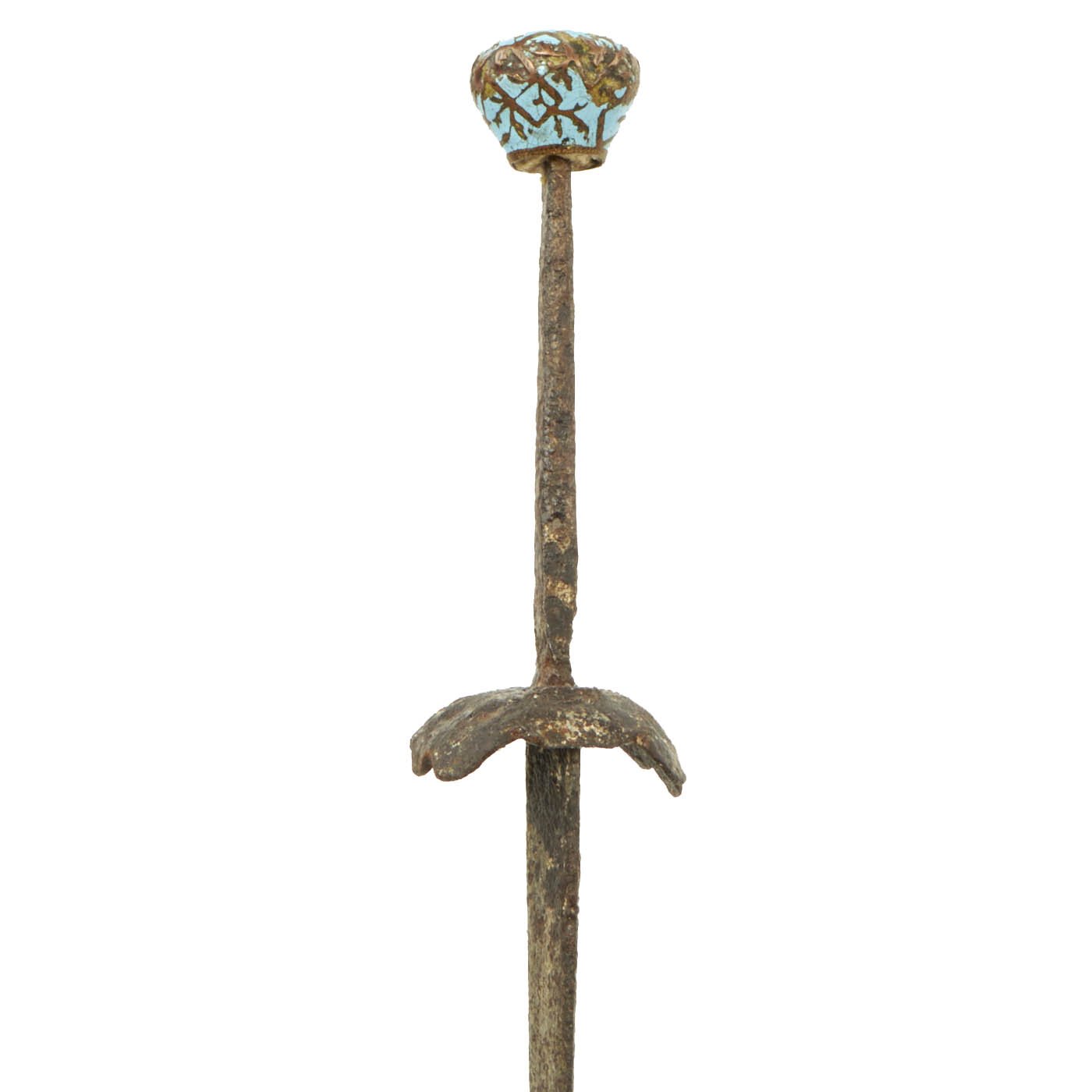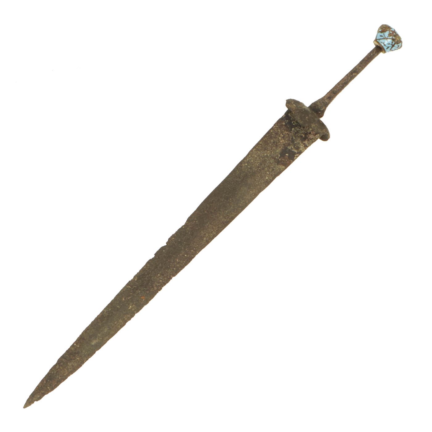 The Dirk is in relic condition, it measures 17 " in overall length with a 13” long blade. It is well eaten away after centuries of field burial. The interesting feature however is the still attached pommel, which features bright Turquoise enamel inlay, decorated with gold inlays, mostly worn away but leaving the brass mounting underneath. Nobody ever did any research but it is all available to be found on the internet. Apparently the dirk had a large emerald set into the pommel but alas it's gone of course, but one can see where it was mounted.