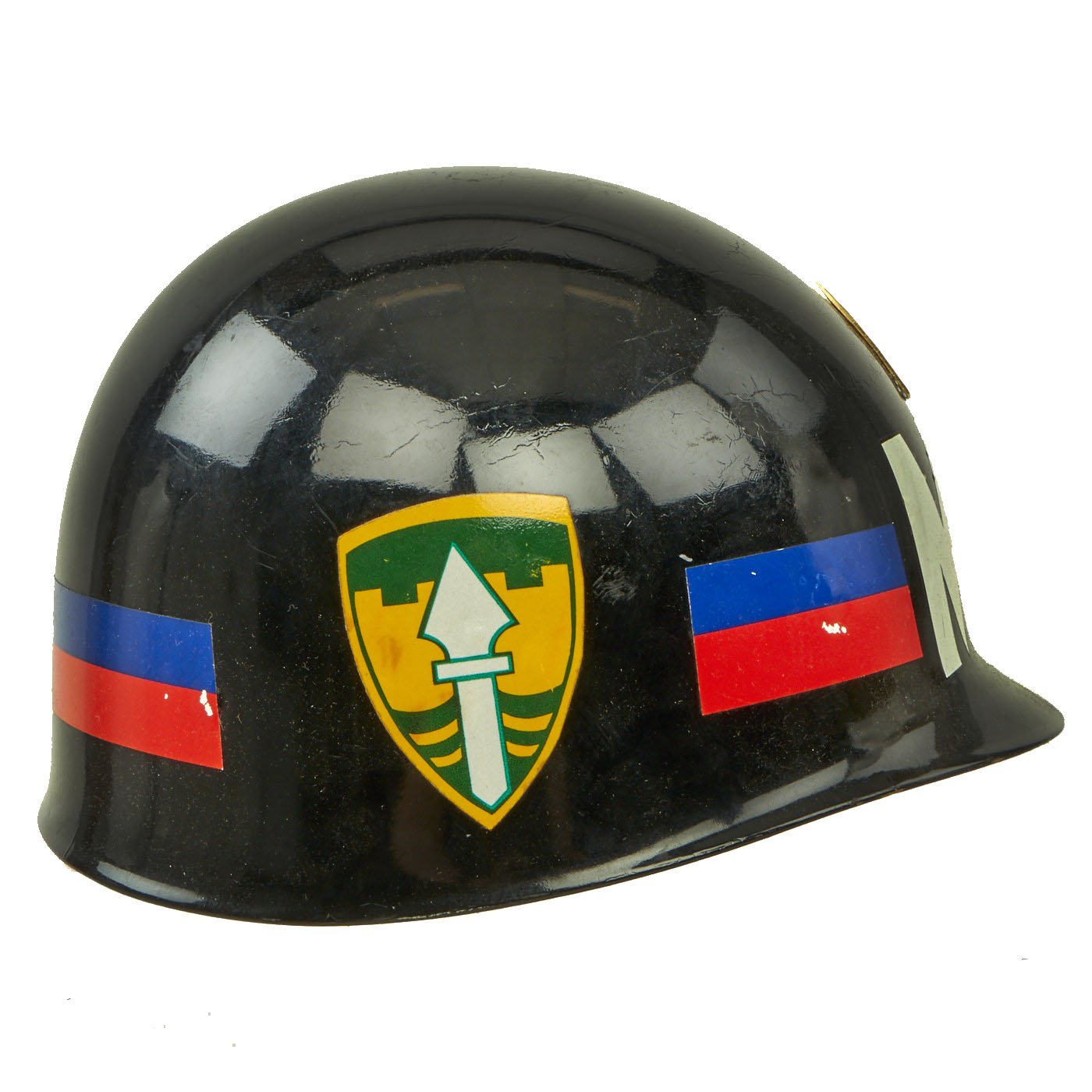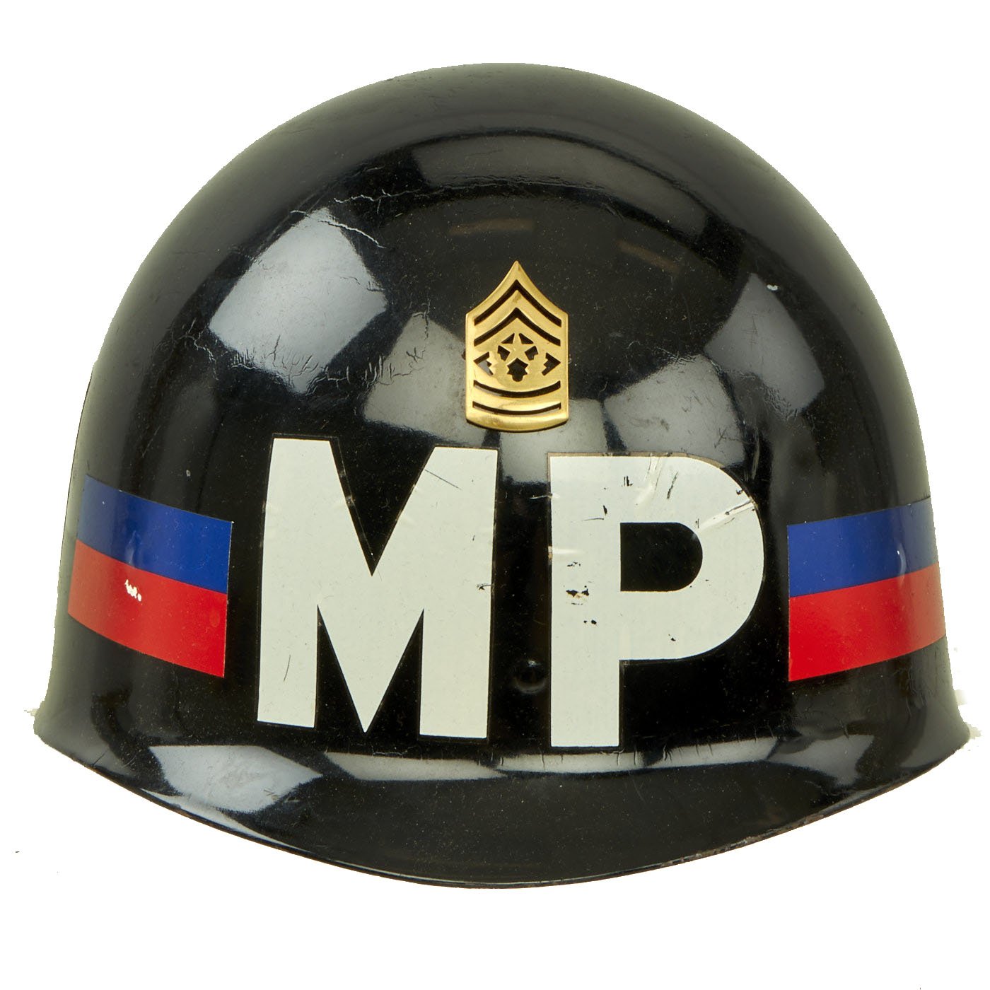 - Original U.S. Vietnam Era M1 Helmet Liner with Military Police Paint job, side insignia, and Command Sgt. Major Badge.