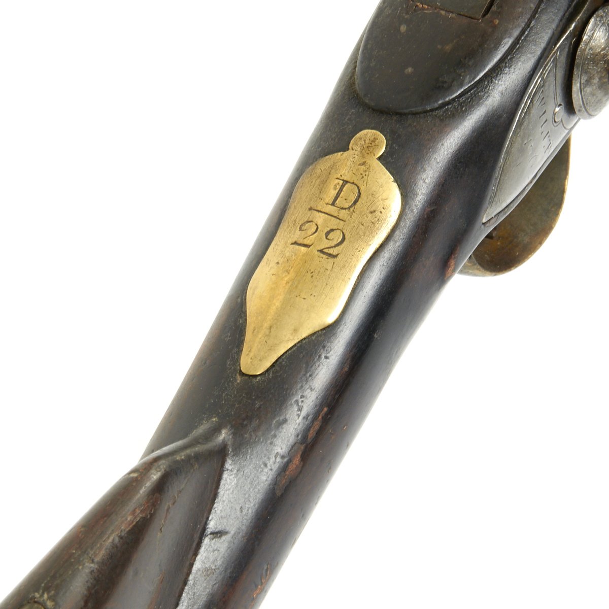 The 31st. Regiment of Foot arrived in North America at Quebec in MAY 1776. They fought at Lake Champlain against Rebel Forces led by Benedict Arnold. The escutcheon plate of brass bears the inscription of D / 22 indicating that this musket was issued as the 22nd musket in the 4th (D) Company. Unfortunately the major part of the Regiment was at the BATTLE OF SARATOGA SPRINGS in 1777 under the British General John Burgoyne and were forced to surrender. If the Regimental Rolls are still in the possession of the National Army Museum, we could possibly identify the Soldier who was the 22nd man in Company D, of the 31st Regiment of Foot that became known as the HUNTINGDONSHIRE REGIMENT.