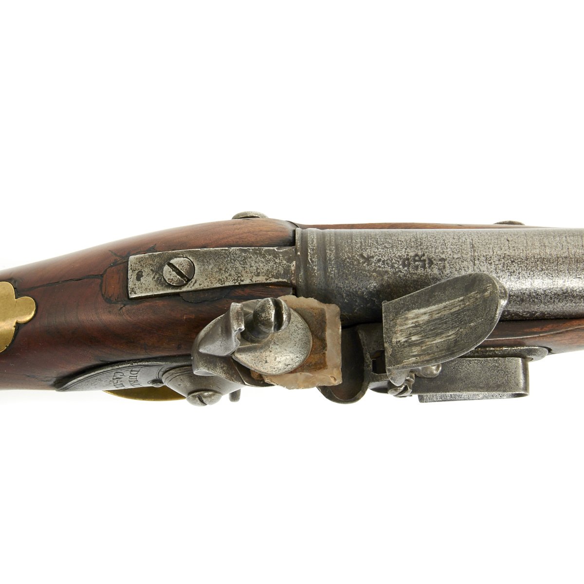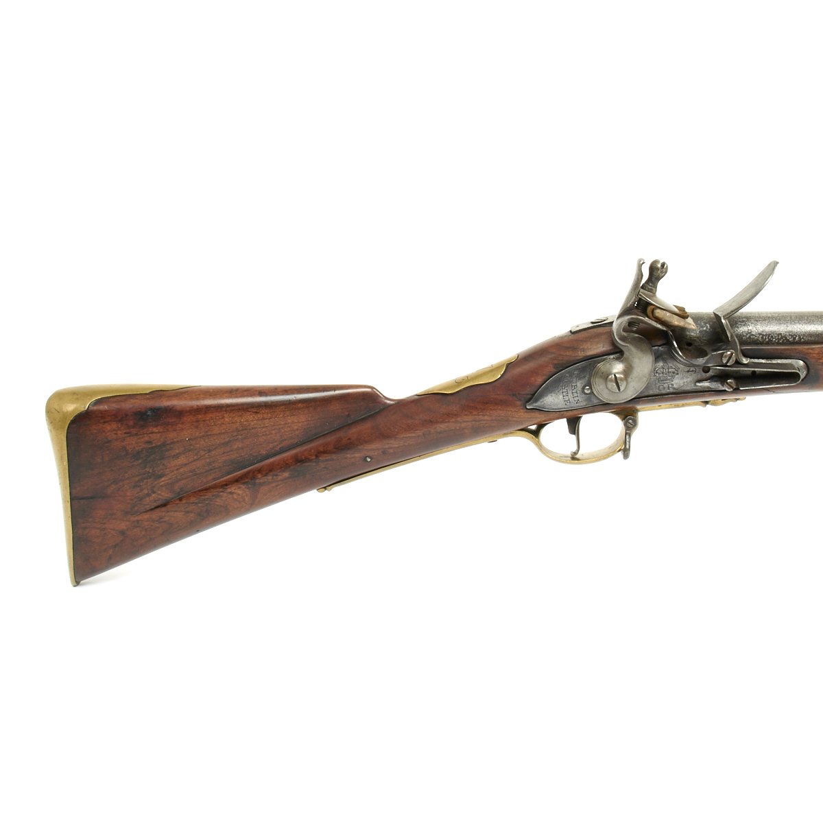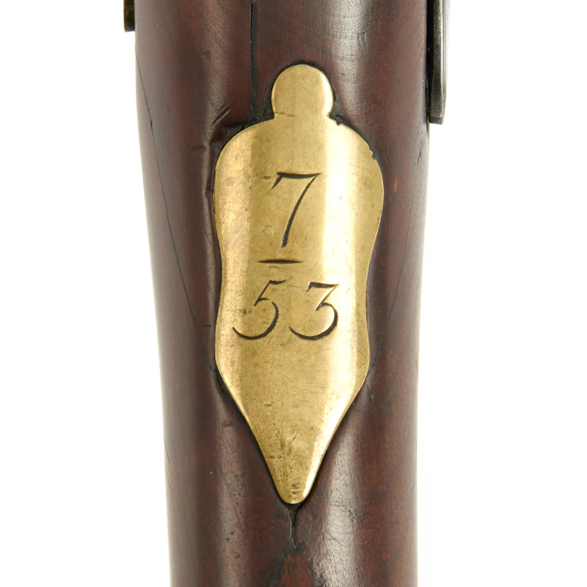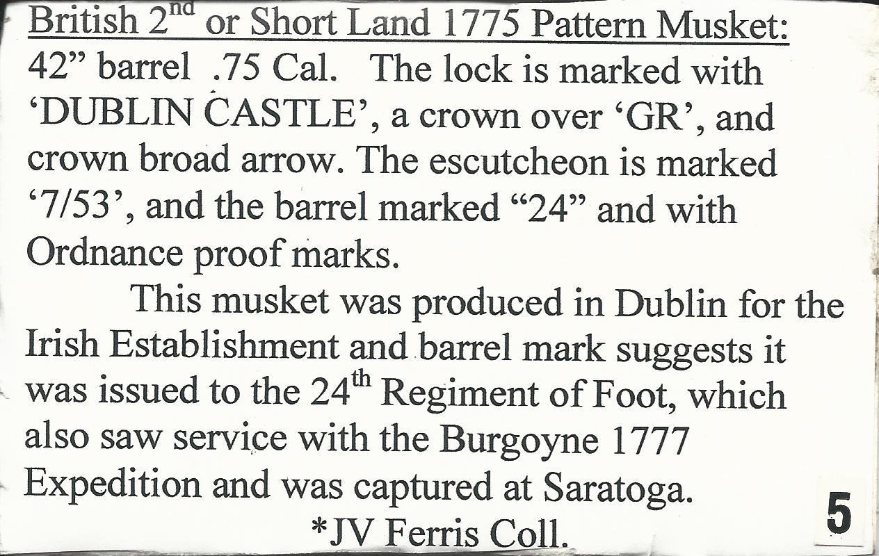 This weapon is a British Short Land pattern musket. The lock has the standard British markings beneath the flashpan and the words DUBLIN CASTLE on the tail of the lockplate. Dublin Castle was an armory in Ireland that supplied weapons to the Ordnance from about 1760. It has the features of the locks found on Short Land muskets made prior to 1777. The 42 inch .75 caliber barrel has the standard Ordnance proof marks on the breech as well as a large and deeply stamped number 24 midway on the barrel. The escutcheon plate of this weapon is marked 7/53 which suggests that the musket was issued to the 7th troop and was the 53rd man's weapon in the 24th Regiment of Foot It could also mean 53rd Regiment of Foot. However, the very unusual barrel mark of 24 almost certainly refer to a regimental number. Regardless, both the 53rd Regiment and the 24th Regiment of Foot saw action in America during the Burgoyne Expedition.