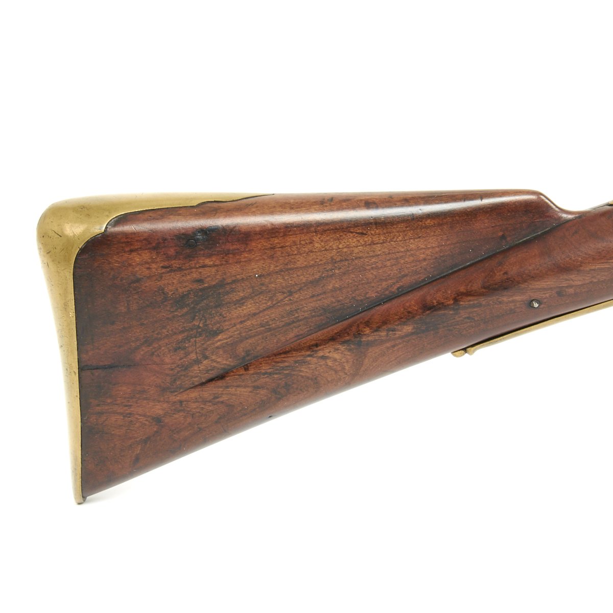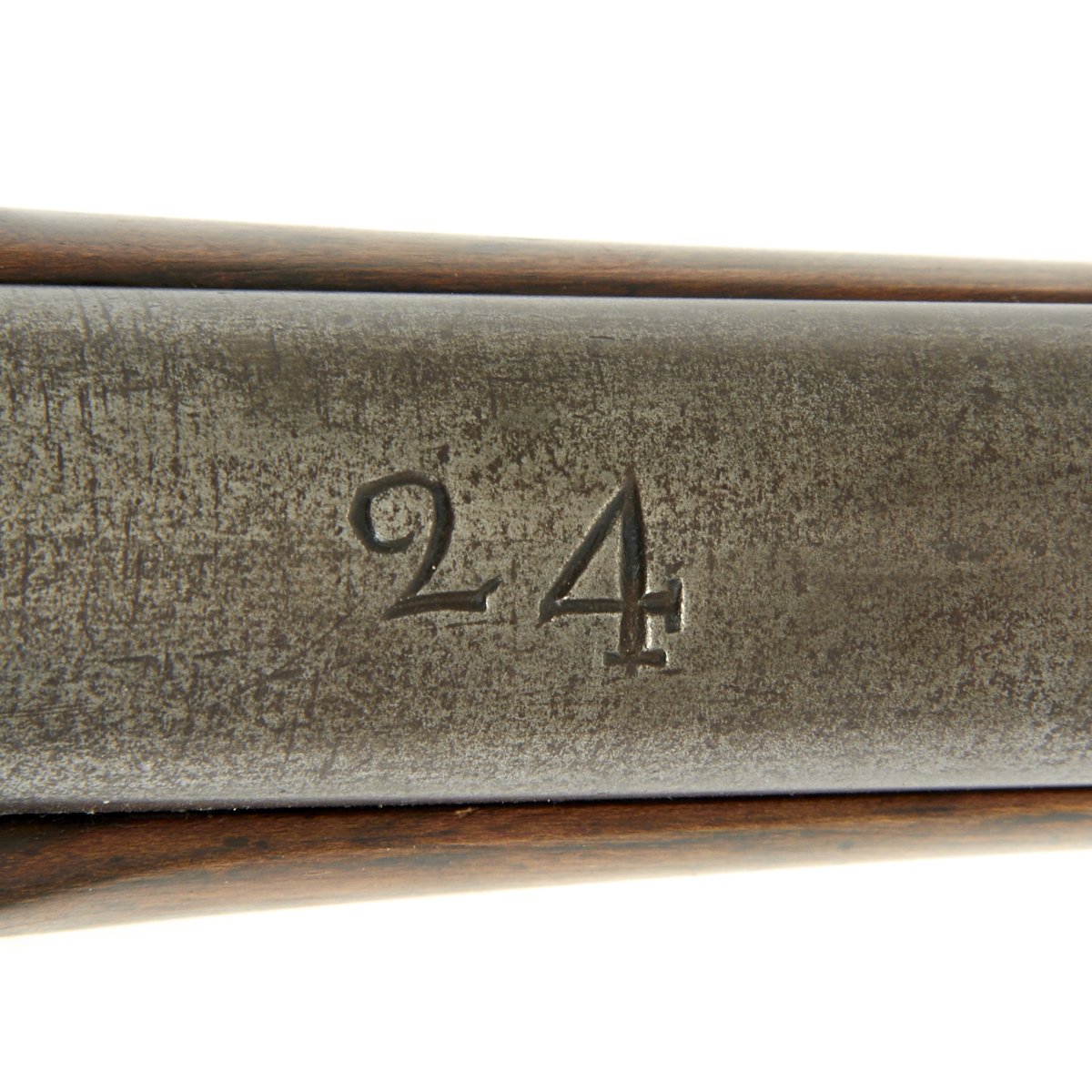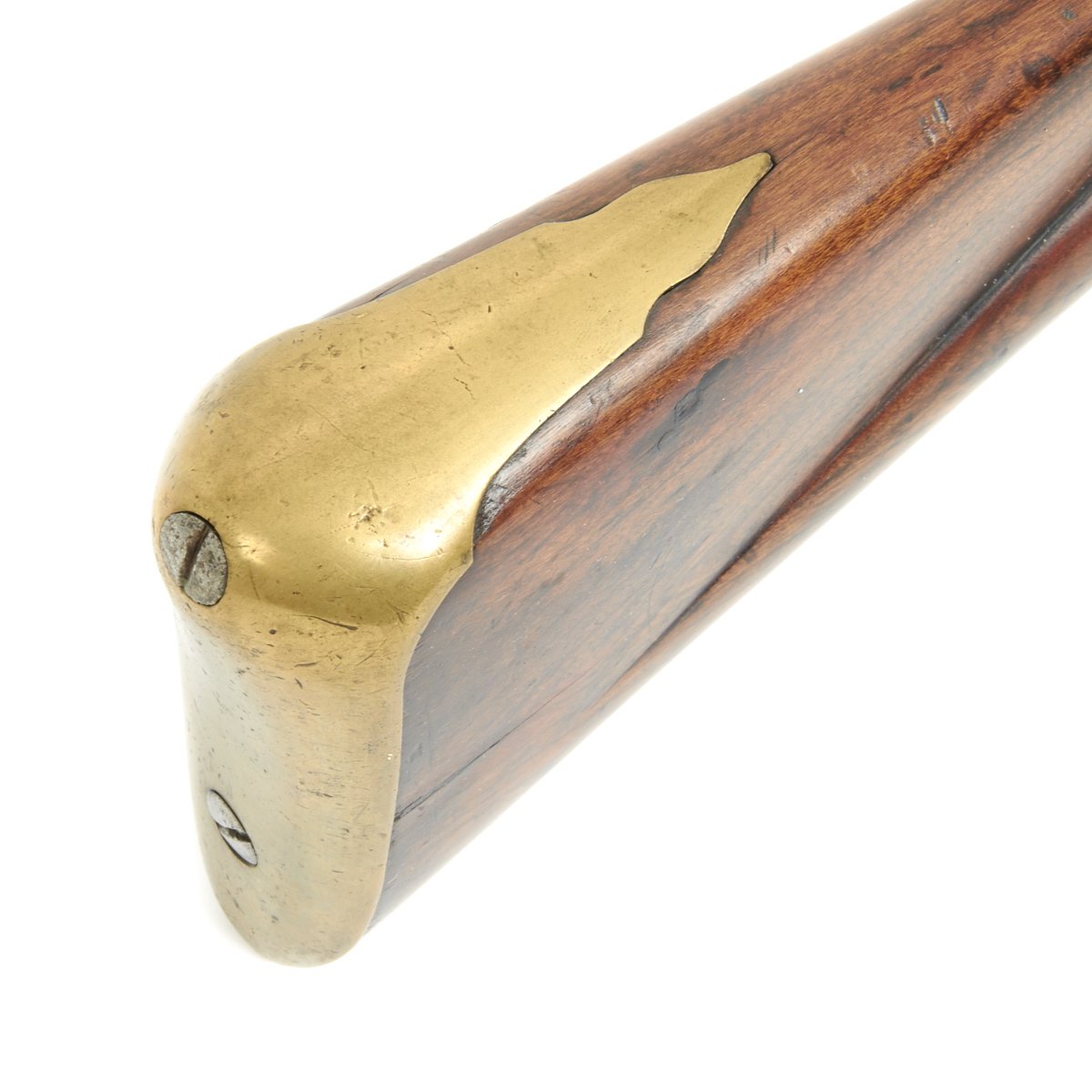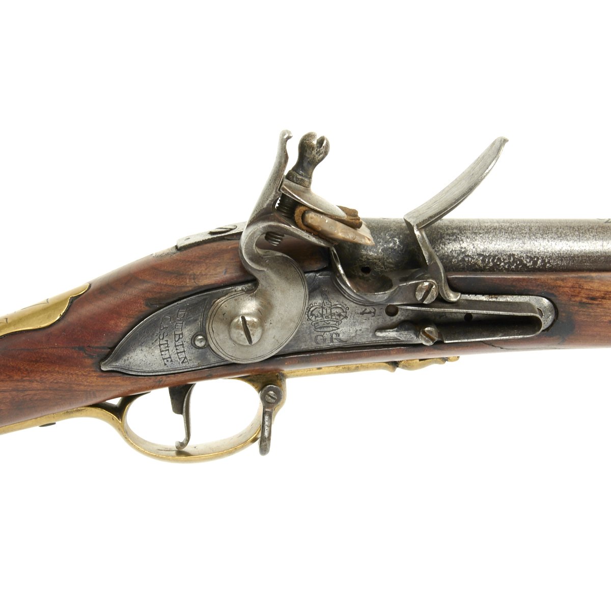 This weapon is a British Short Land pattern musket. The lock has the standard British markings beneath the flashpan and the words DUBLIN CASTLE on the tail of the lockplate. Dublin Castle was an armory in Ireland that supplied weapons to the Ordnance from about 1760. It has the features of the locks found on Short Land muskets made prior to 1777. The 42 inch .75 caliber barrel has the standard Ordnance proof marks on the breech as well as a large and deeply stamped number 24 midway on the barrel. The escutcheon plate of this weapon is marked 7/53 which suggests that the musket was issued to the 7th troop and was the 53rd man's weapon in the 24th Regiment of Foot It could also mean 53rd Regiment of Foot. However, the very unusual barrel mark of 24 almost certainly refer to a regimental number. Regardless, both the 53rd Regiment and the 24th Regiment of Foot saw action in America during the Burgoyne Expedition.