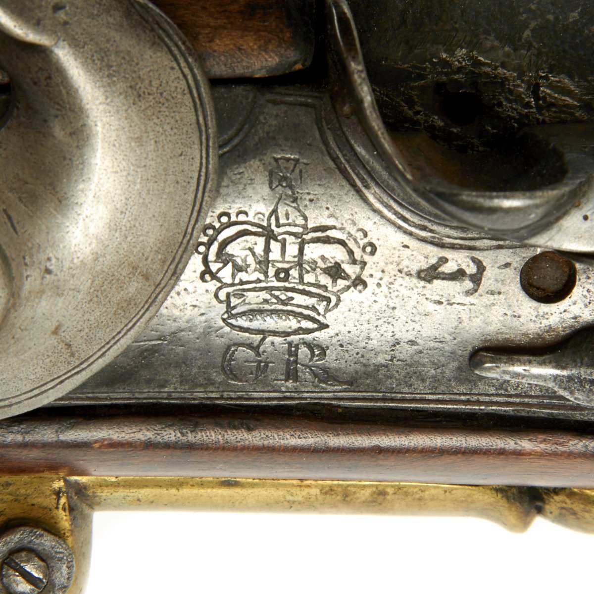 This early Short Land pattern musket is in overall excellent condition. Its' markings are unusually clear and crisp for this type firearm. A photograph of the mark on this musket appeared in the May 1994 issue of The Gun Report, in an article entitled, "Colonial Firearms Displayed at the Princeton Battlefield". This weapon was on display at the Fort Ticonderoga Museum in 1992, and is currently on display at the Thomas Clarke House, in the Princeton Battlefield State Park, in a special exhibit called, "Arms of the Revolution".