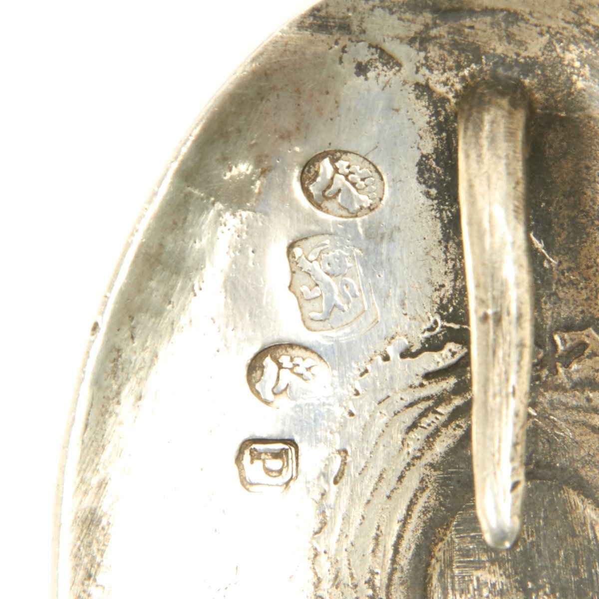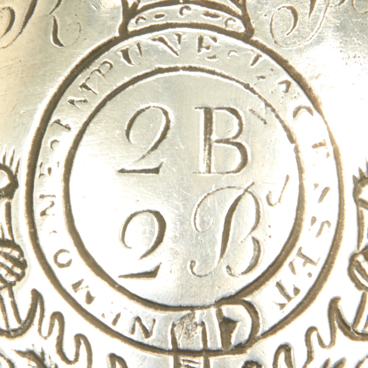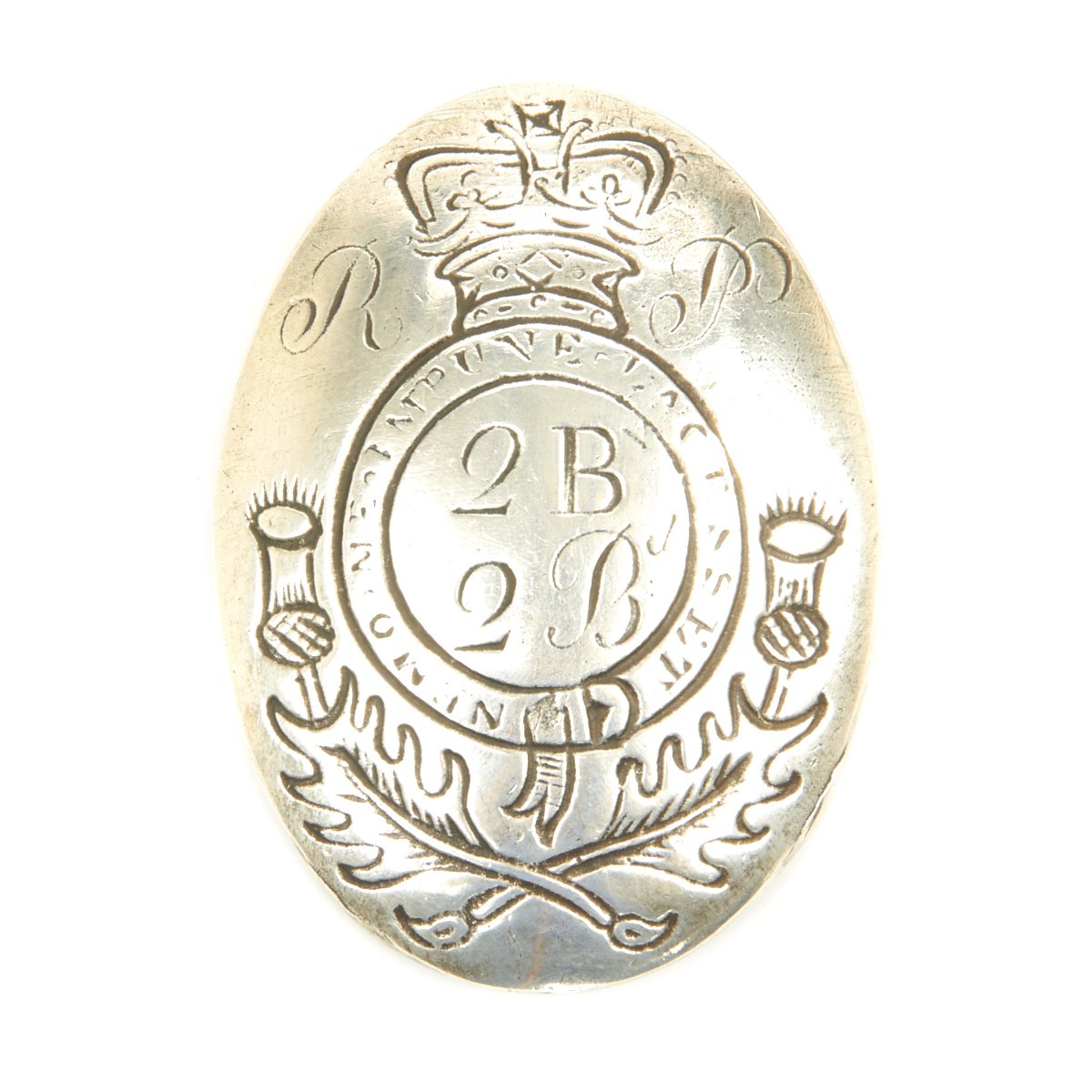 The HALLMARKED Silver Officer's Cross Belt plate we offer bears the Regimental Motto NEMO ME IMPUNE LACESSIT (No one provokes me with impunity) in a circle around and 2 Bn / 2 Bd for 2nd Battalion, 2nd Brigade. The motto itself was also the Royal Motto of the House of Stuart, Rulers of Scotland, as well as the motto of several other Scottish units. Above is King George's Crown with Scottish Thistle decoration around the lower edges. Somewhat worn but easily discernible, measuring 2 1/2" wide by 3 " tall these were worn on the Officer's white cross belt mounted upon his chest. The rear of the buckle bears Sterling Silver hallmarks.