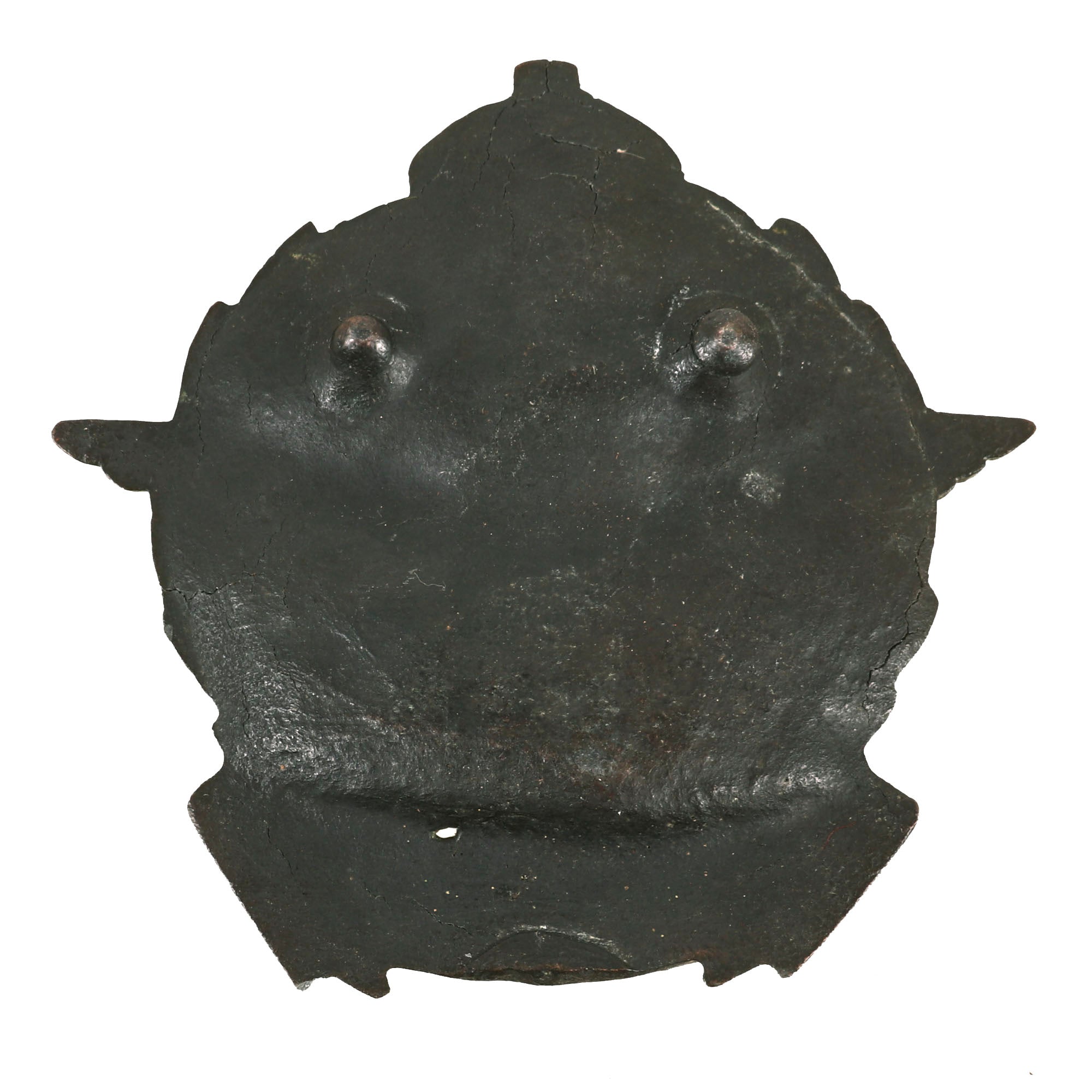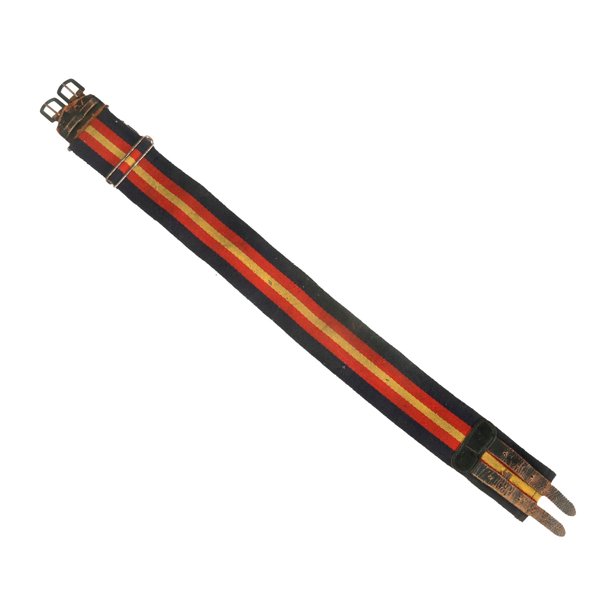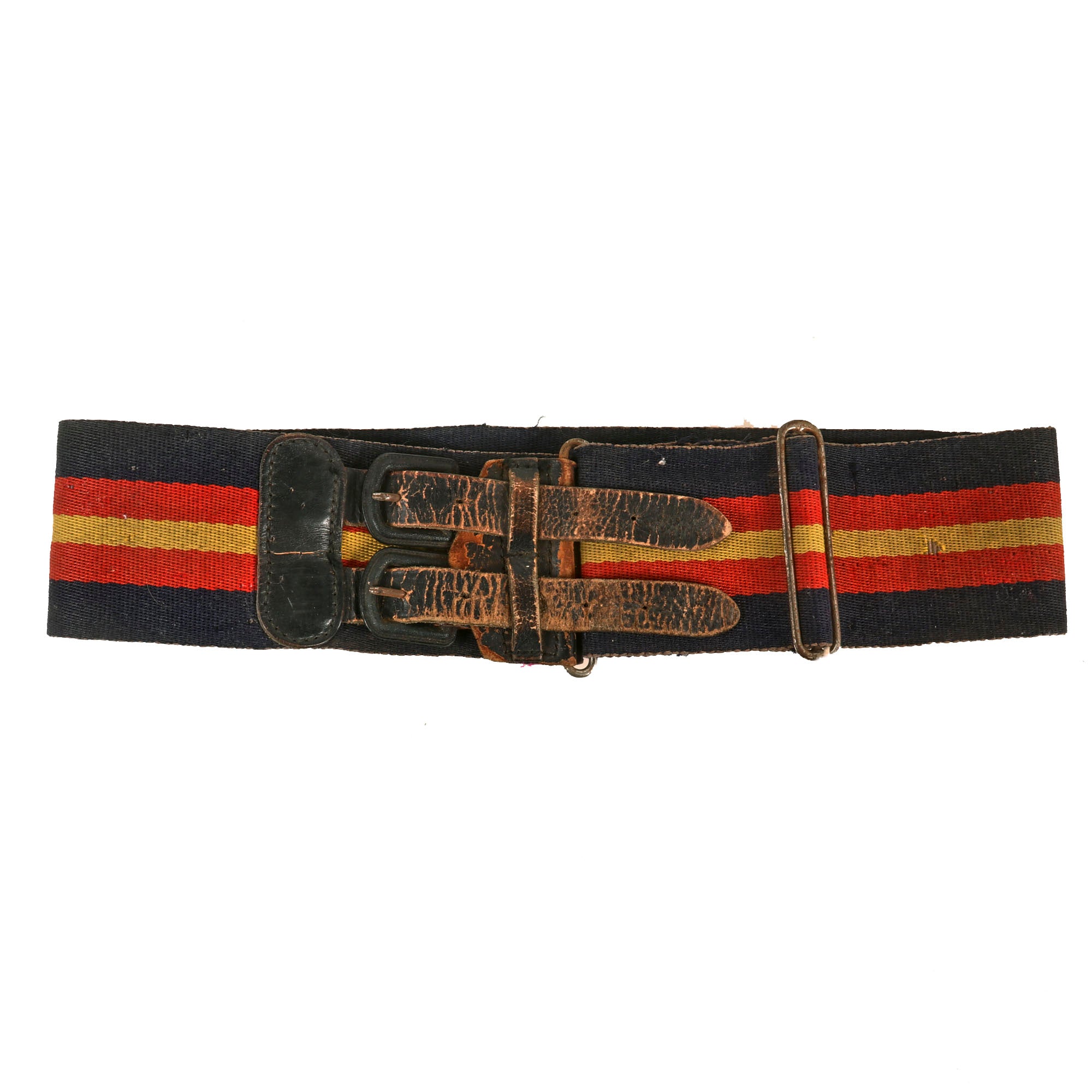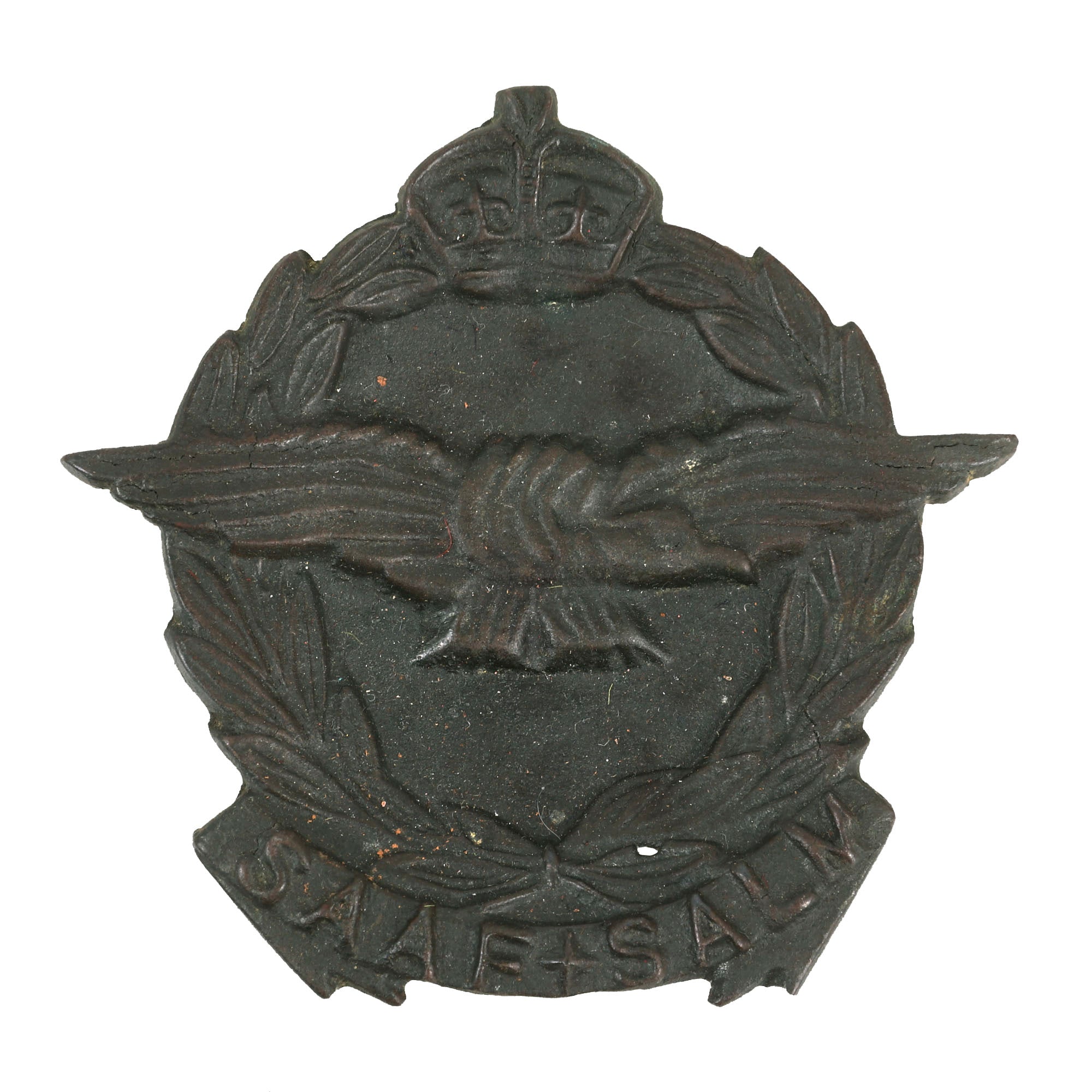 The lot of items include a beautiful Army Service Corps Stable Belt from the Bush War, which is colored in red, yellow, and blue, with leather buckles to tighten it. The belt is in good shape with light cracking on the leather and oxidation on the metal fittings. Also included is a WWII South African Air Force plate in the shape of their insignia. The plate measures 4 x 3¾”. The final item is a beautiful metal mug named on the side: