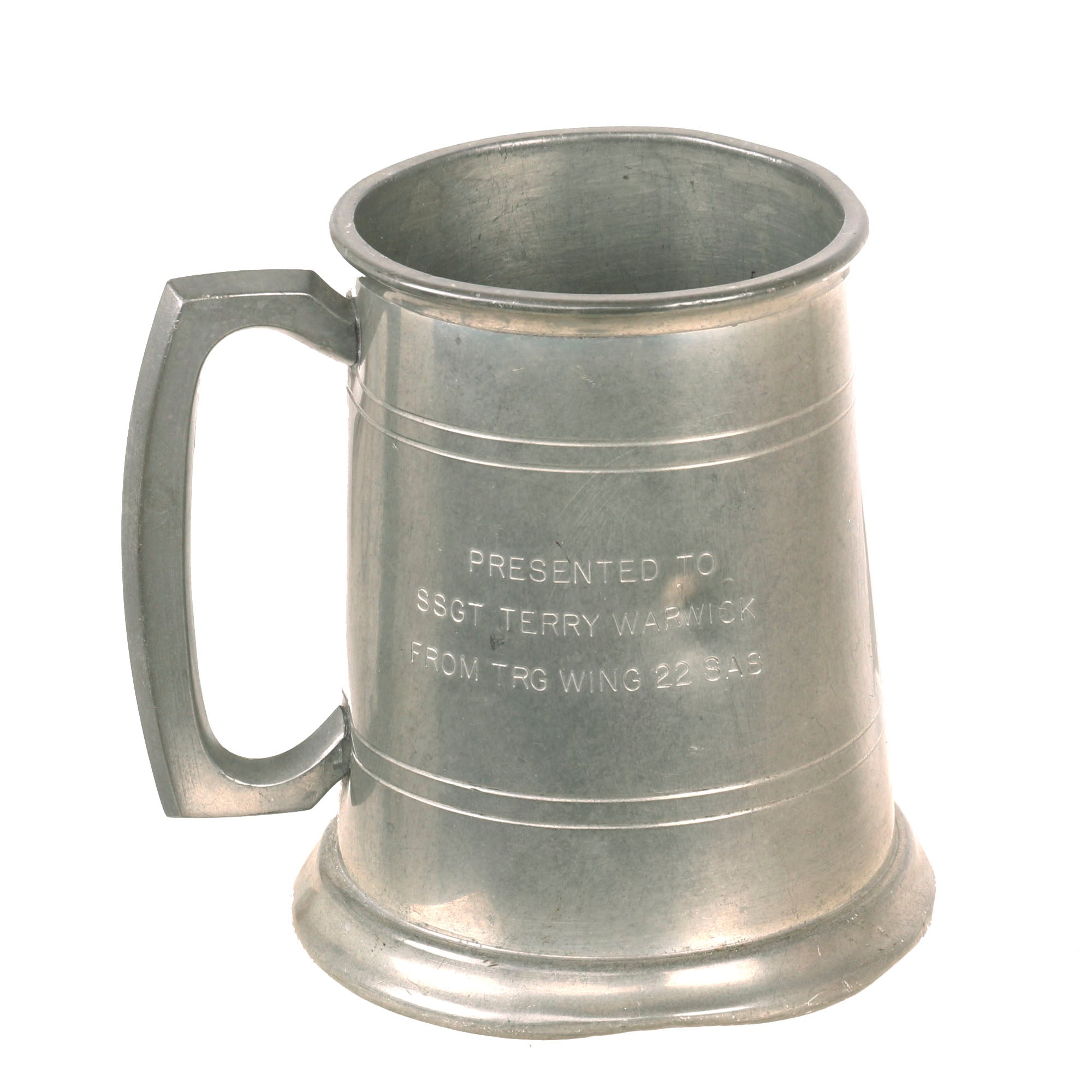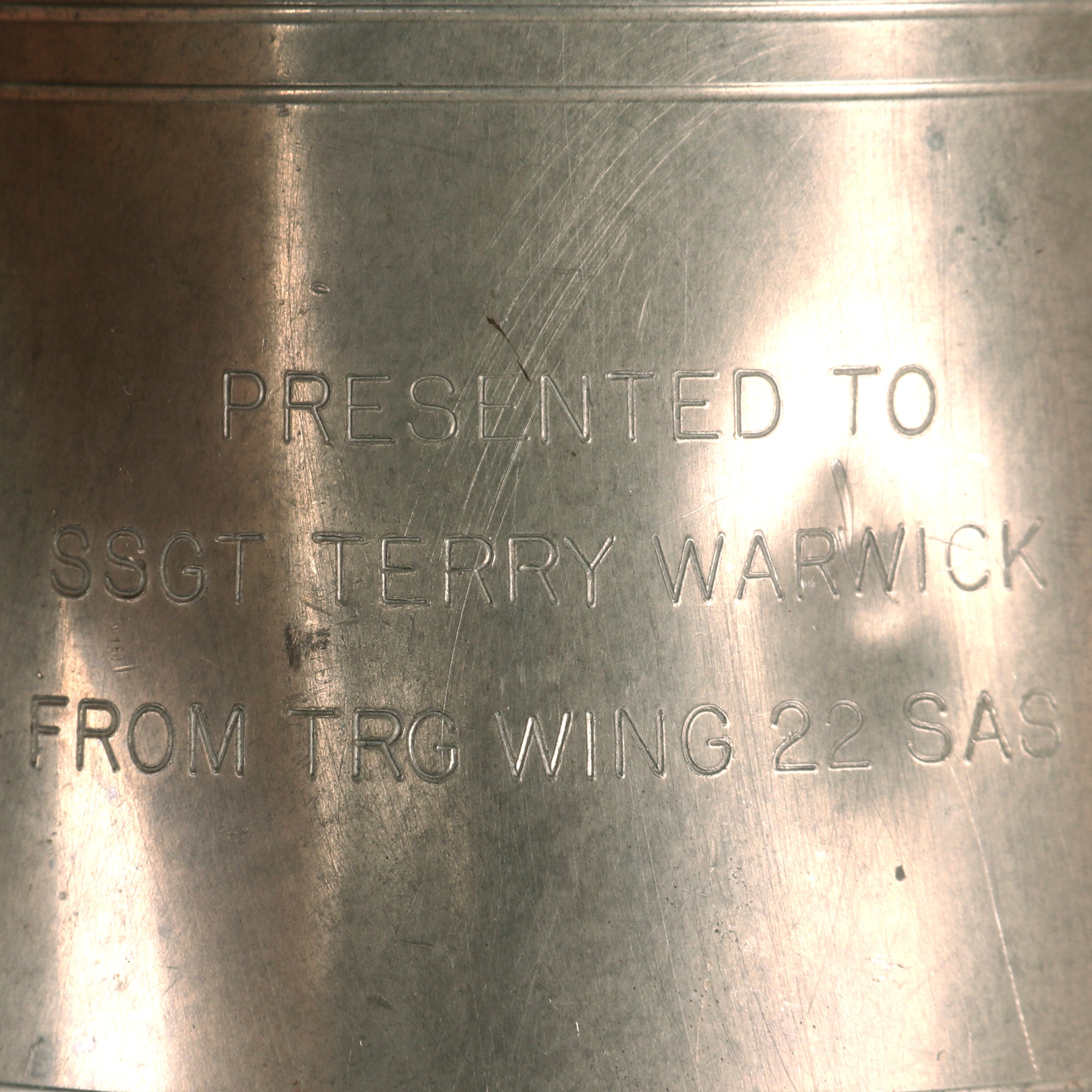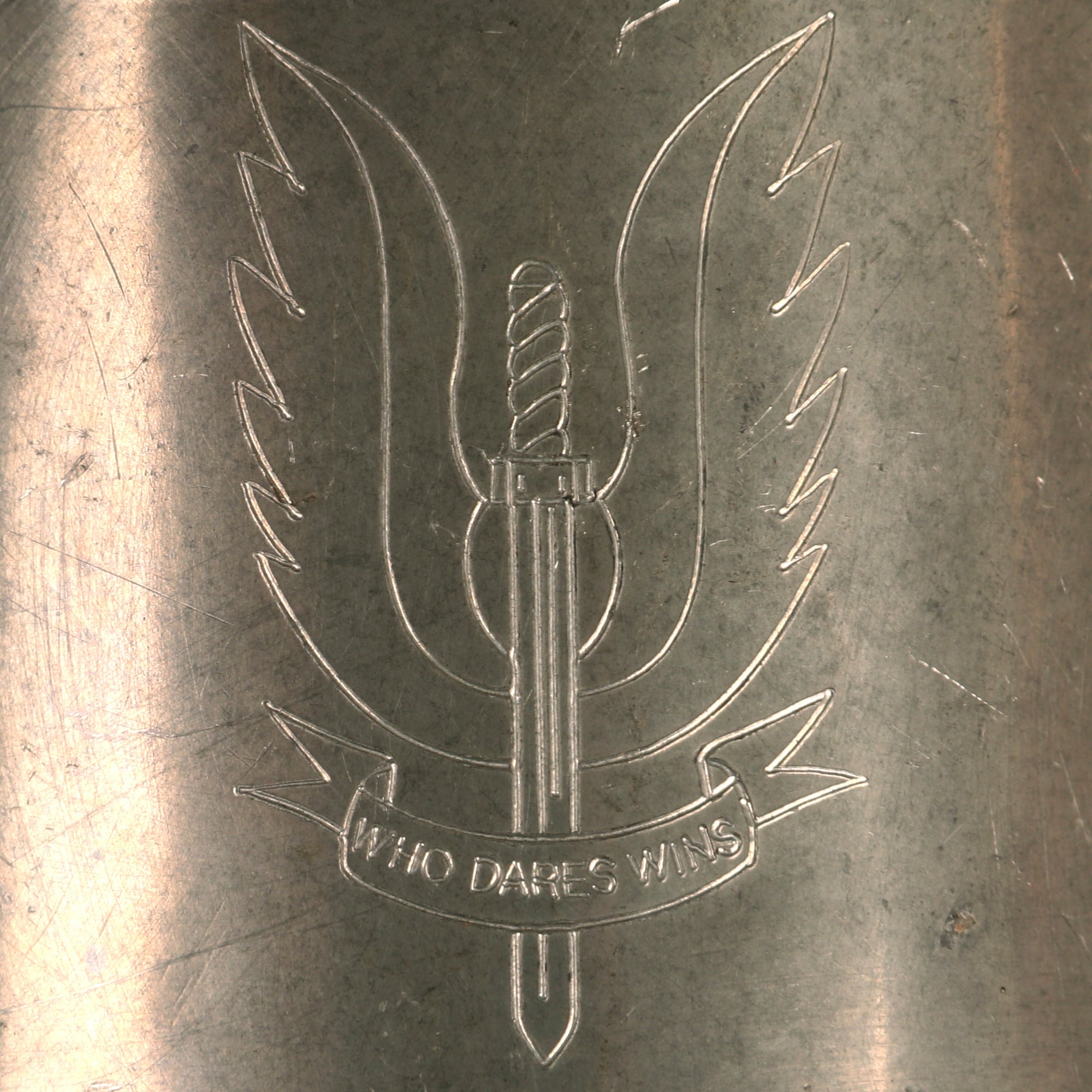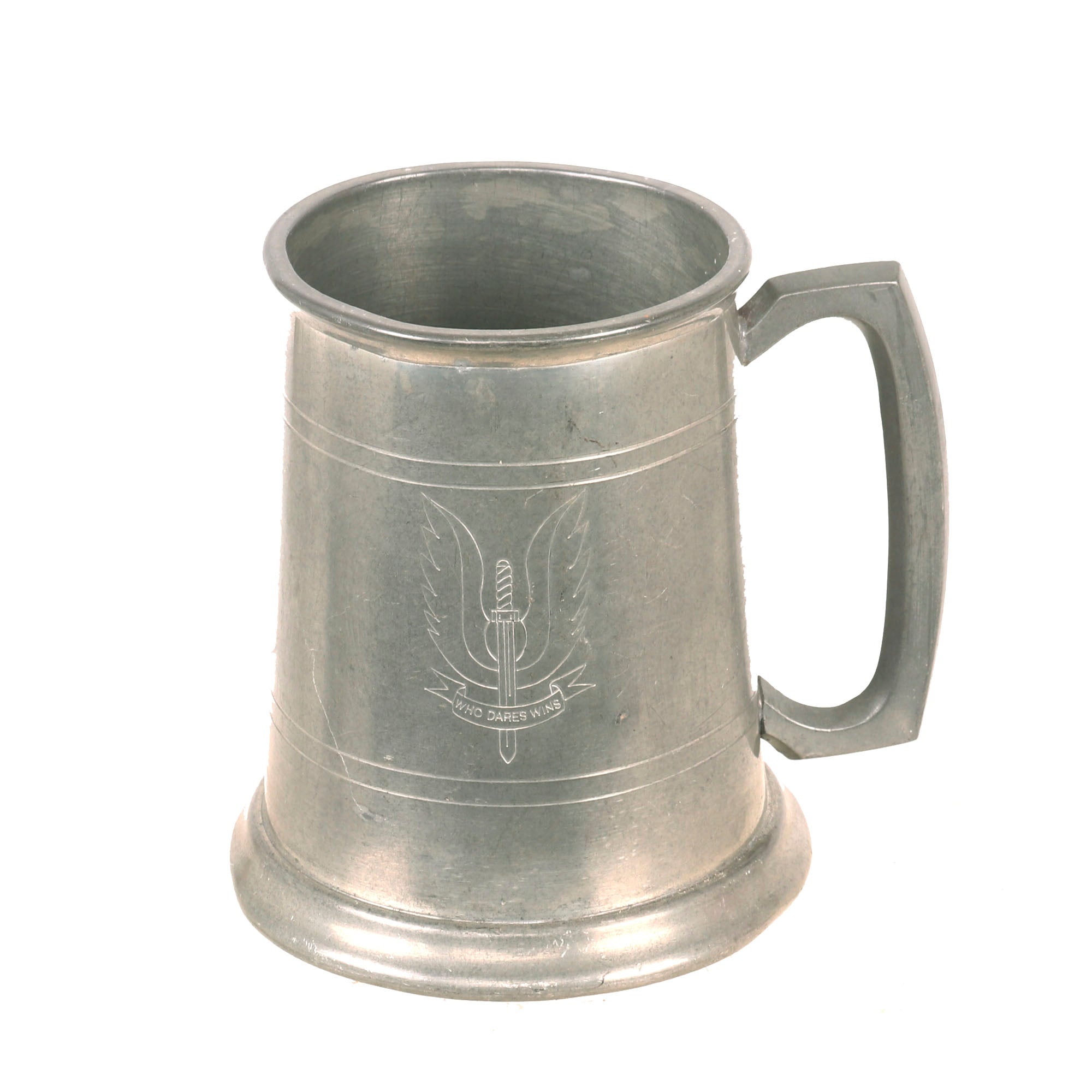 This is a British mug presented to a sergeant of the 22nd Special Air Service, the insignia of which is engraved on the other side of the mug “Who Dares Wins”. This is a really great mug which could use further research. The mug measures 4 x 4½ x 5”.