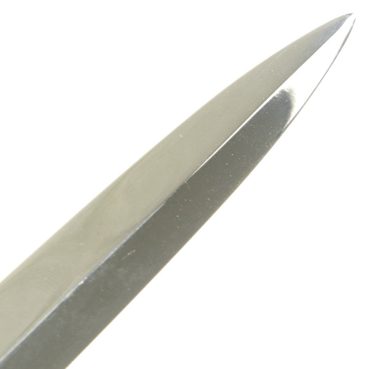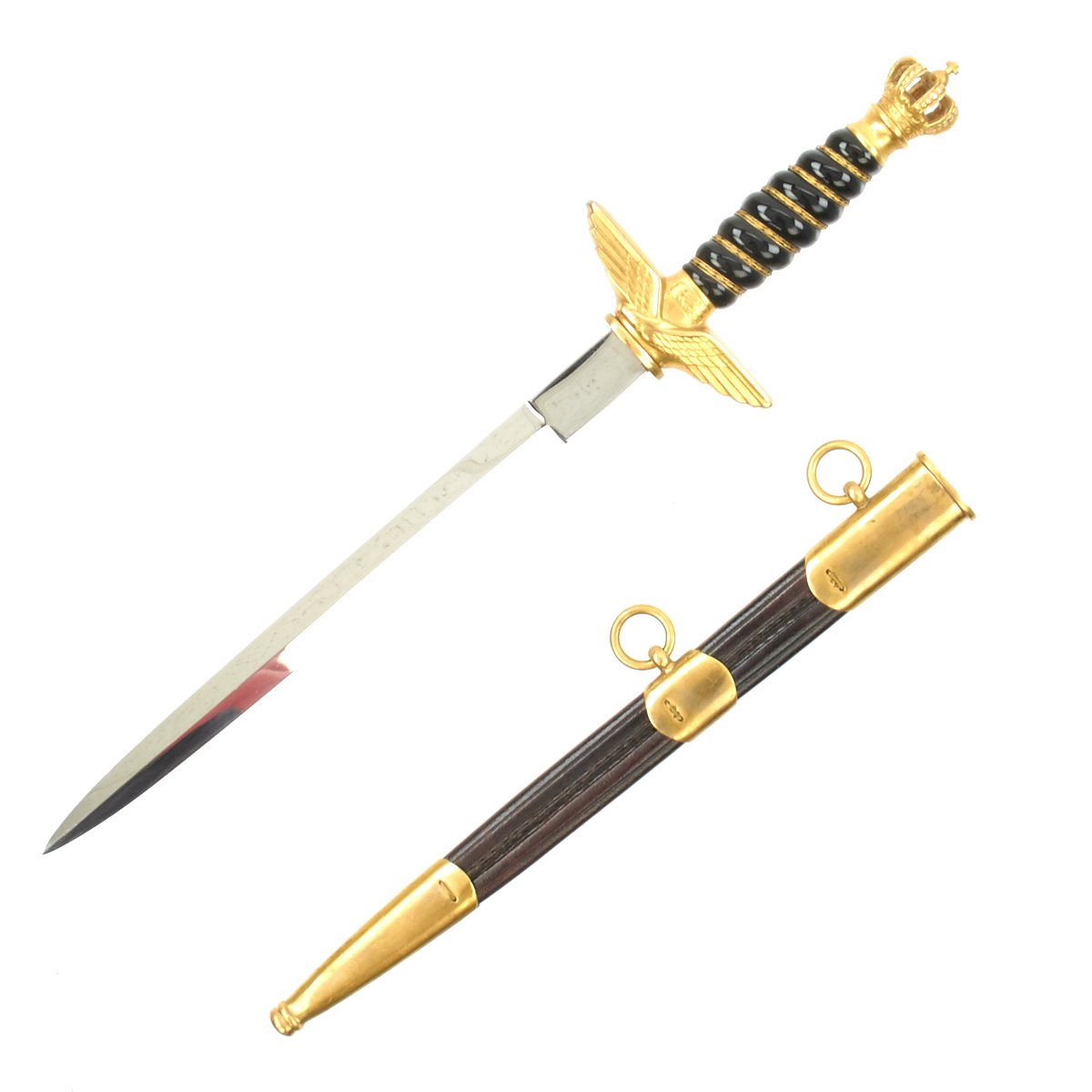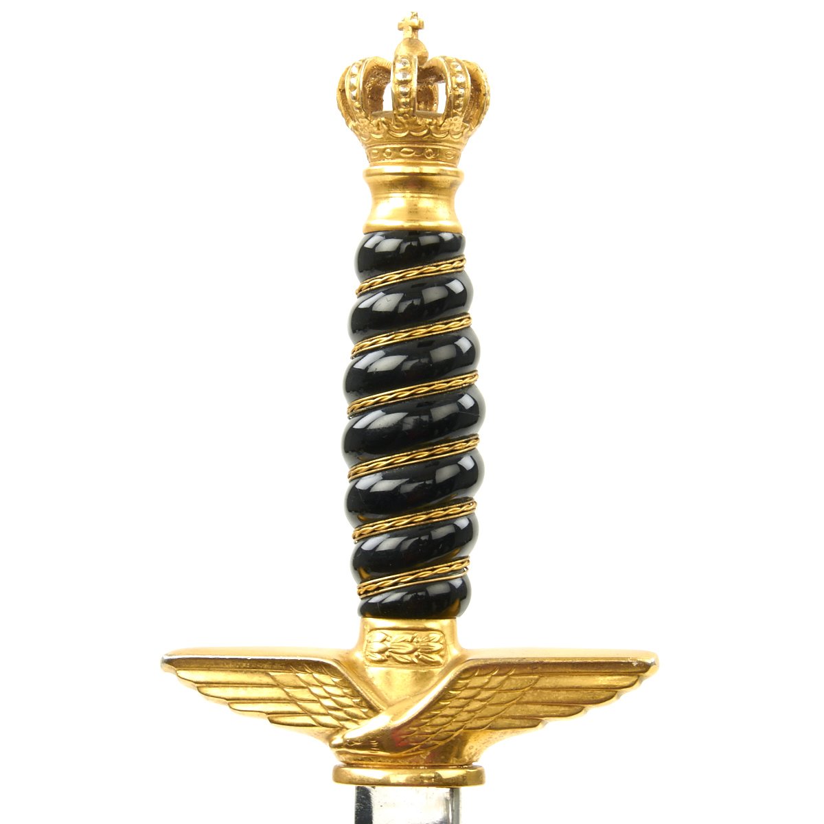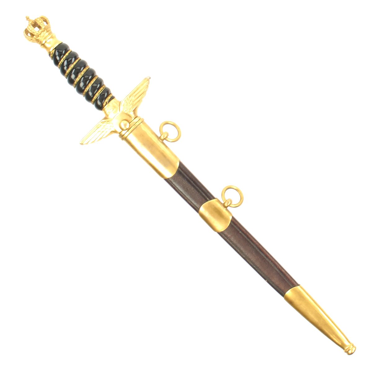 The dagger features a beautiful black diagonally angled ribbed grip with double twisted brass wire wrap. The handsome gilt pommel is in form of the Dutch Royal Crown with negative space. The gilded crossguard is in the form of a flying gull. The dagger is complete with the original matched black leather scabbard with gilt fittings. The scabbard retains an operational release button on the reverse side of the cross guard.