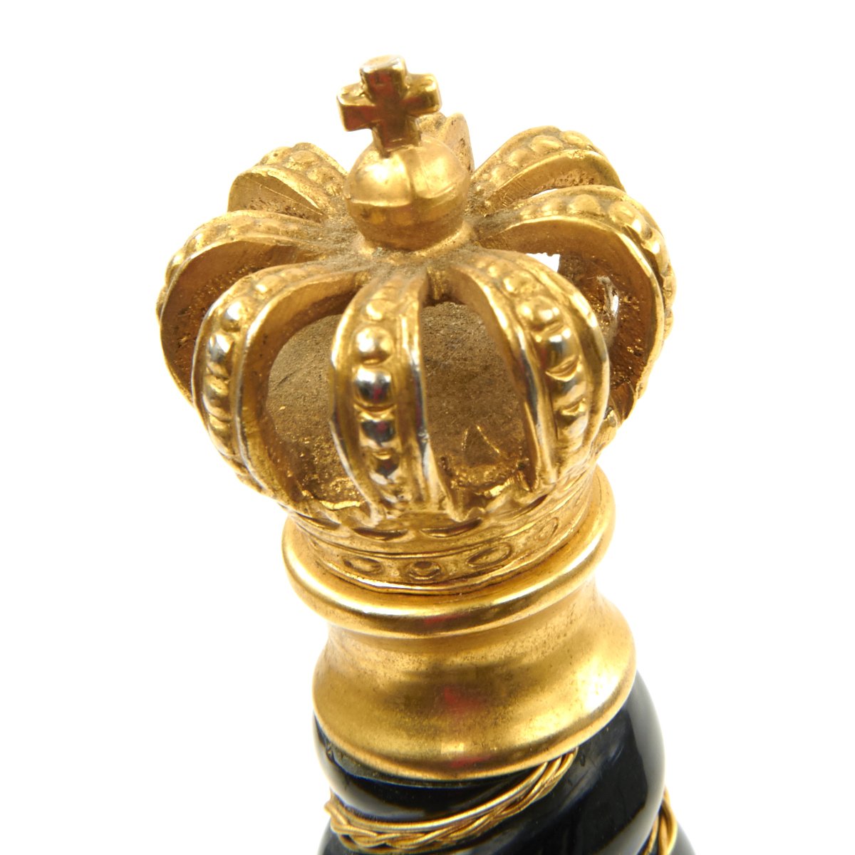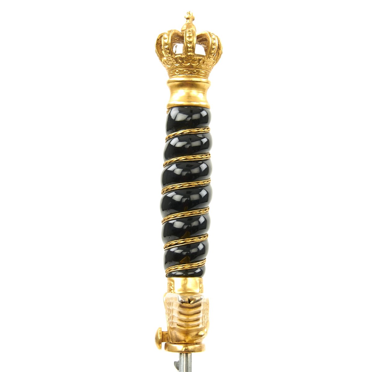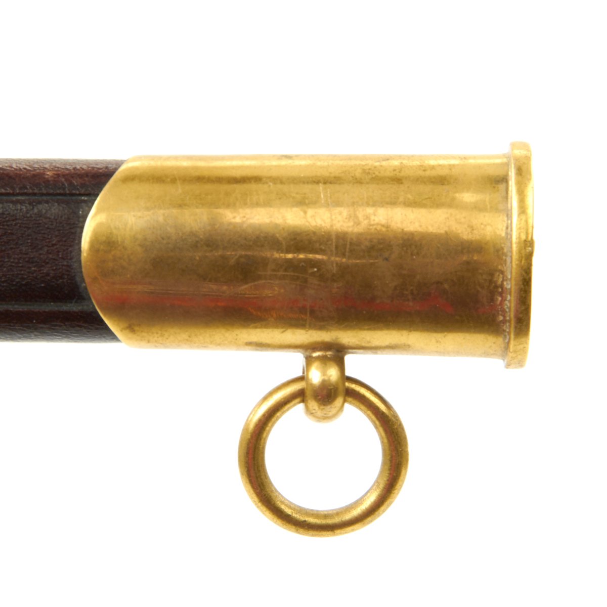 The dagger features a beautiful black diagonally angled ribbed grip with double twisted brass wire wrap. The handsome gilt pommel is in form of the Dutch Royal Crown with negative space. The gilded crossguard is in the form of a flying gull. The dagger is complete with the original matched black leather scabbard with gilt fittings. The scabbard retains an operational release button on the reverse side of the cross guard.