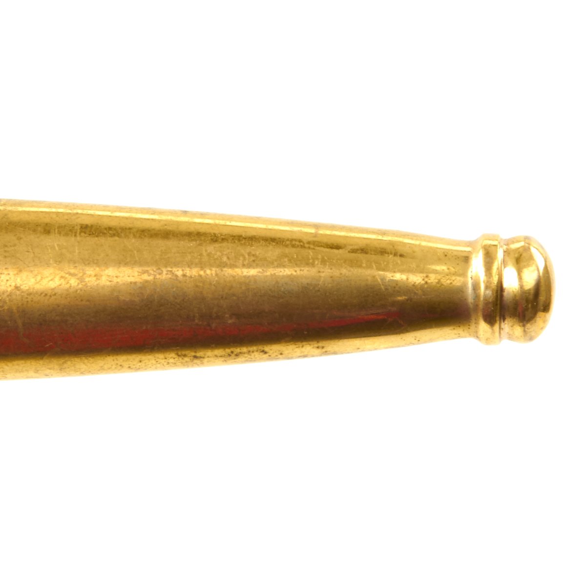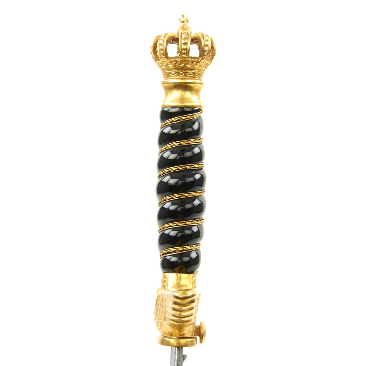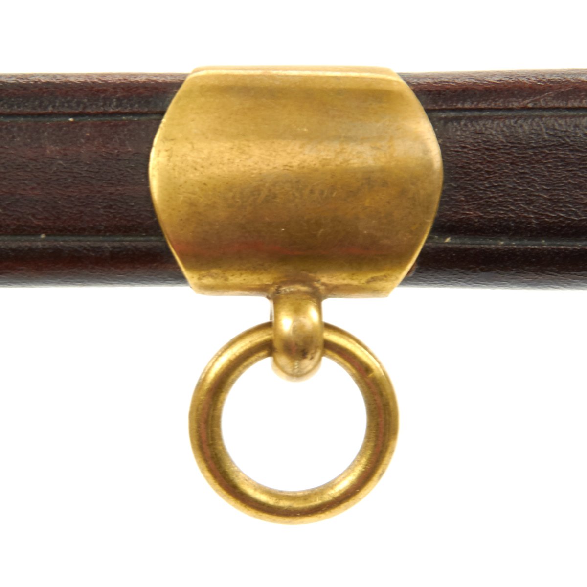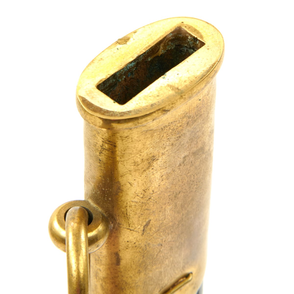 The dagger features a beautiful black diagonally angled ribbed grip with double twisted brass wire wrap. The handsome gilt pommel is in form of the Dutch Royal Crown with negative space. The gilded crossguard is in the form of a flying gull. The dagger is complete with the original matched black leather scabbard with gilt fittings. The scabbard retains an operational release button on the reverse side of the cross guard.