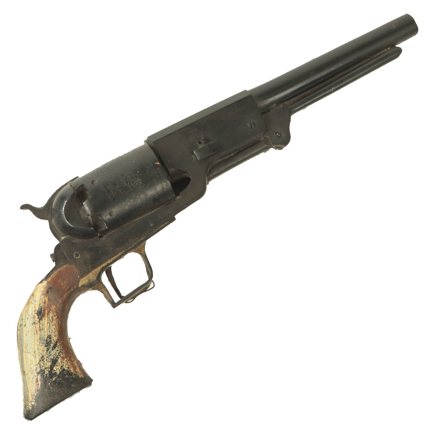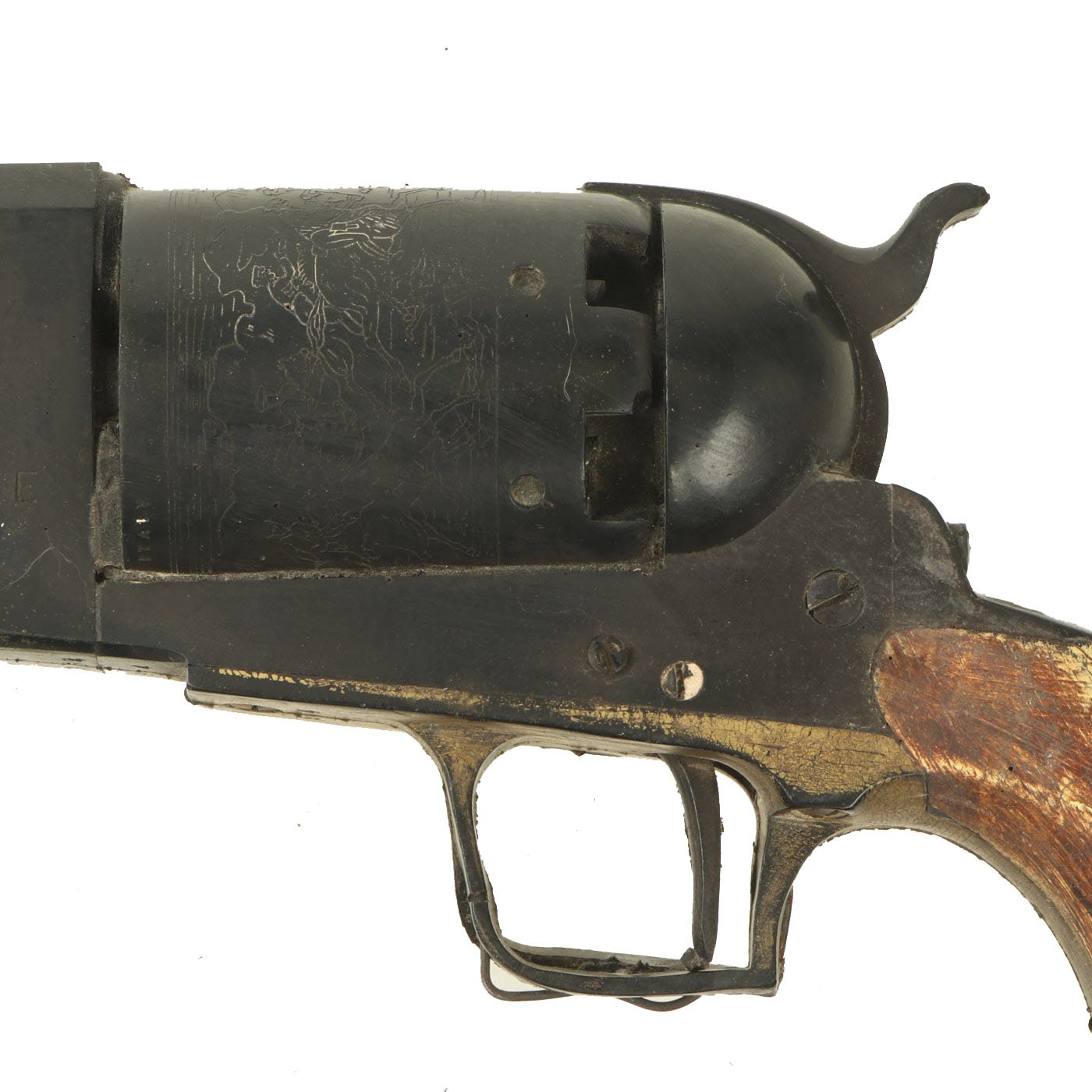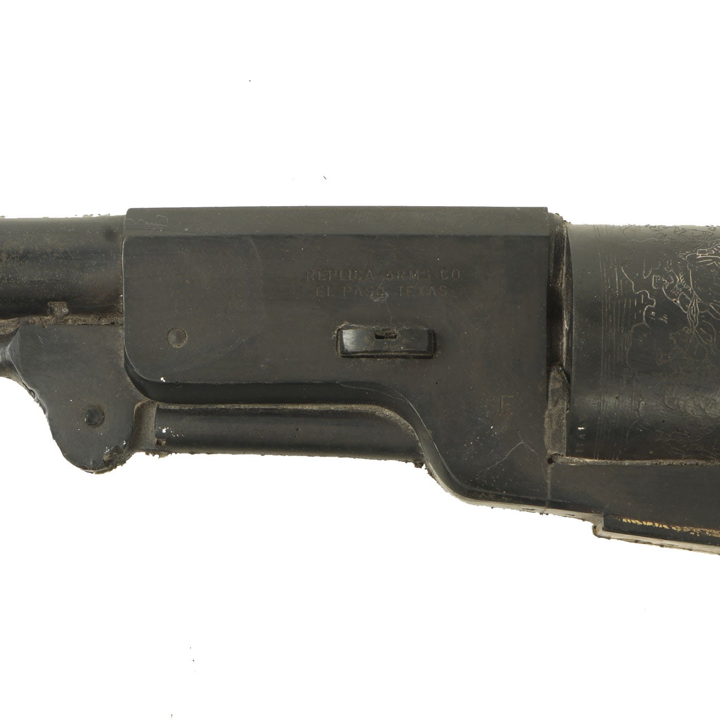The rubber casting was made from a replica Colt Walker sold by the Replica Arms Co. which was originally located in El Paso, TX in the 1960s. They imported high quality Italian made replicas. This makes sense as finding an Original Colt Walker for the rubber casting would have been difficult, and is why this rubber prop is marked "Made in Italy" and "Replica Arms Co. El Paso, TX". This all rubber example was acquired from the Ellis Props and Graphics liquidation auction. Ellis was the oldest and the largest Prop House in California until its liquidation auctions in late 1999 and early 2000.