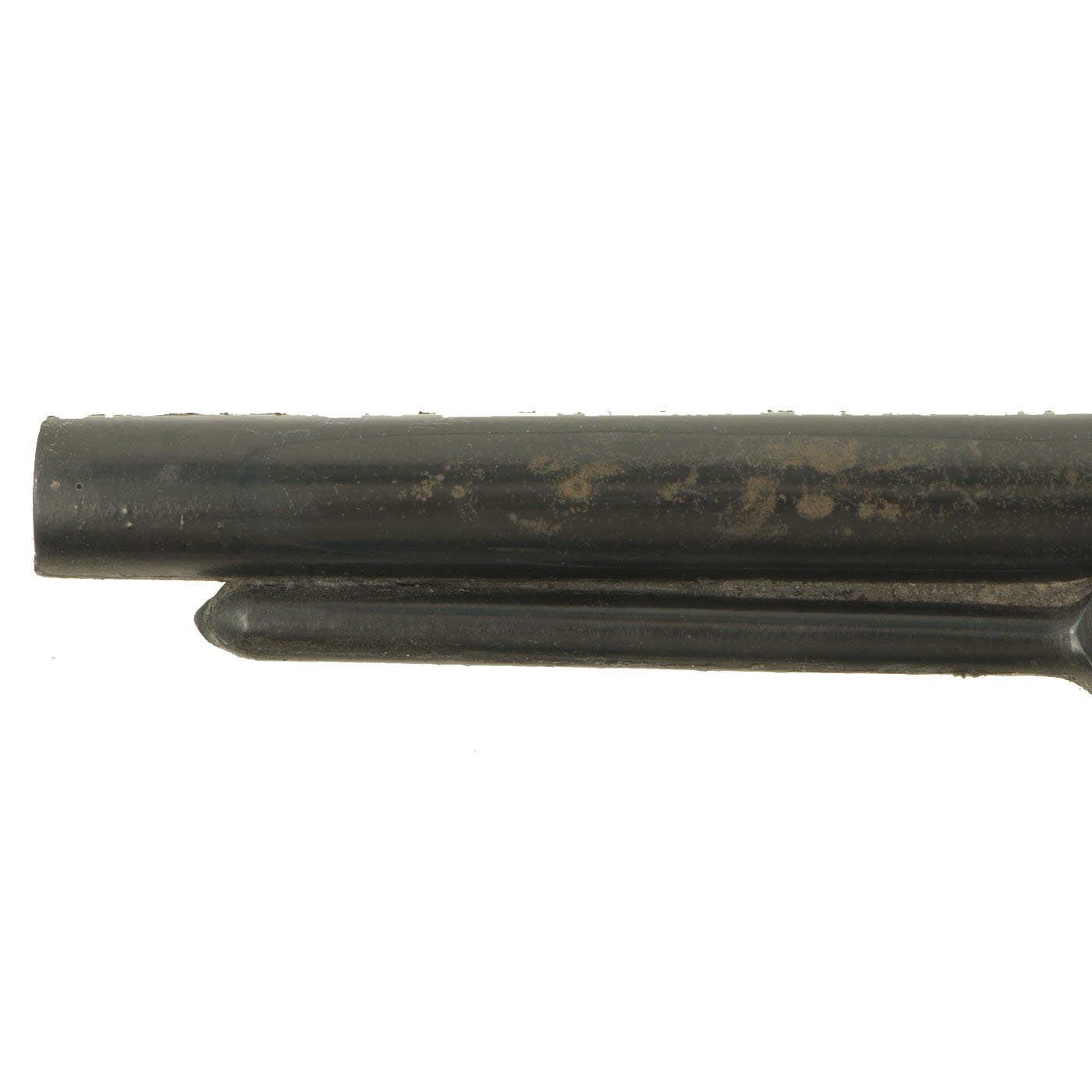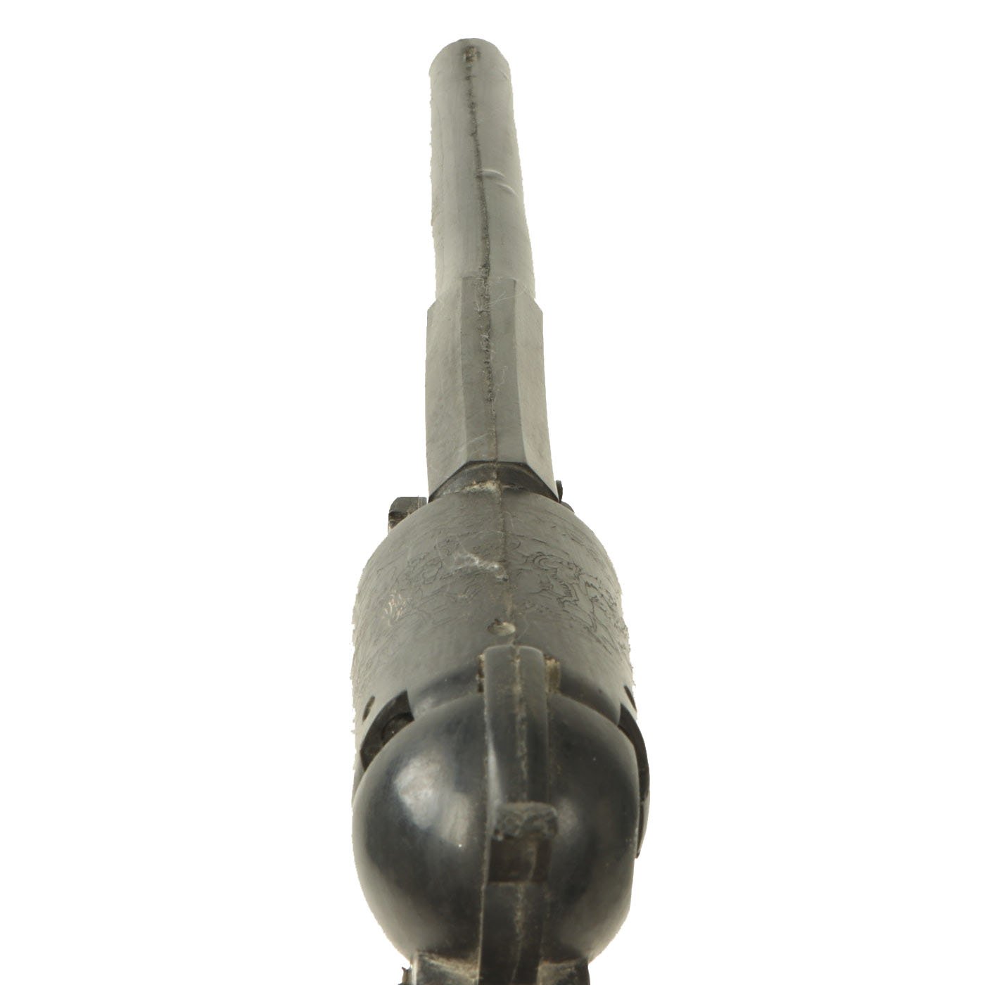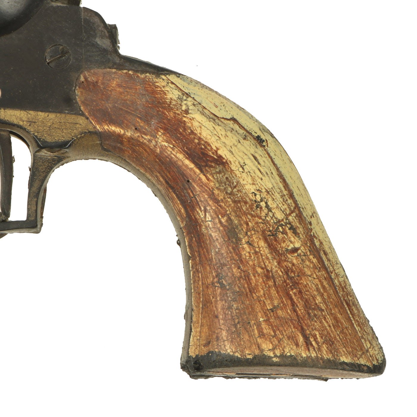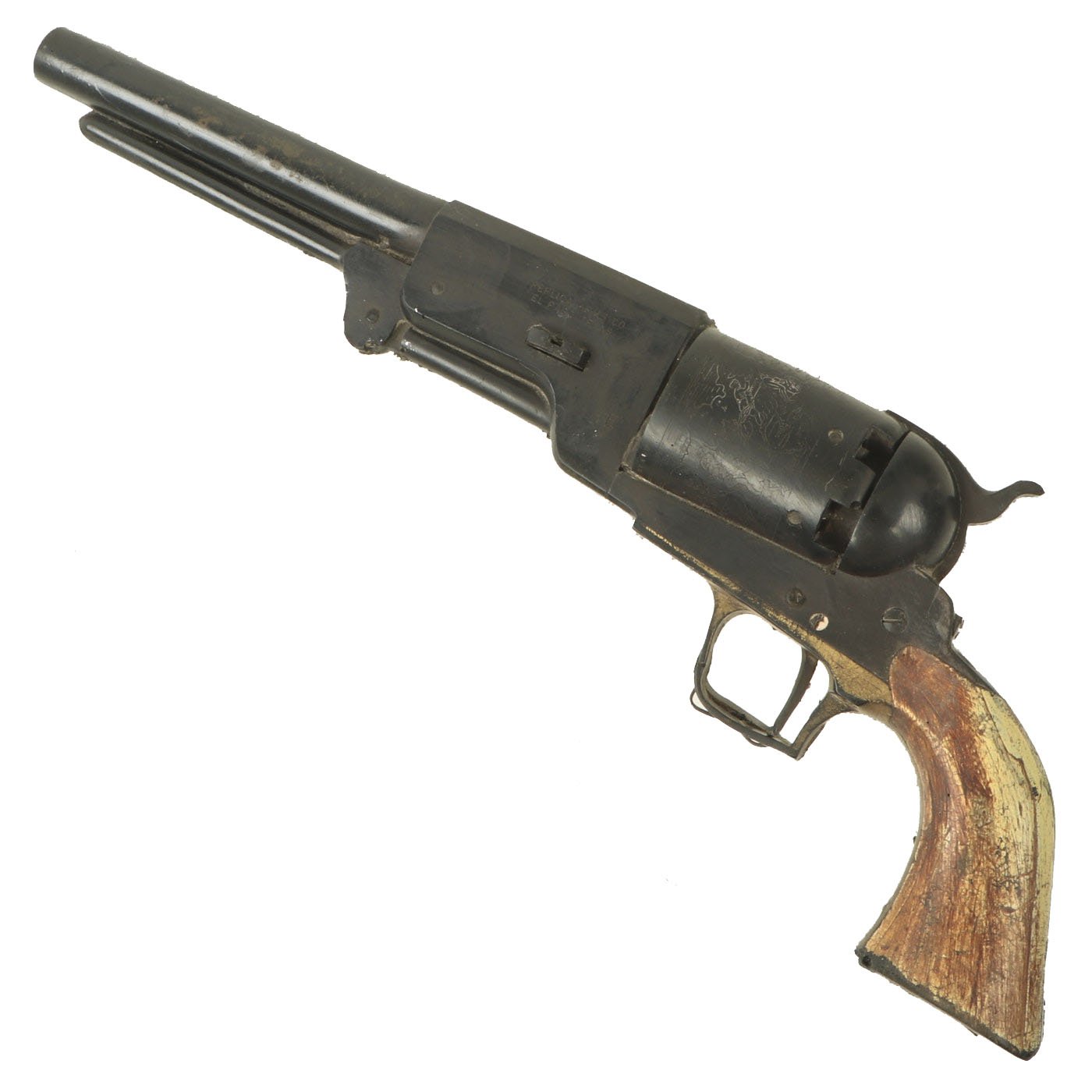 The rubber casting was made from a replica Colt Walker sold by the Replica Arms Co. which was originally located in El Paso, TX in the 1960s. They imported high quality Italian made replicas. This makes sense as finding an Original Colt Walker for the rubber casting would have been difficult, and is why this rubber prop is marked "Made in Italy" and "Replica Arms Co. El Paso, TX". This all rubber example was acquired from the Ellis Props and Graphics liquidation auction. Ellis was the oldest and the largest Prop House in California until its liquidation auctions in late 1999 and early 2000.